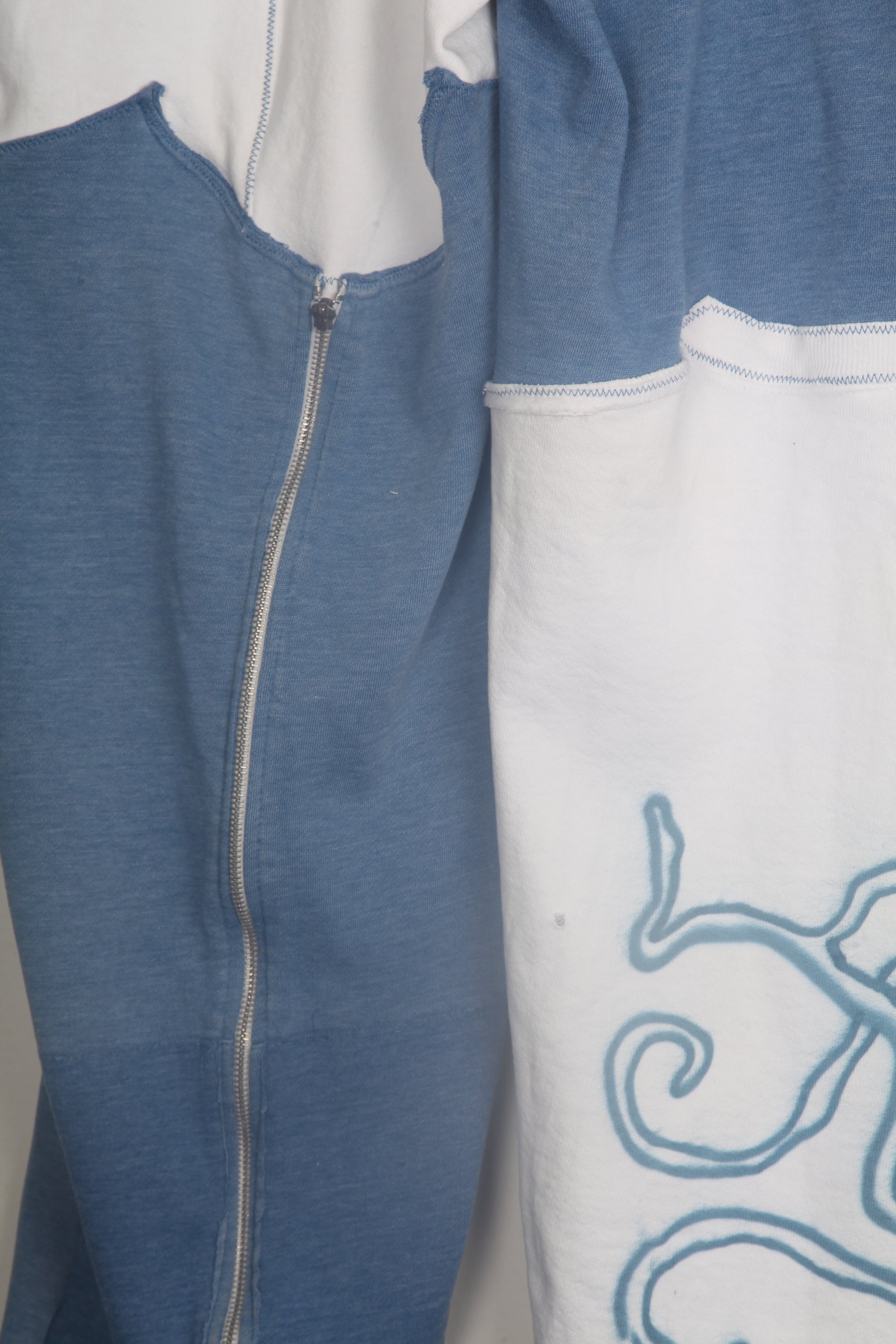 Sustainably made using second hand sweatshirt jersey fabrics, patchwork tracksuit joggers in blue and white colour scheme with airbrush designs. Zip from original jumper incorporated into trousers. Elastic waistband with drawstring for adjustable waist size, and handy pockets.