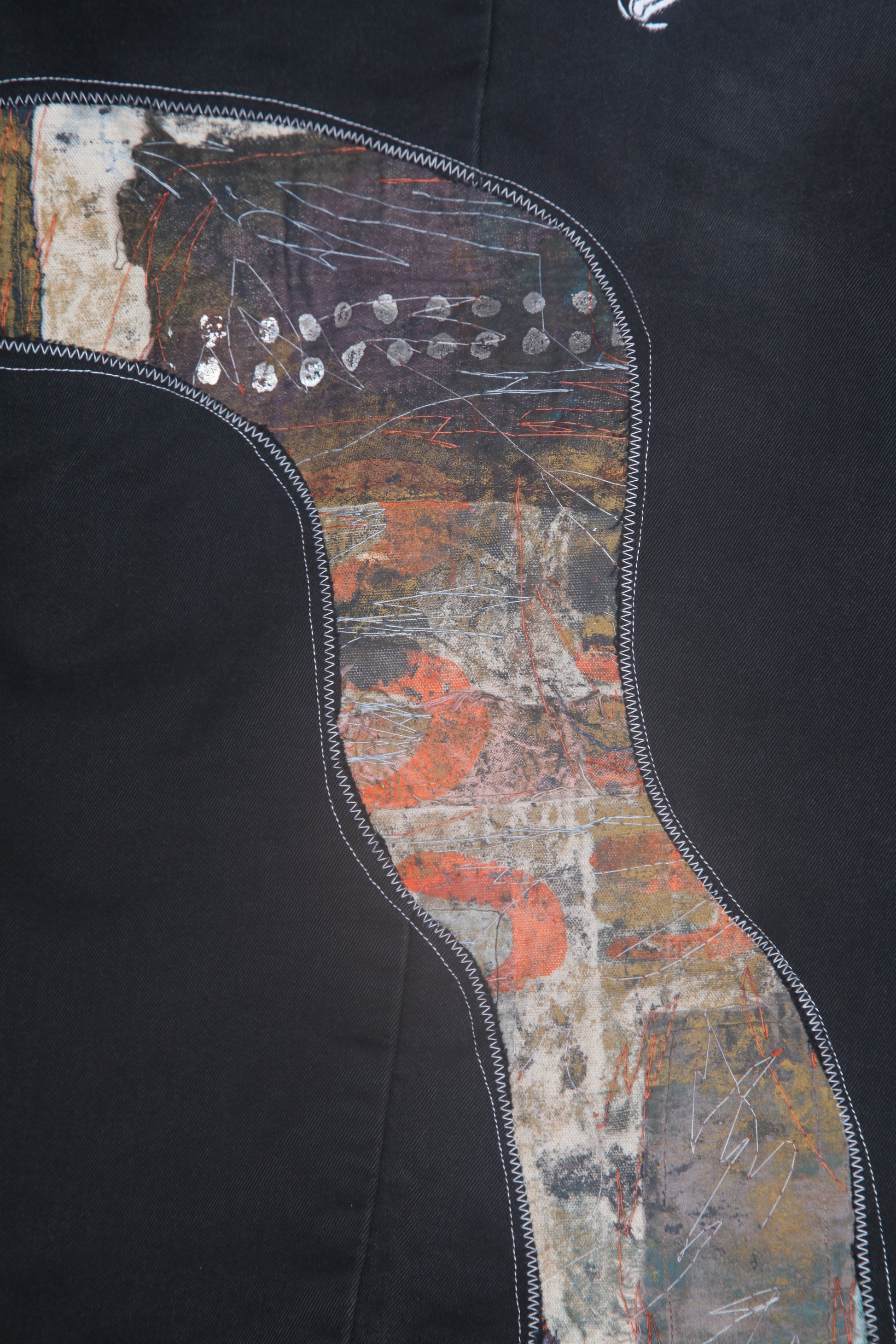 A mixed media creation using embroidery, printing, patchwork, appliqué. Constructed with second hand materials only including denim, corduroy, cotton, linen. Lined with shirt fabric for extra warmth. Wearable piece of art.