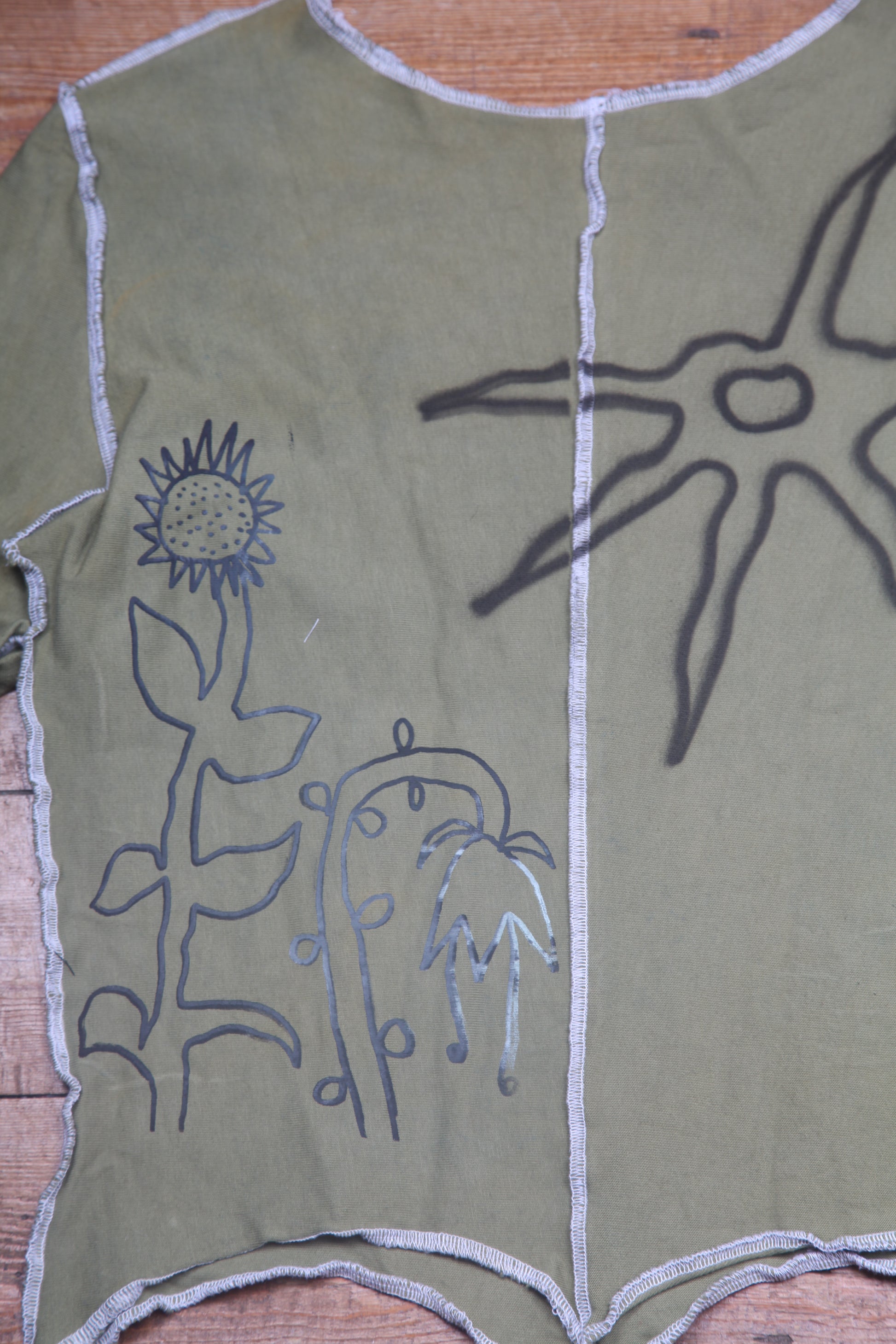 1of1 Handmade using second hand materials, fitted and slightly cropped long sleeve baby tee. Khaki with freehand airbrush and graphic screen-print designs.