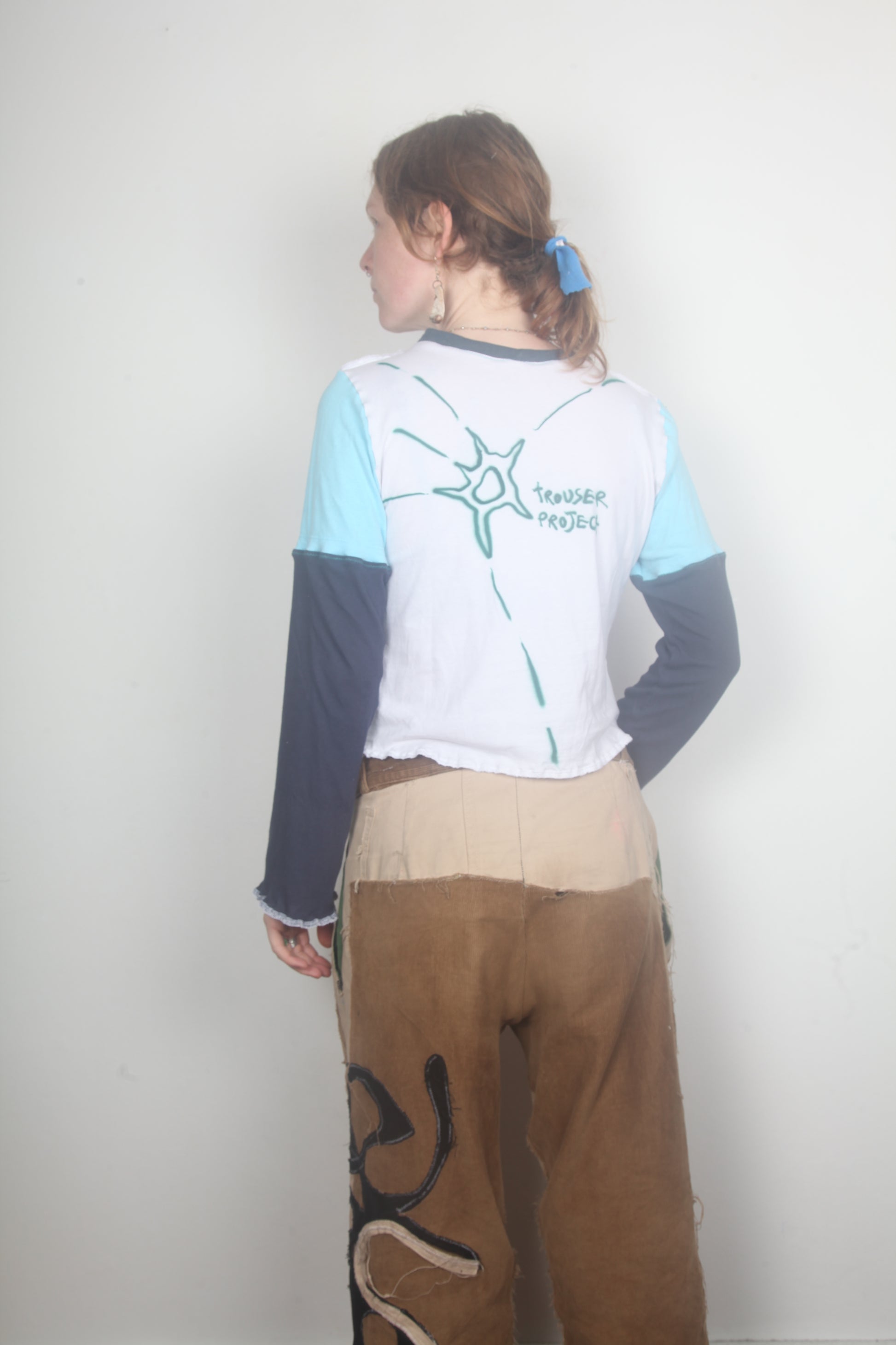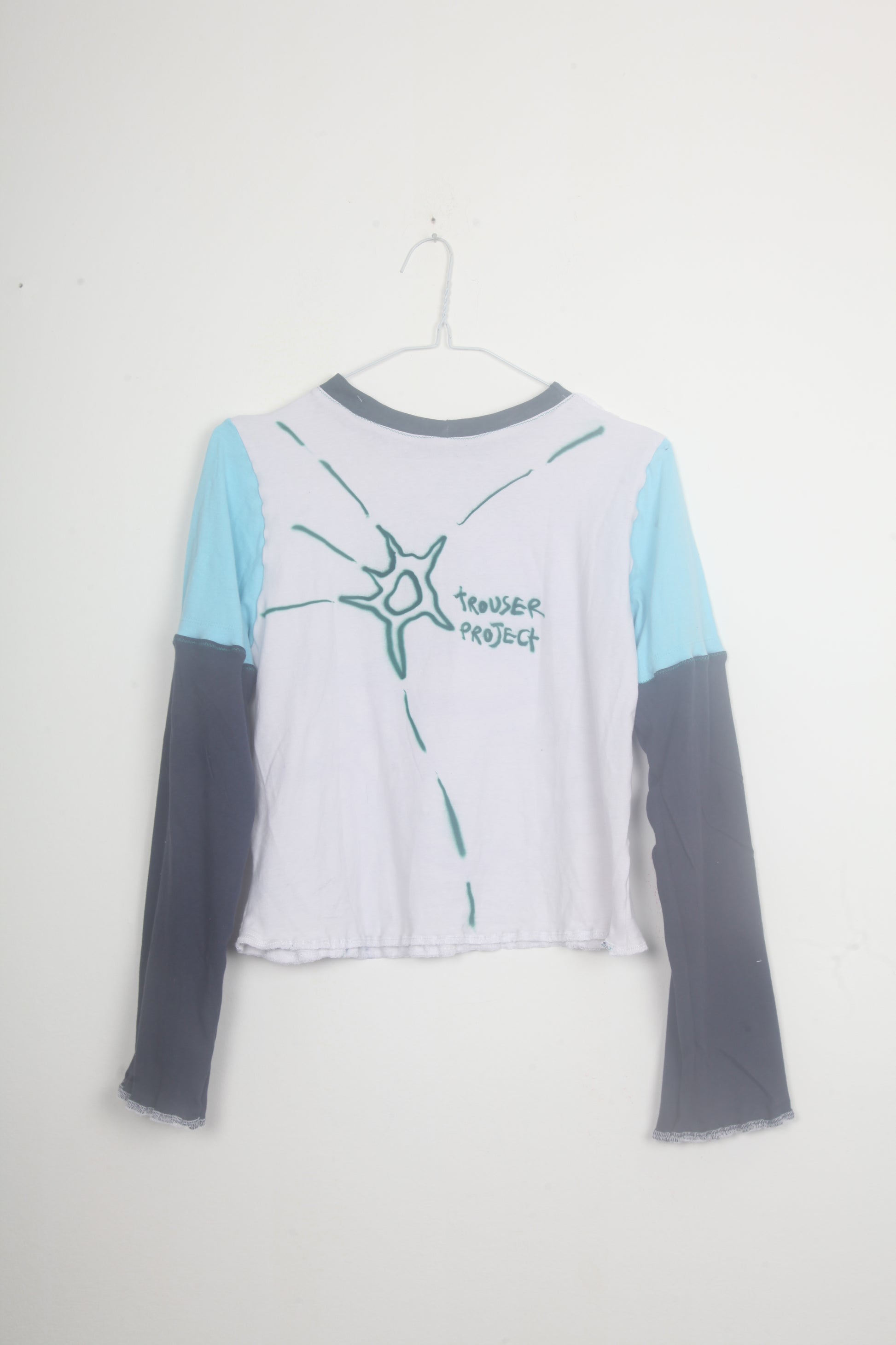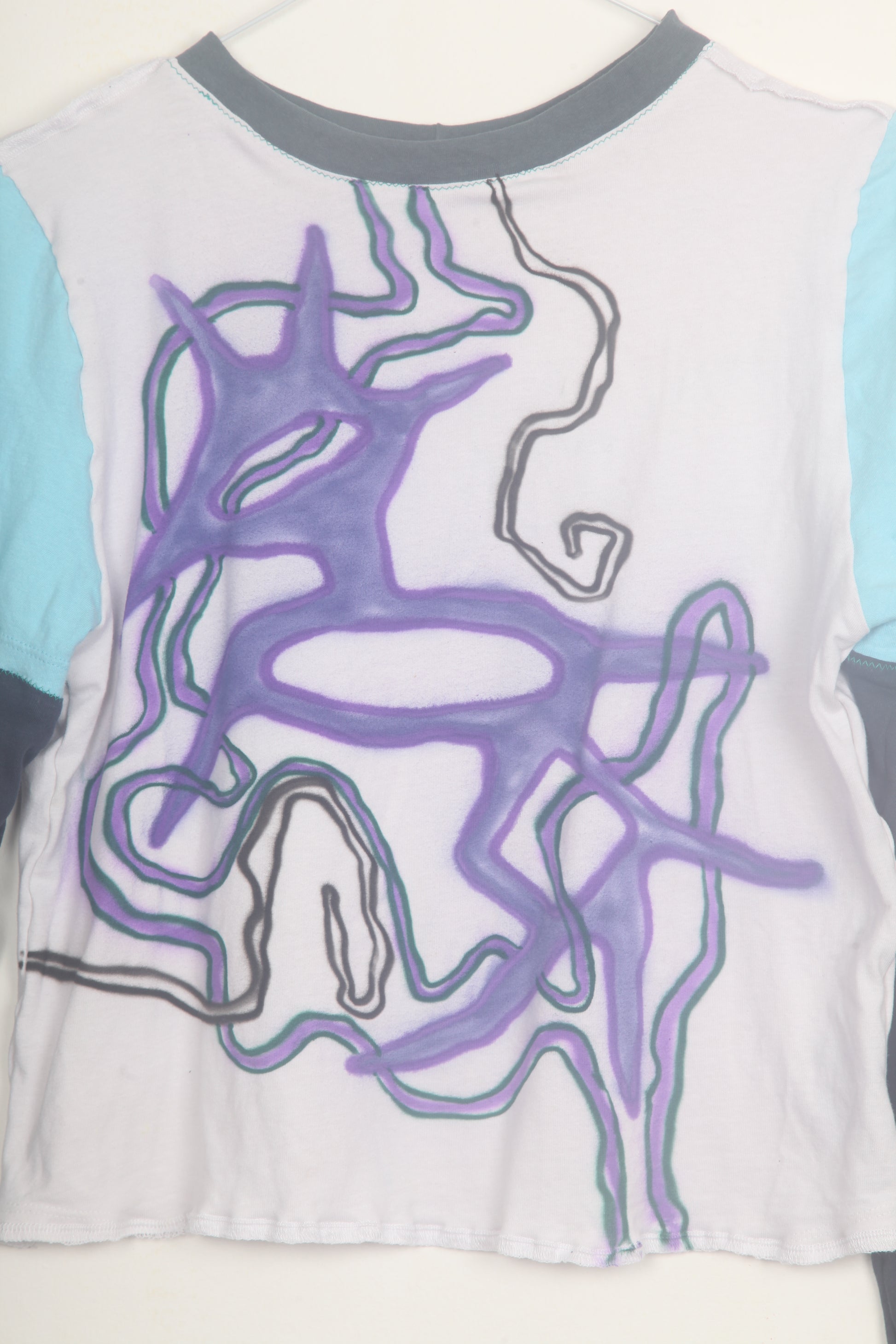 Long sleeve baby tee made from second hand fabrics. White, blue, purple with airbrush designs, to sustainably create a 1of1 item.