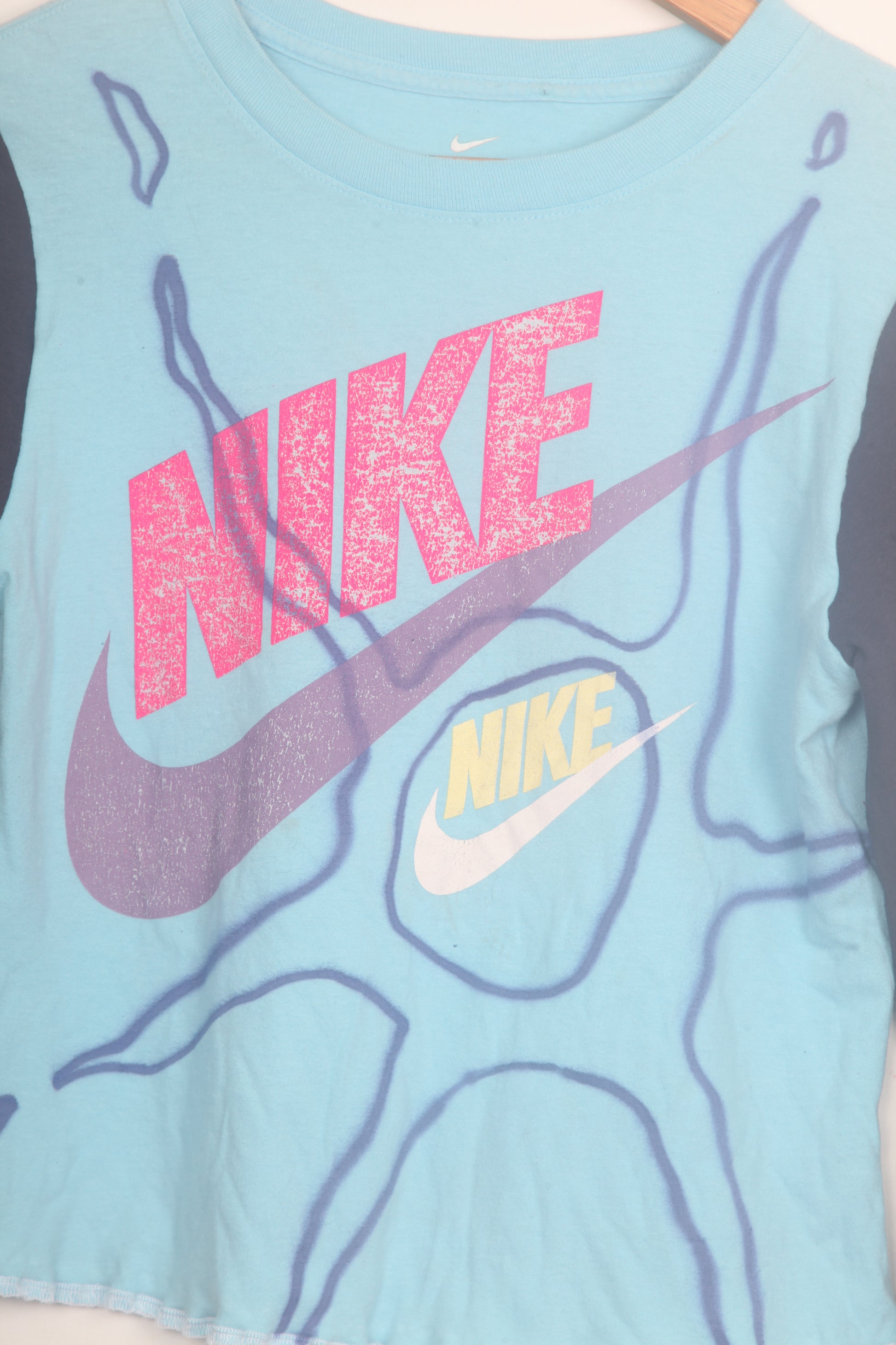 Long sleeve baby tee made from second hand fabrics. Blue reworked Nike with airbrush designs, to sustainably create a 1of1 item.