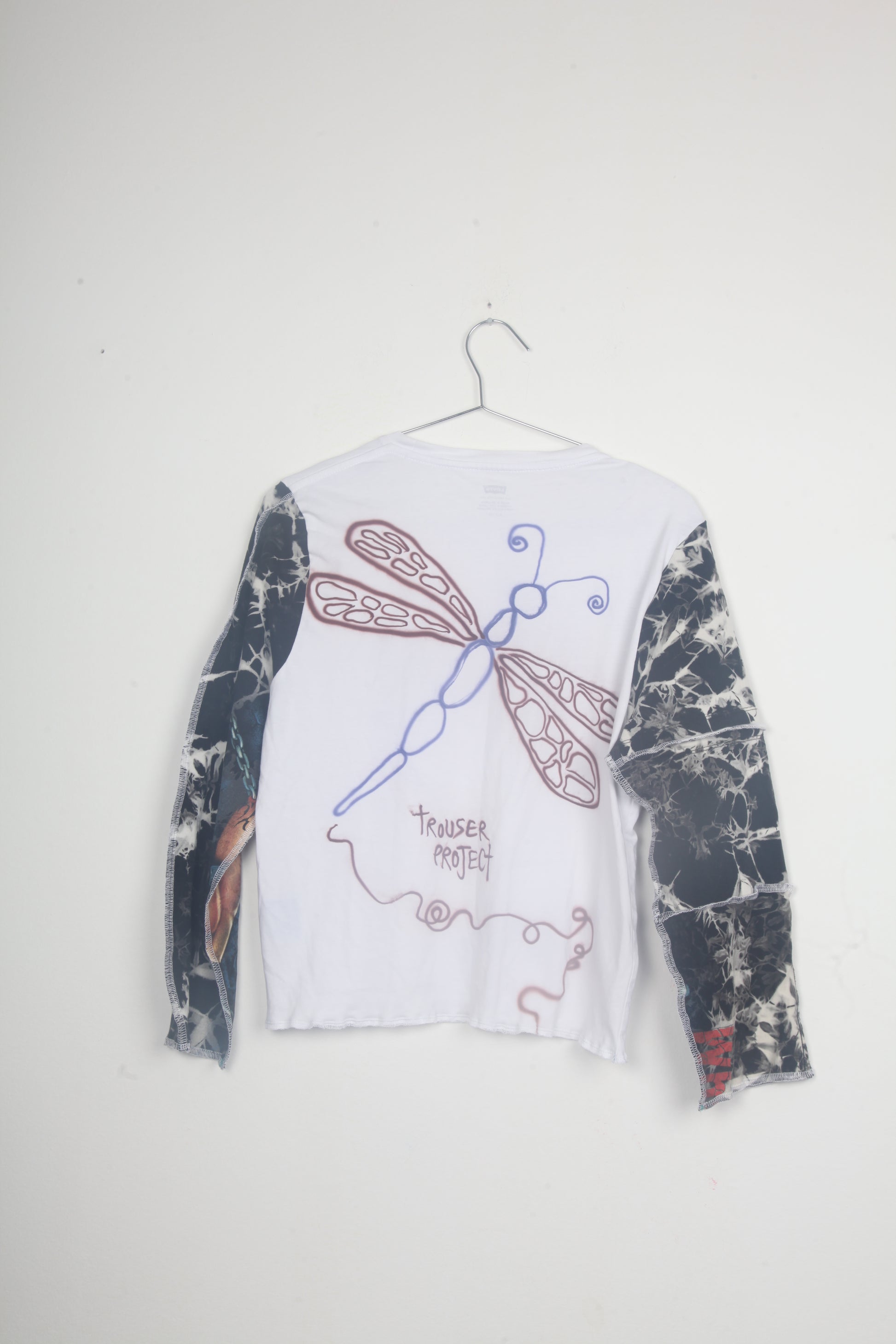 Long sleeve baby tee made from second hand fabrics. Made using black, white patchwork with airbrush and screen-print designs, to sustainably create a 1of1 item.