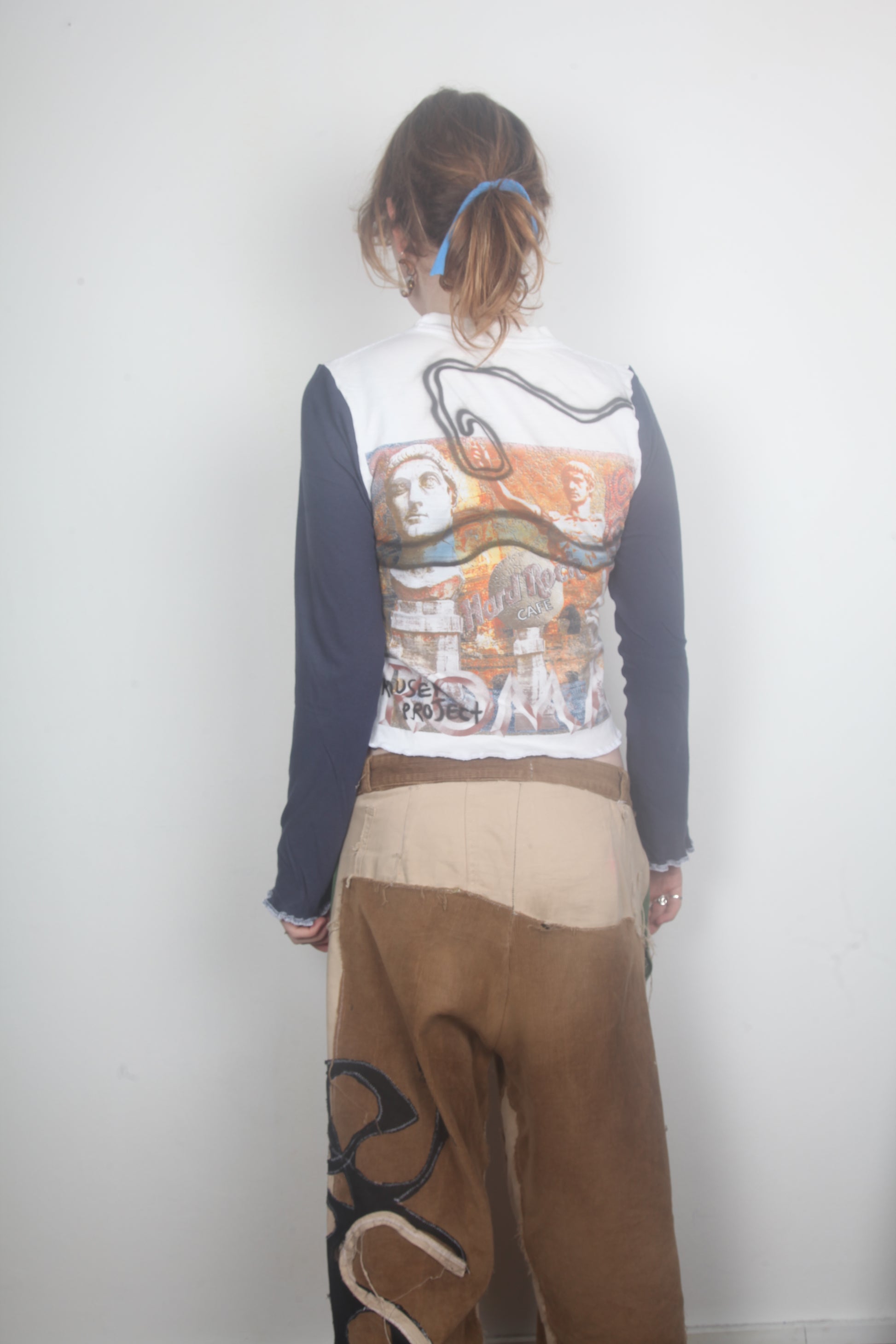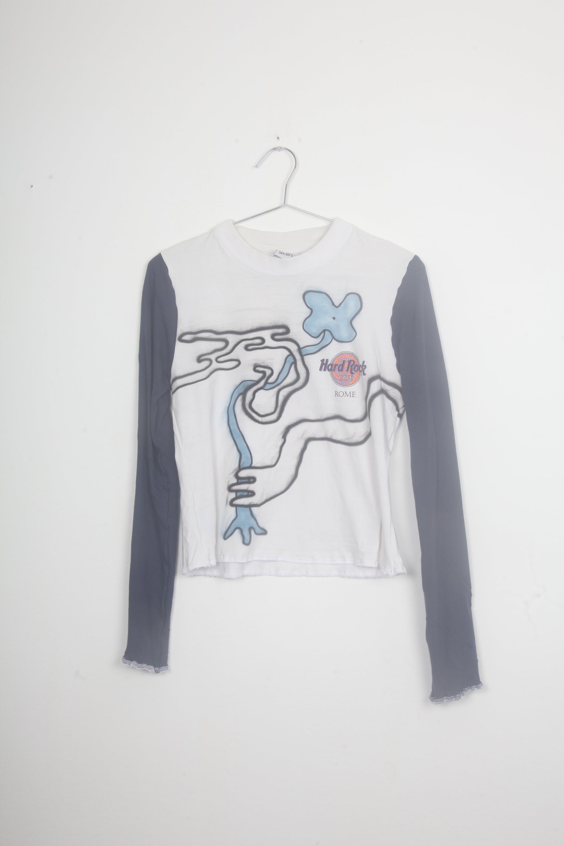 Long sleeve baby tee made from second hand fabrics. White and navy with airbrush designs, to sustainably create a 1of1 item.