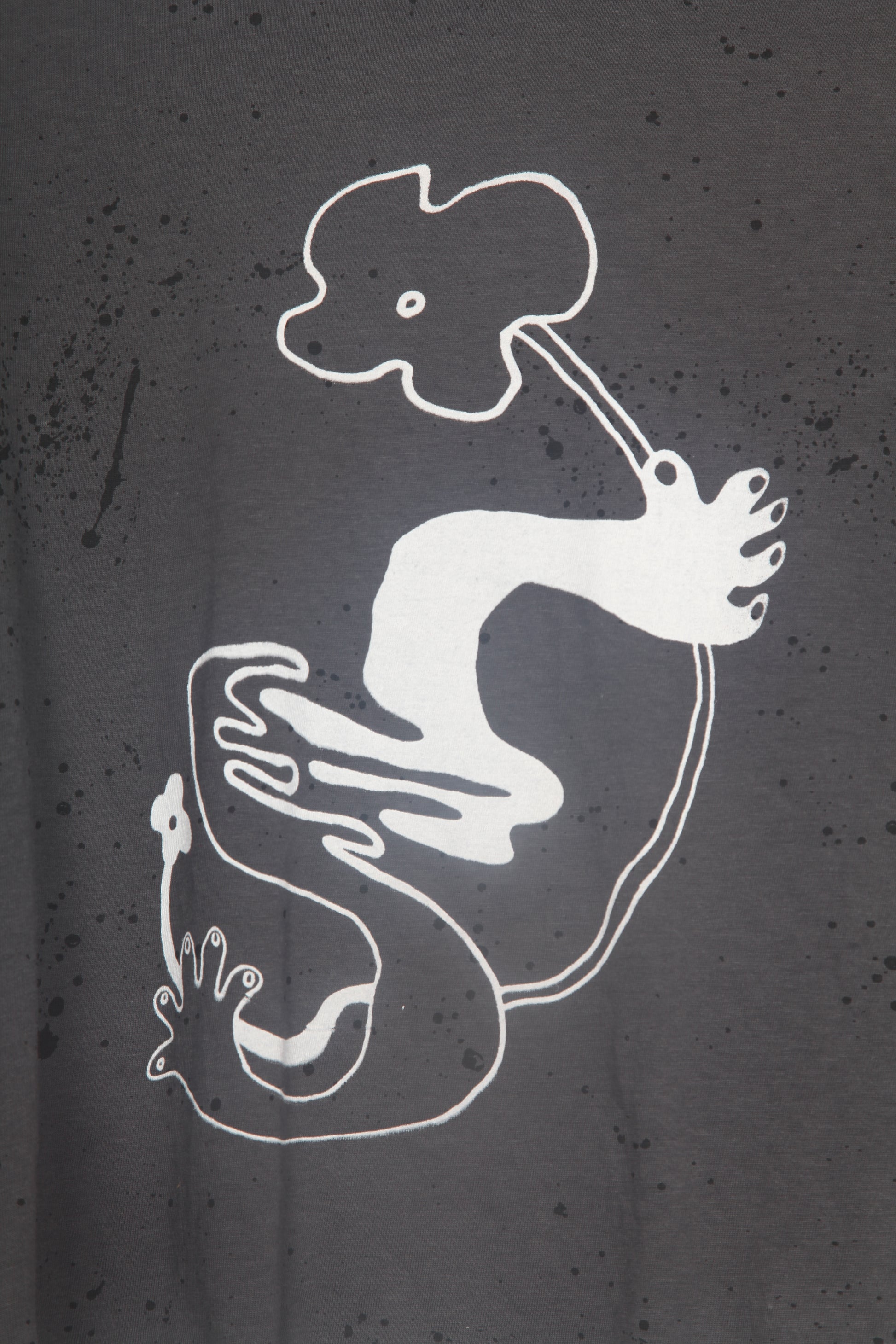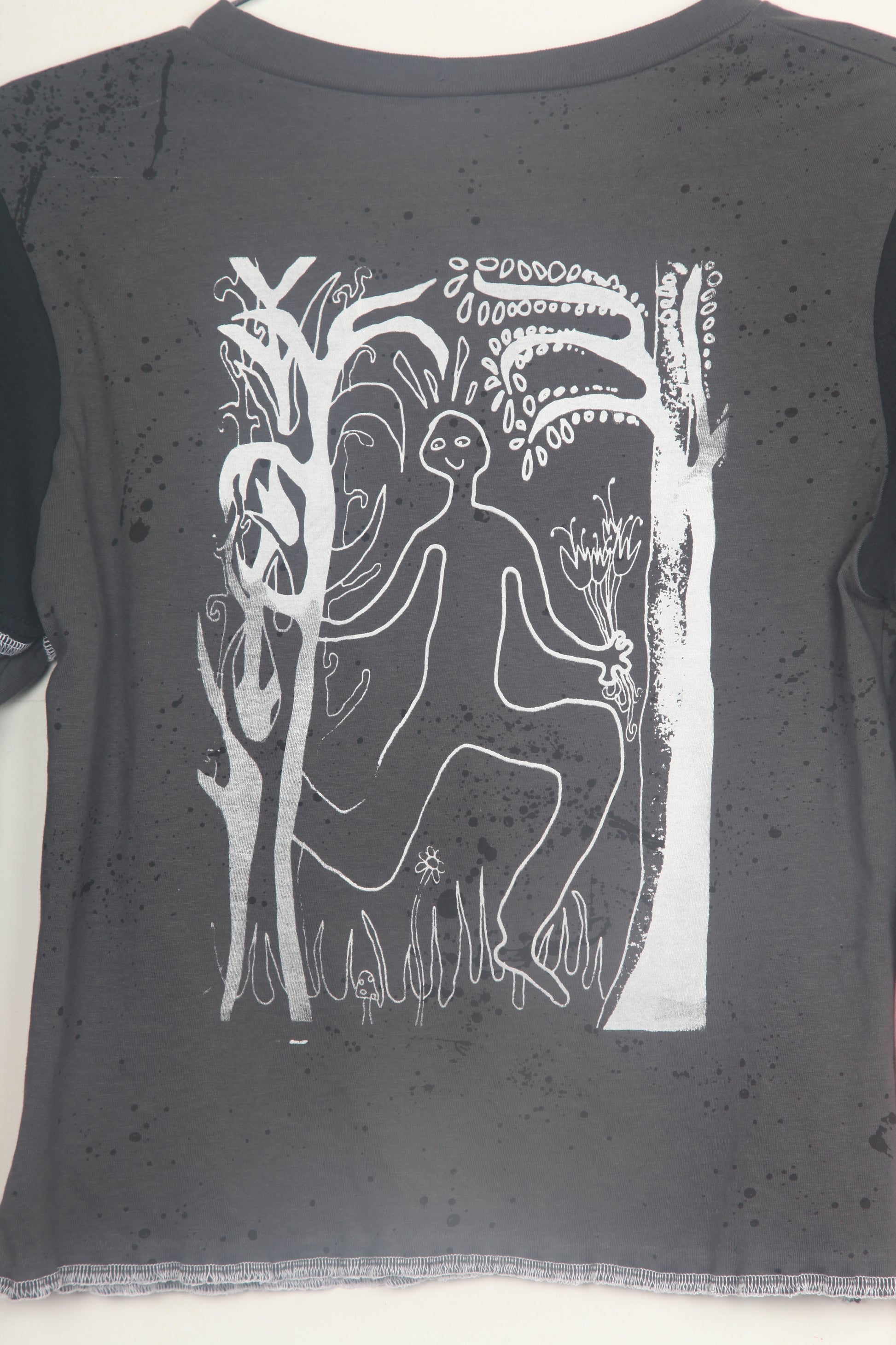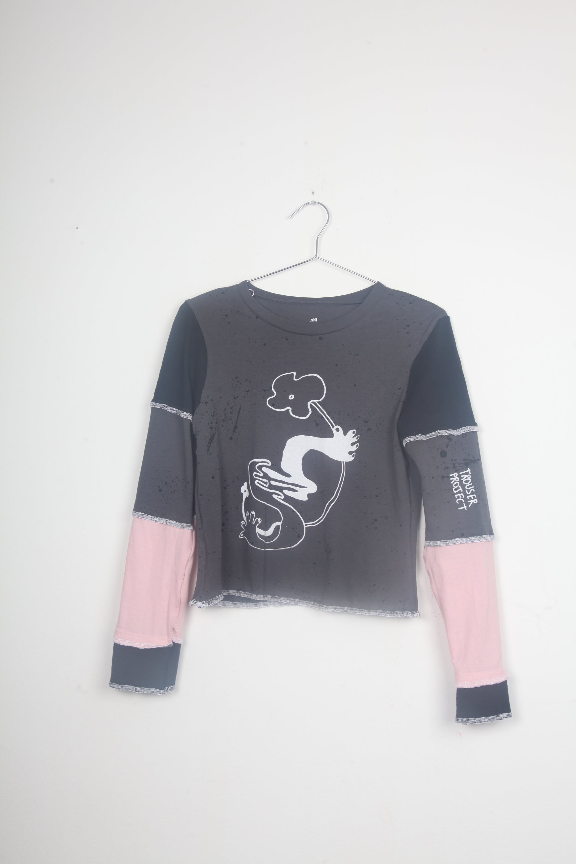 Long sleeve baby tee made from second hand fabrics. Made using grey/ pink patchwork with airbrush and screen-print designs, to sustainably create a 1of1 item.