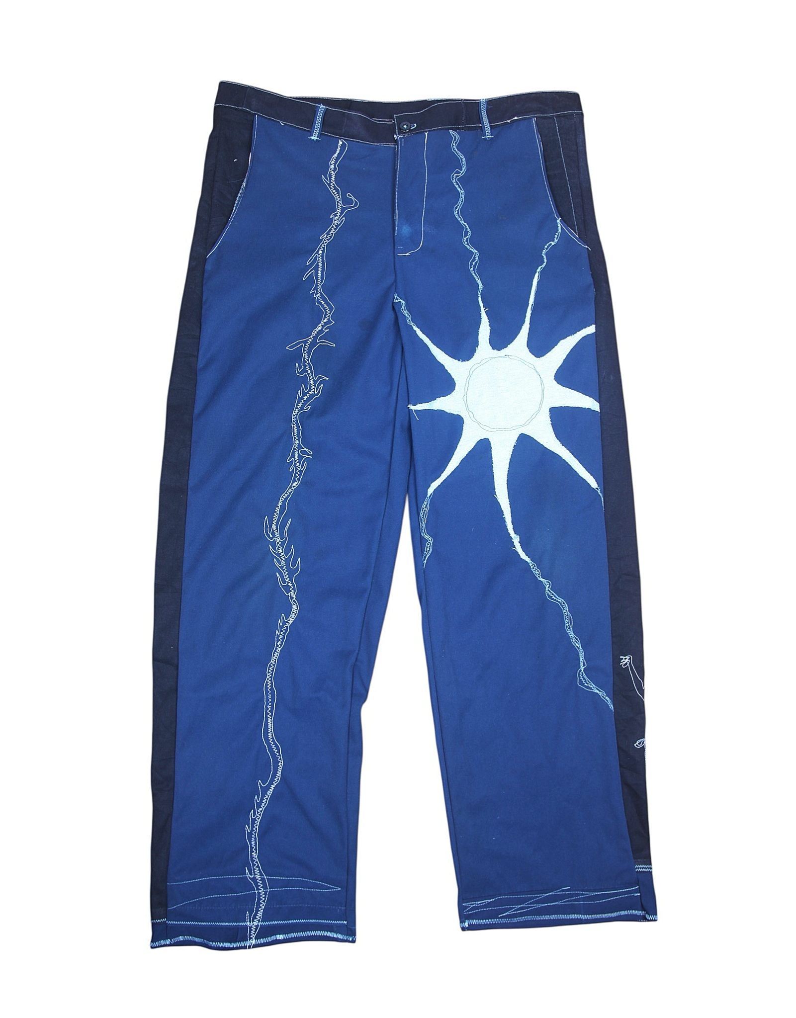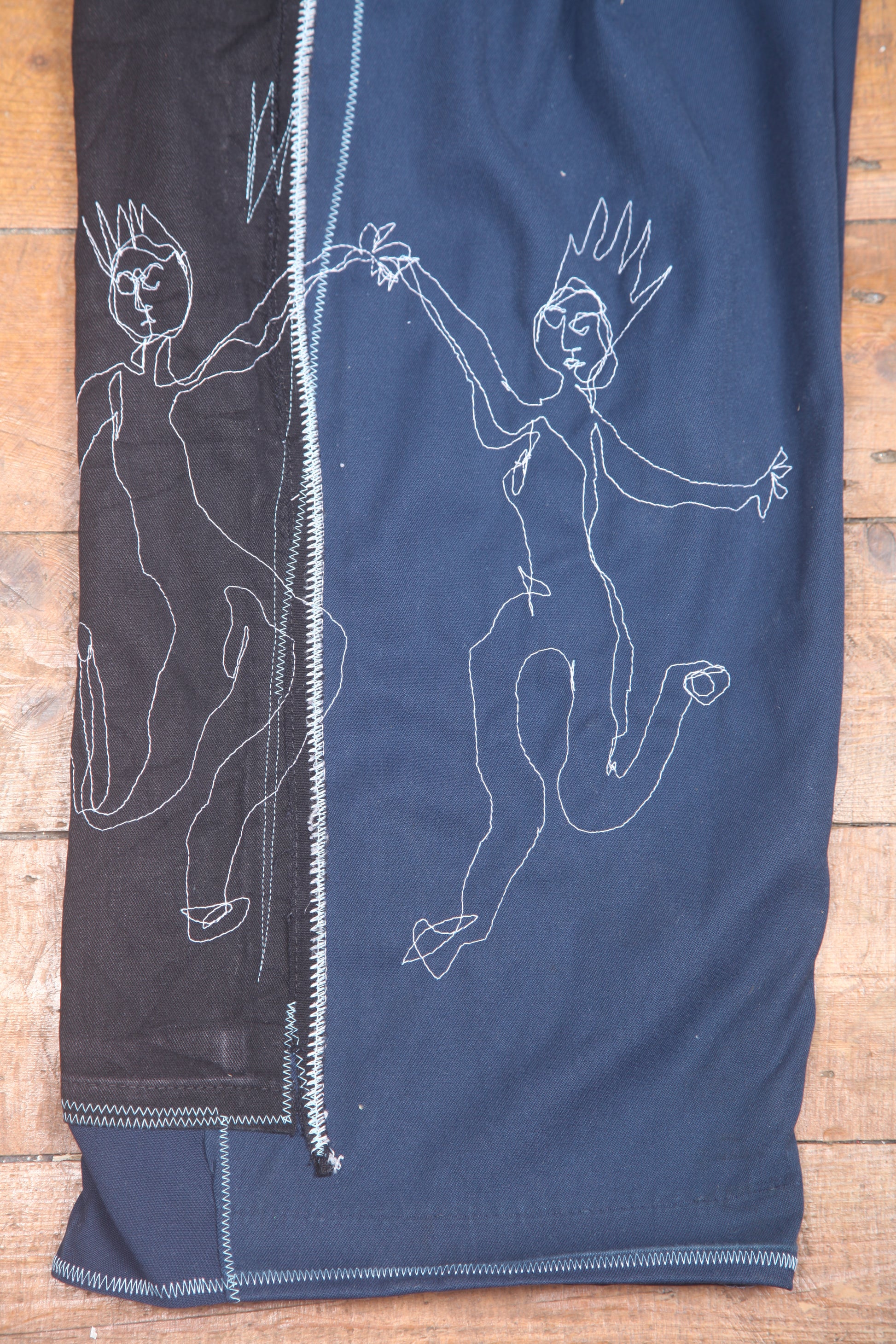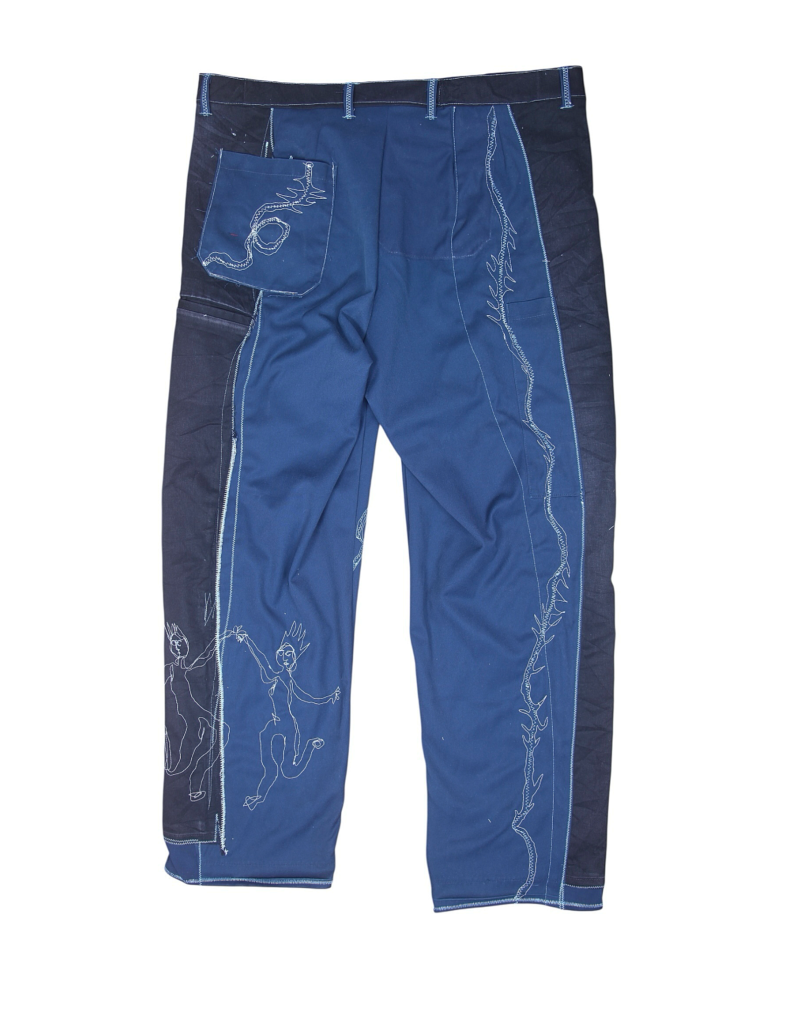 Constructed sustainably using second hand boiler suit fabric. Baggy cargo trousers with fly zipper, belt loops, pockets. One of a kind piece with embroidered details.