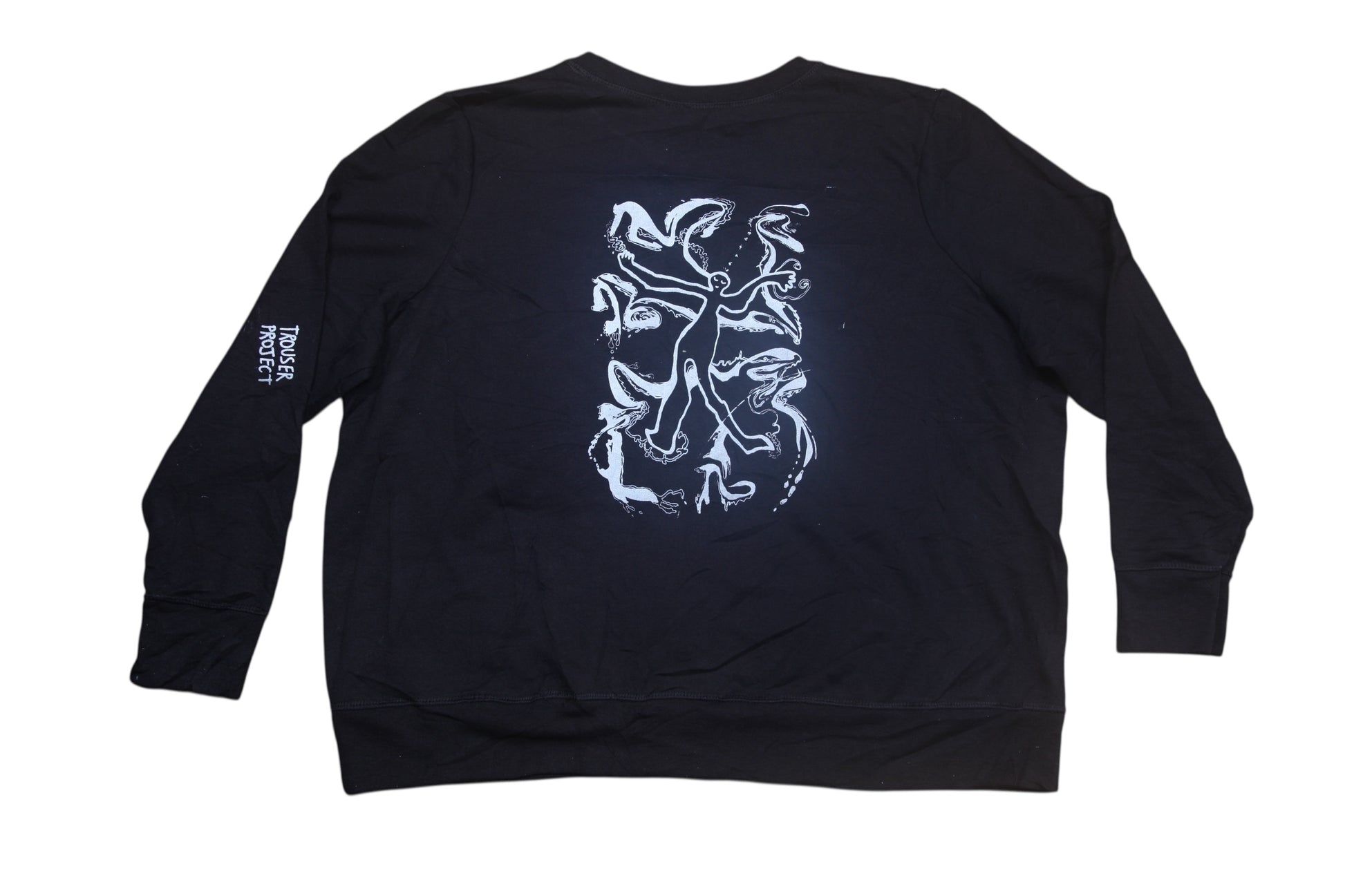 1of1 Pre-loved black pullover jumper upcycled with graphic screen-print designs and appliqué work. Super comfy and warm.