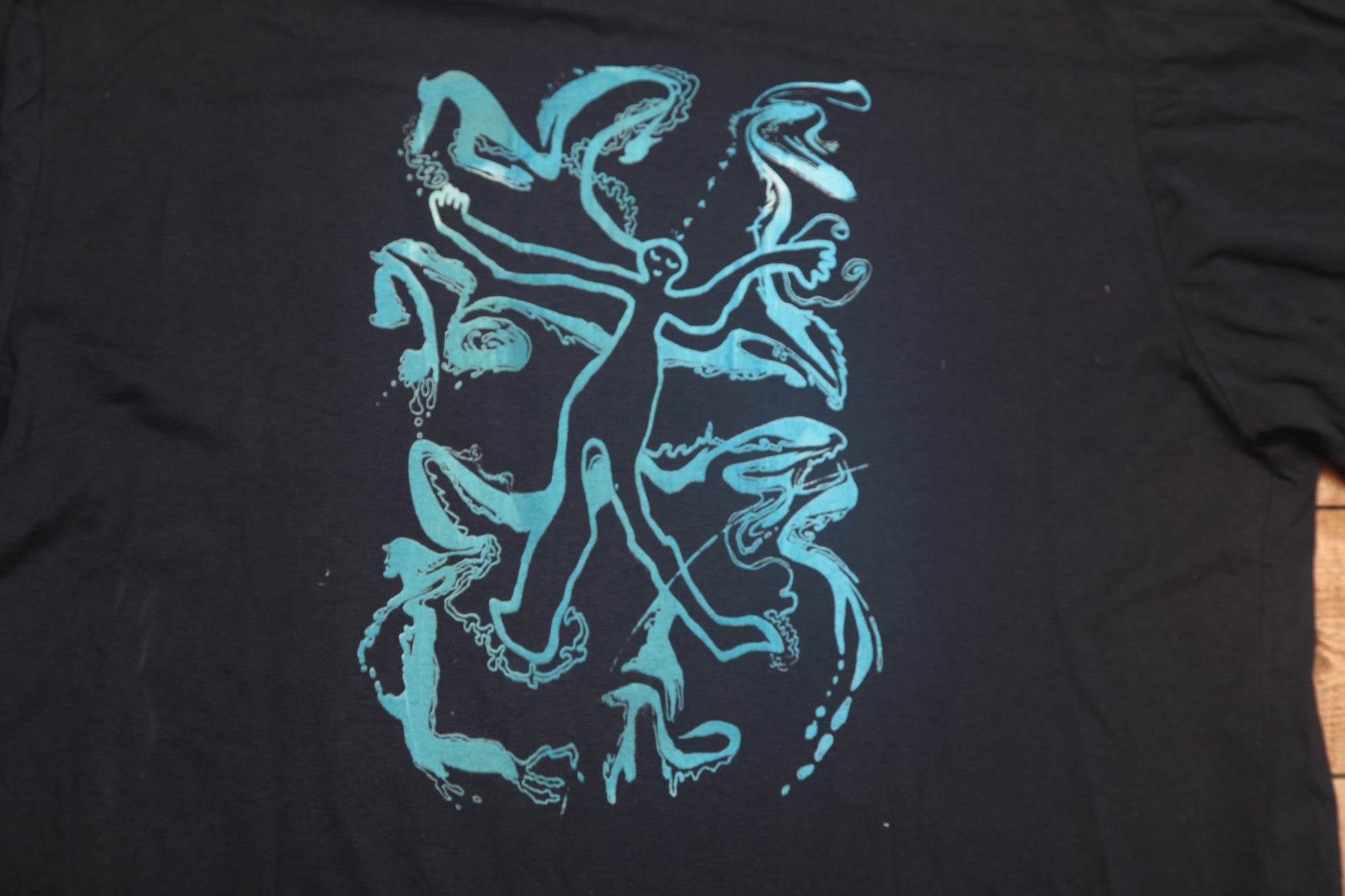 Pre-loved navy T-Shirt upcycled with graphic screen-print designs. 1of1 item.