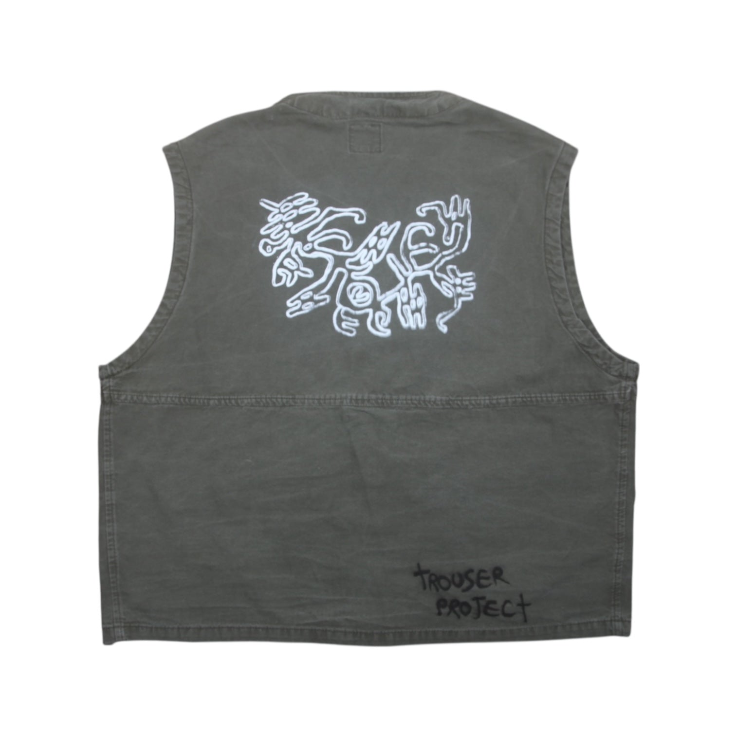 Pre-loved khaki zip up vest with functional pockets and zip details. Hand printed with butterfly design making a 1of1 sustainable item.