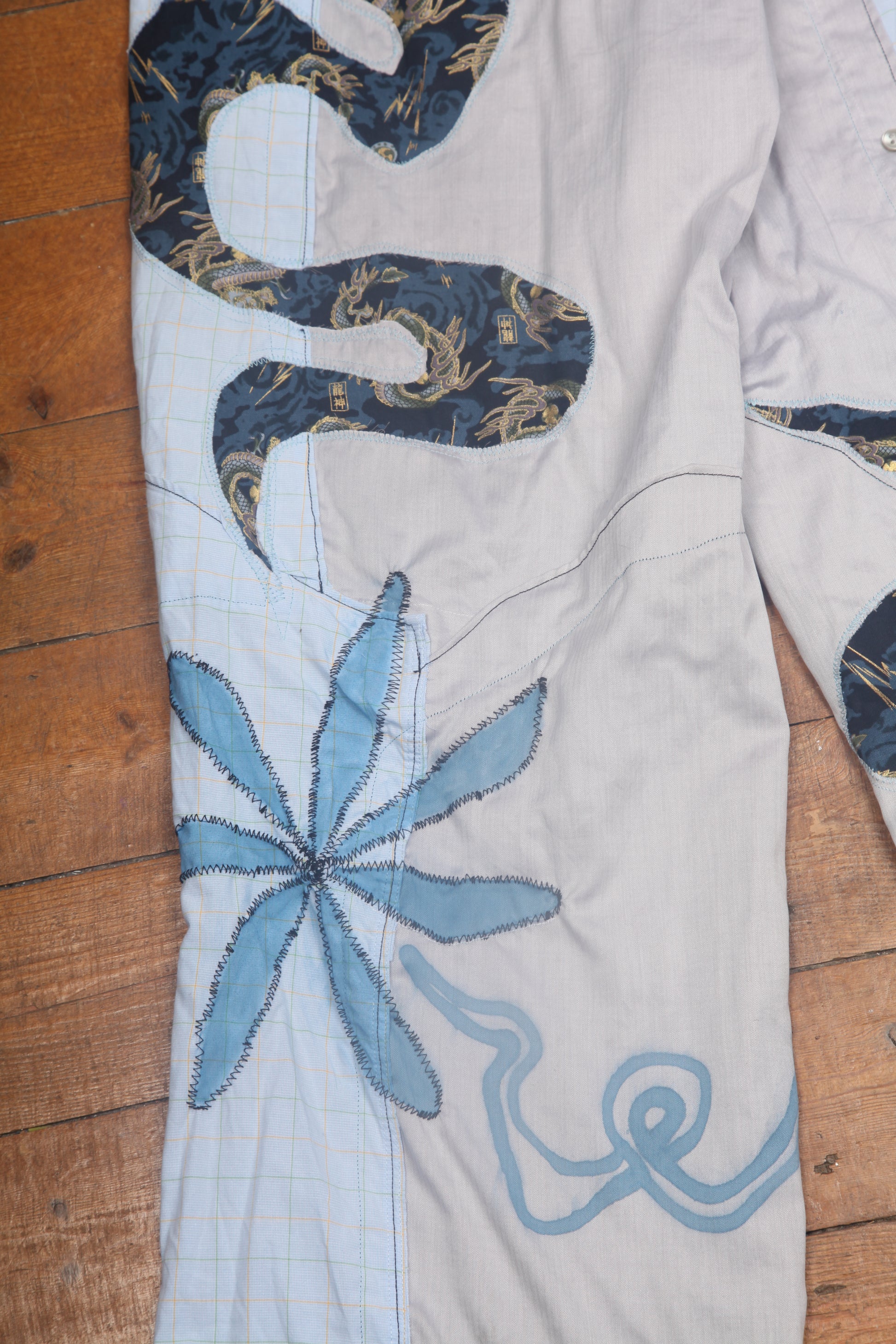 Hand crafted using second hand shirt fabrics, lightweight jogger style trousers with elastic waistband, adjustable drawstring and side pockets. Unique appliqué, airbrush and embroidered designs. Super comfy to wear casually, can also be styled up to wear in a more smart setting.