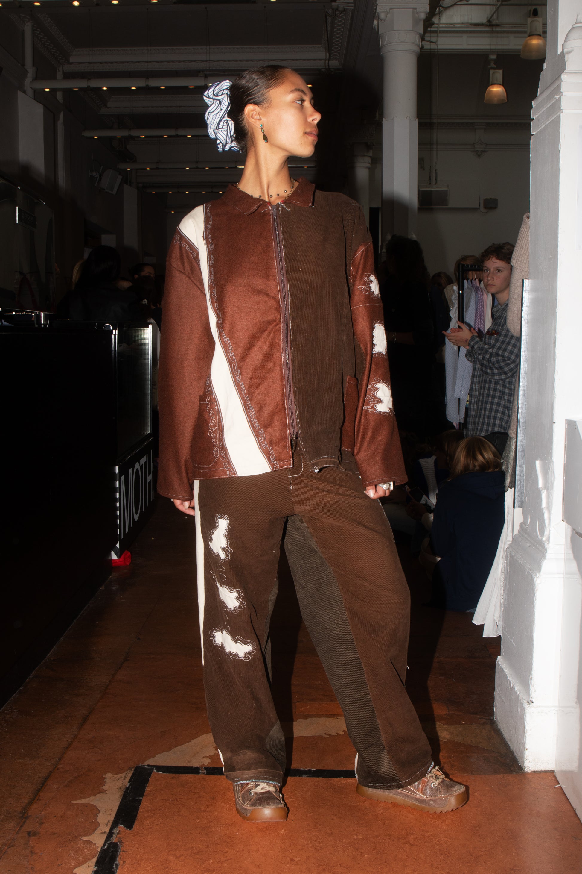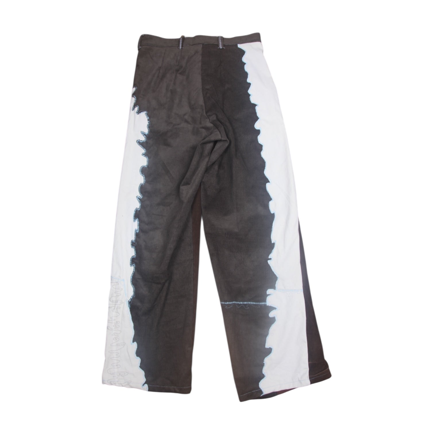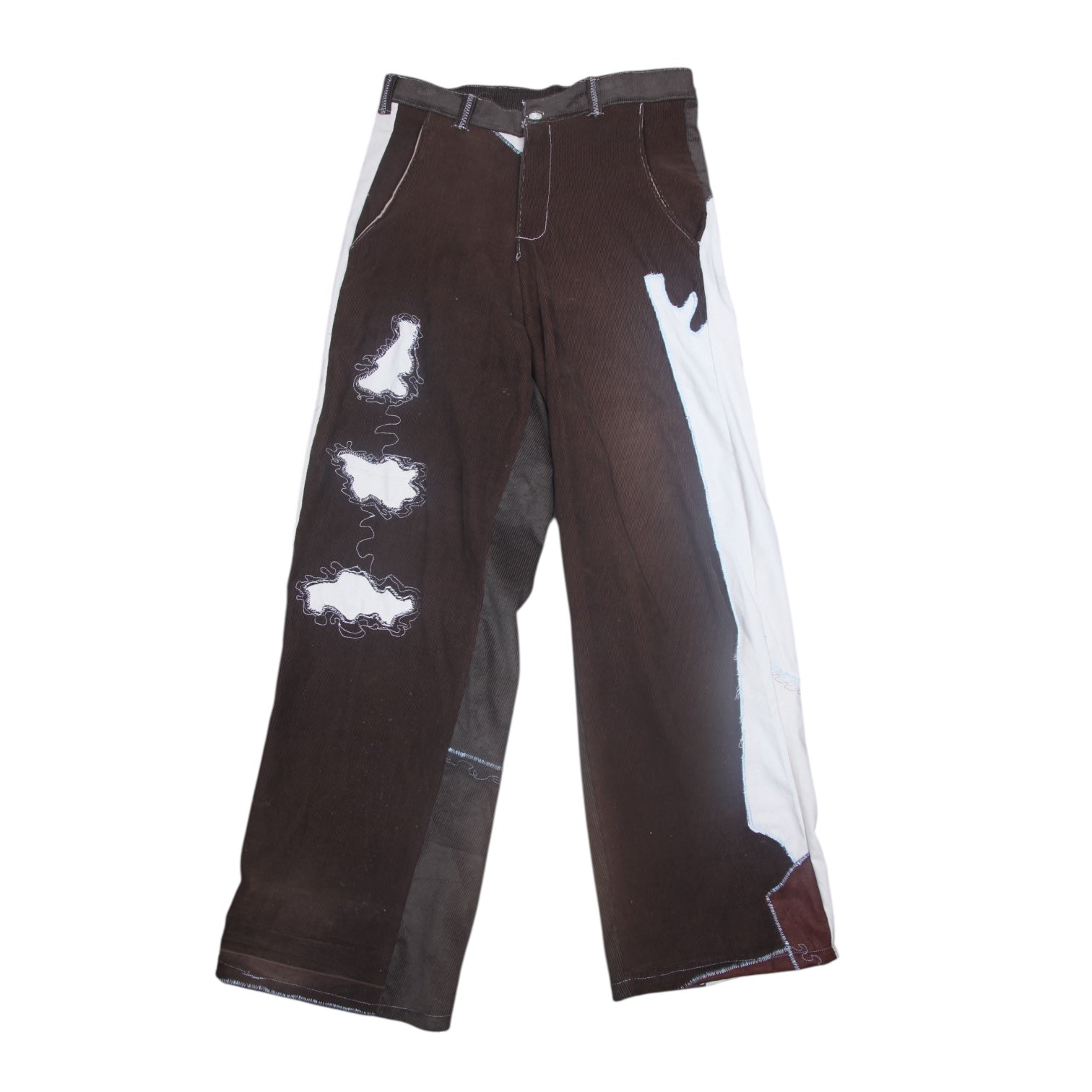 Hand crafted using second hand corduroy brown fabrics, cargo style trousers with pockets and unique appliqué puddle designs.