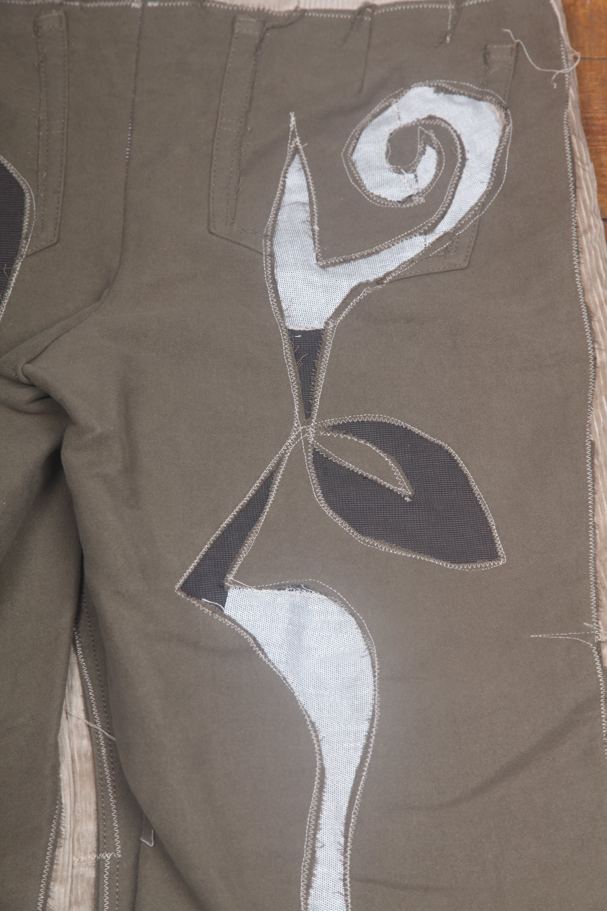 Hand crafted using second hand cotton fabrics, cargo style trousers with big pockets and unique appliqué leaf and garden designs. Khaki moleskin cotton and beige corduroy.