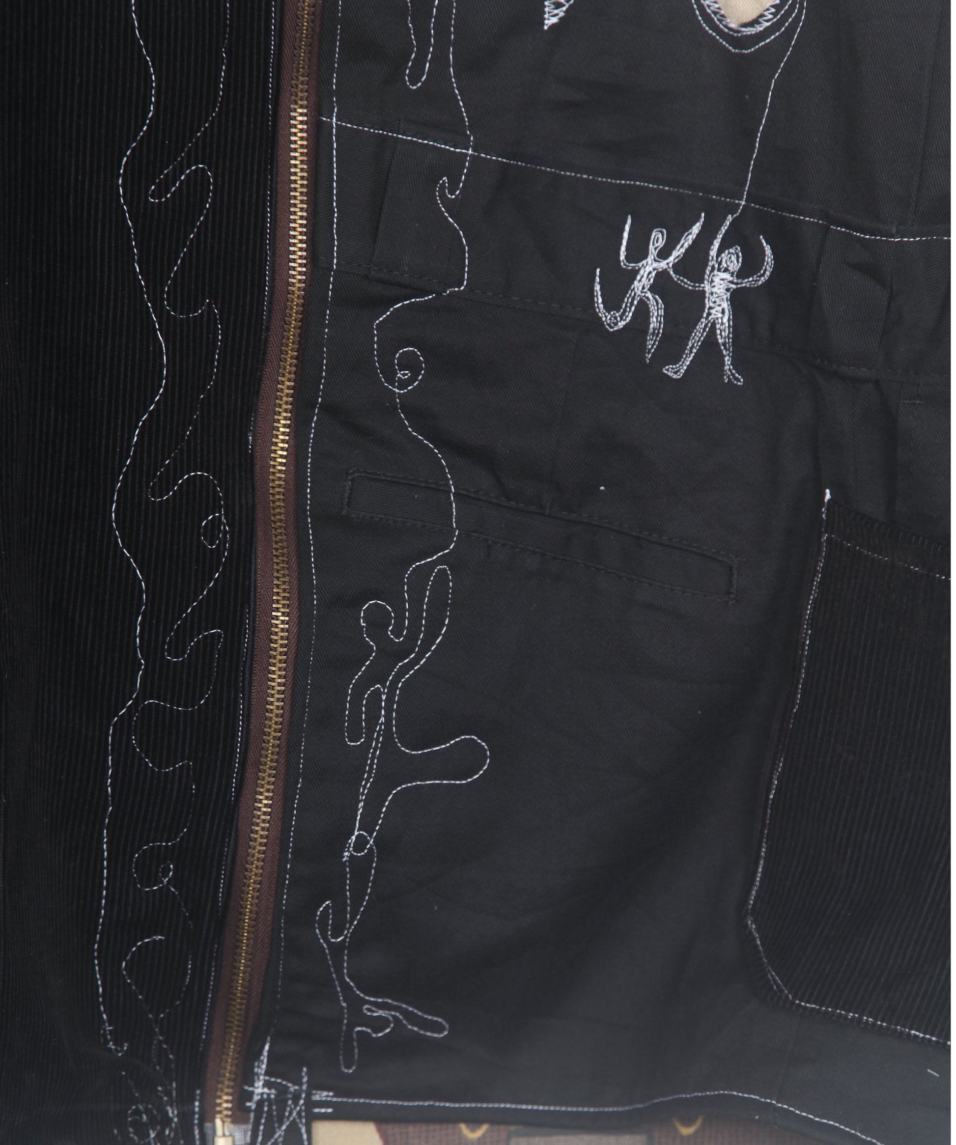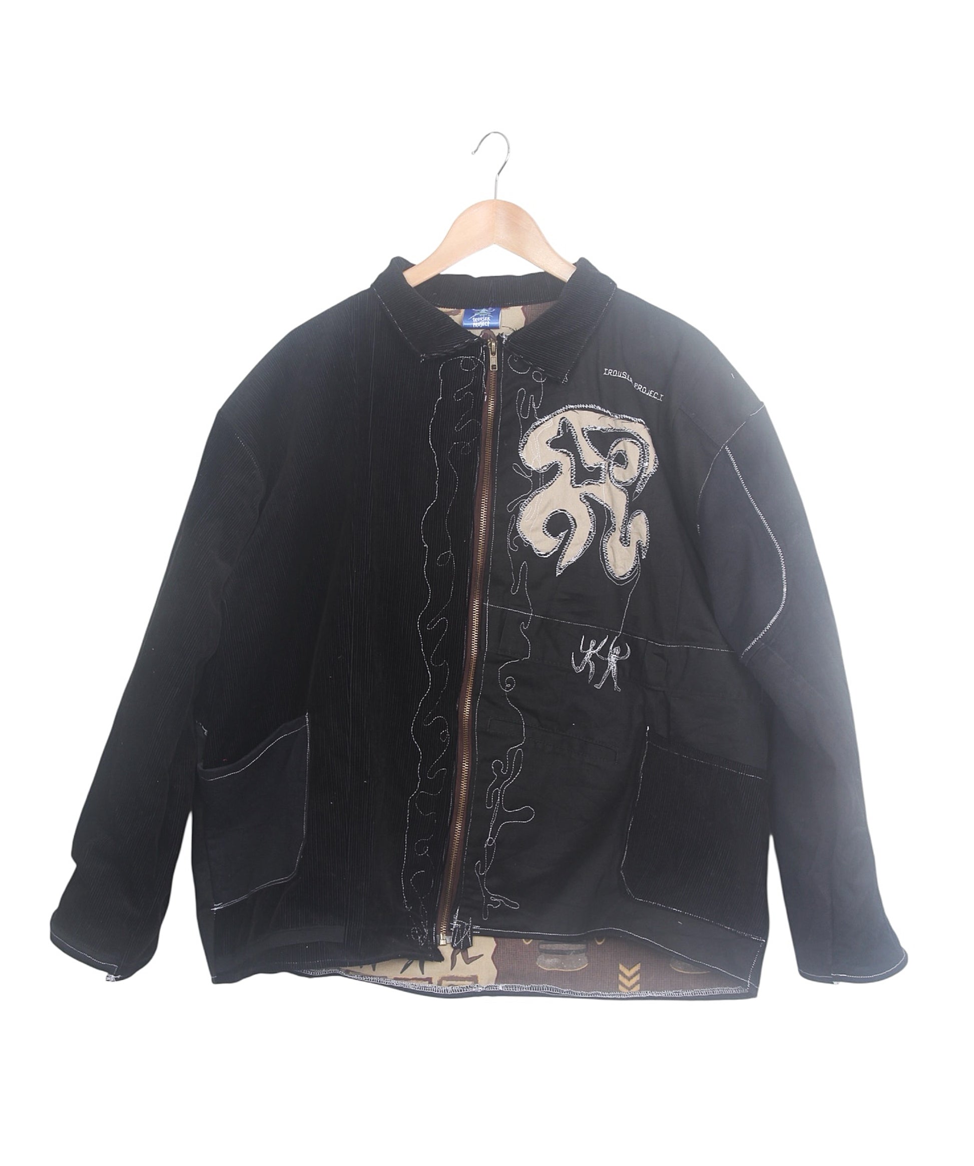 Boxy worker style zip up black cord/ canvas jacket made from second hand trousers, lined with cotton Ghanaian fabric. Details of wonky stitching, patchwork and embroidery creating something completely 1 off and celebrating sustainably hand crafted clothing. Unisex.