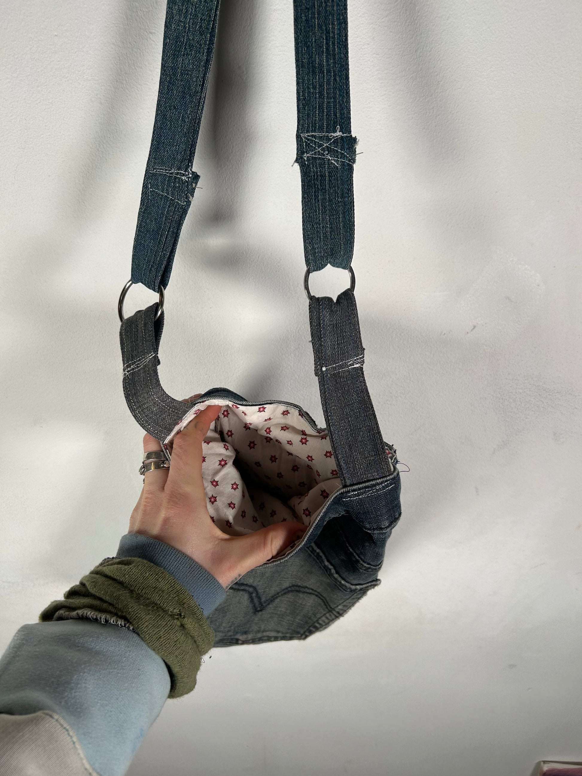 Repurposed from scrap jeans, a cross body handbag with useful side pockets from the original trousers. Lined with pre-loved shirt fabric.