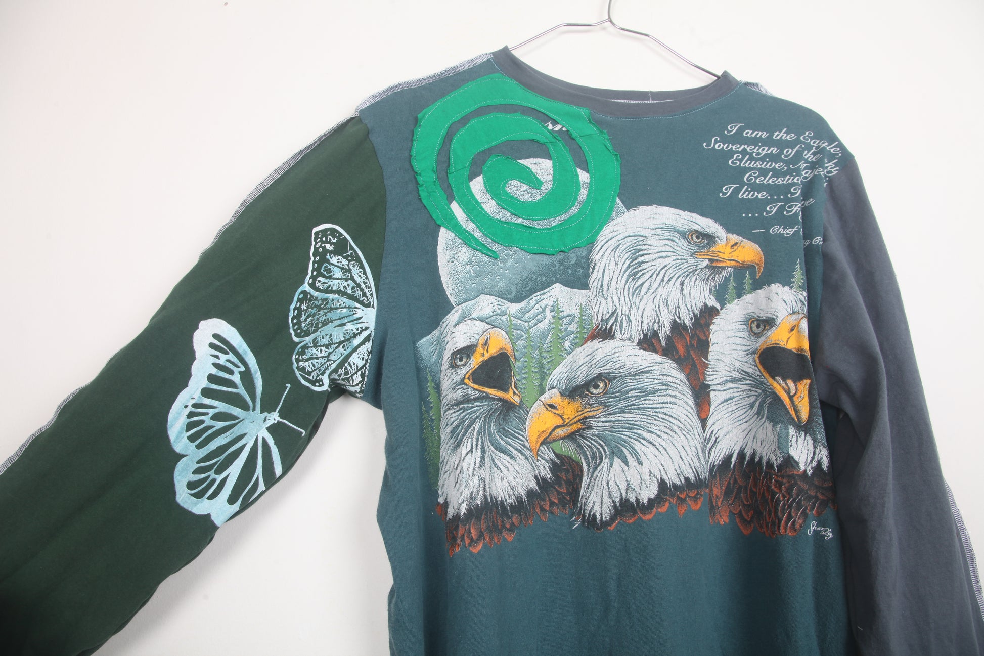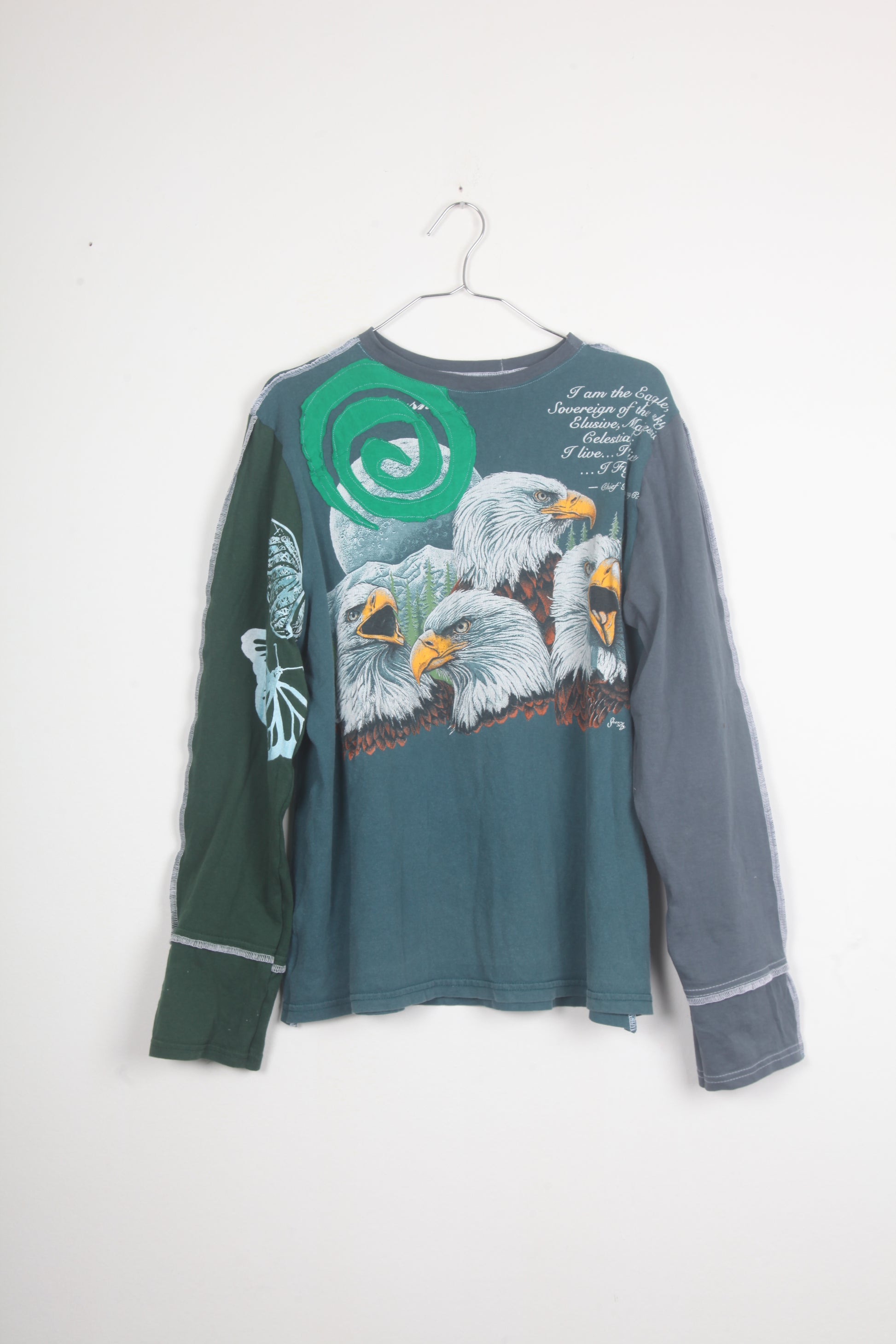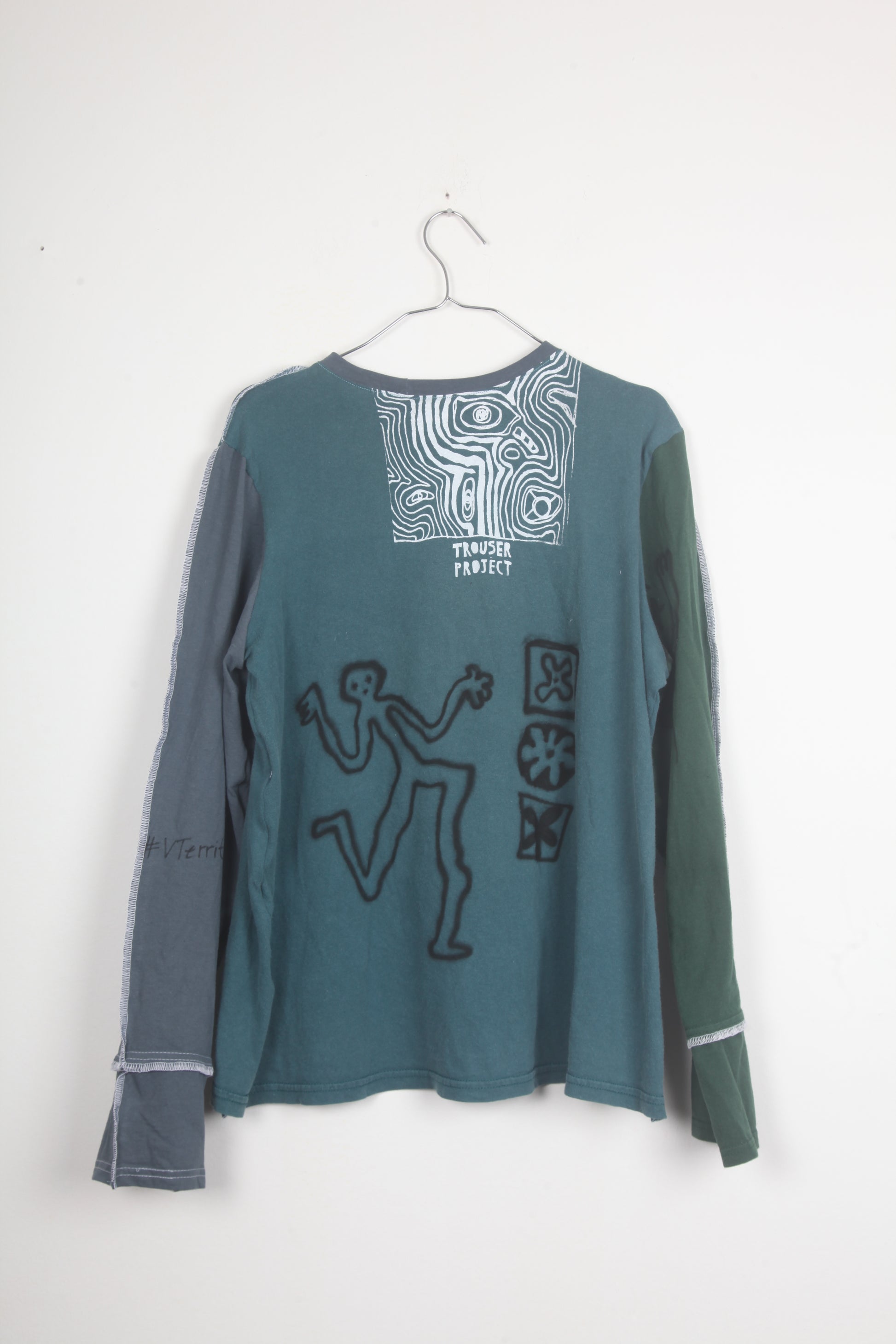 Sustainably made using from second hand fabrics, designed with freehand airbrush to make a funky unique patchwork 1of1 long sleeve T-shirt.