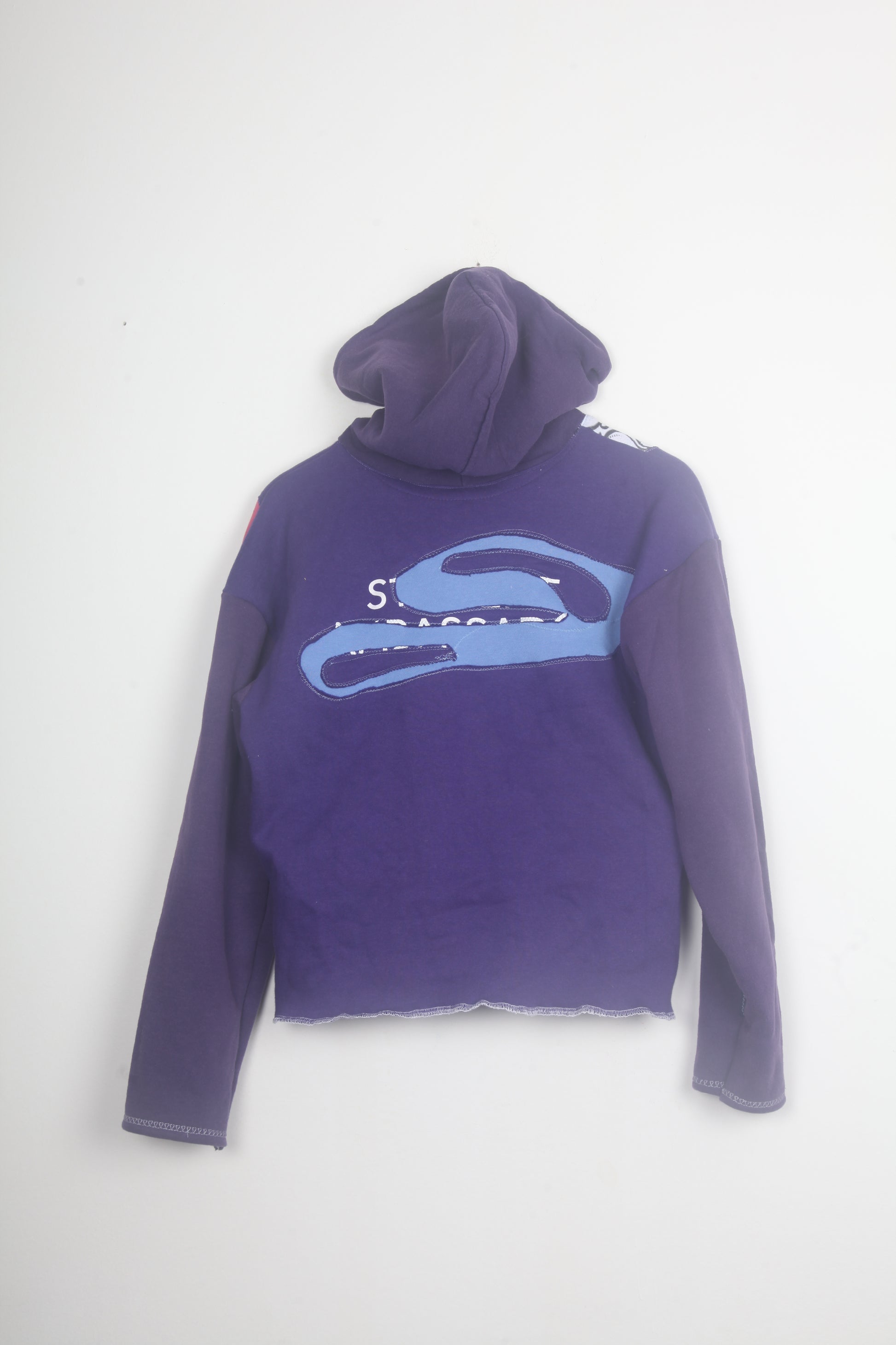Super soft comfy patchwork hoodie made from second hand materials, appliqué and screen-print upcycling to create a one off funky sustainable piece. Purple, pink and blue colour scheme. Slightly cropped to stop at the waist. Unisex
