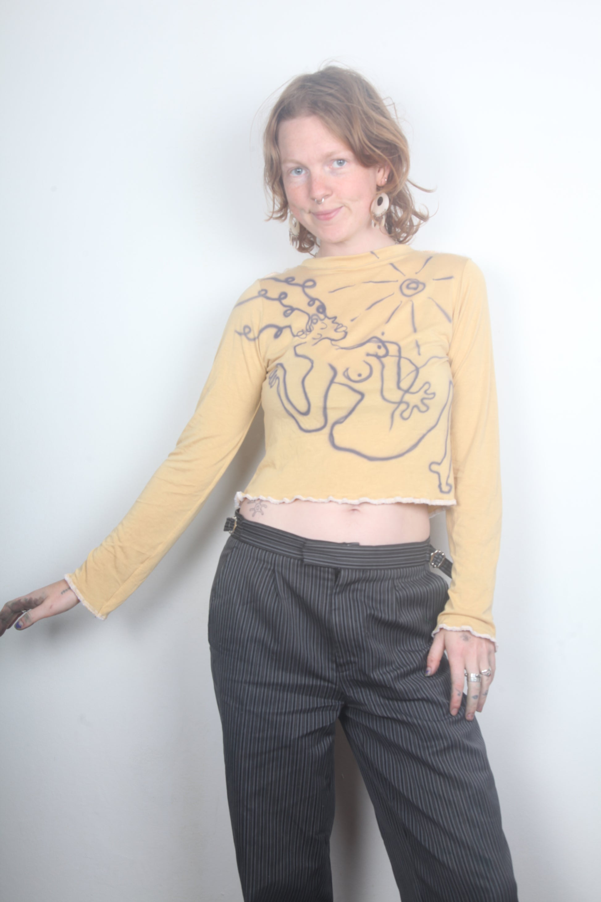 Reworked from second hand materials, sustainably crafted long sleeve T-shirt. Designed to be fitted and slightly cropped. Upcycled with my own screen-print and airbrush designs to make a unique 1of1 item. Unisex. Baby yellow.