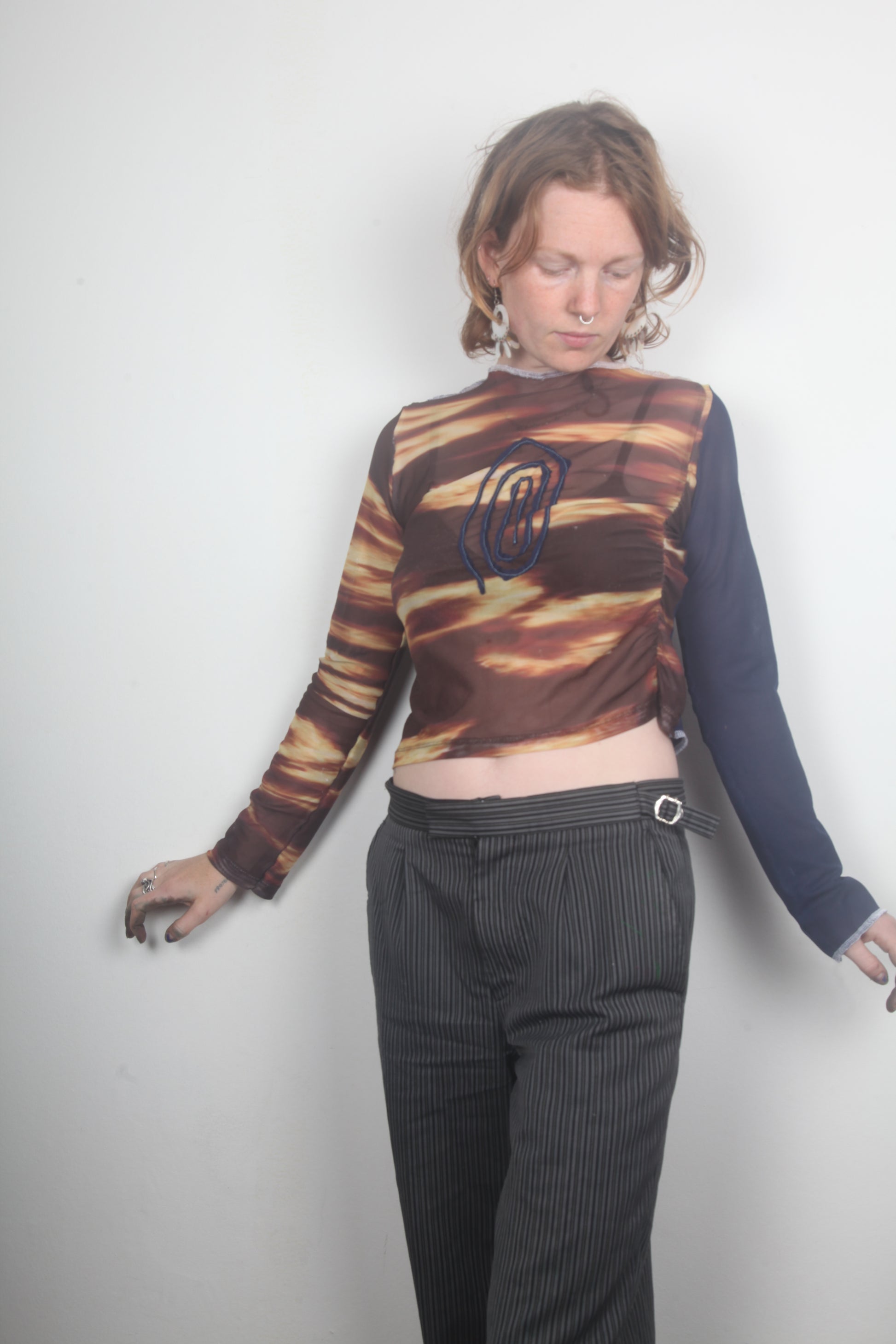 Reworked from second hand materials, sustainably crafted long sleeve T-shirt. Navy and burnt orange/brown mesh. Designed to be fitted and slightly cropped. Unique 1of1 item. Unisex.