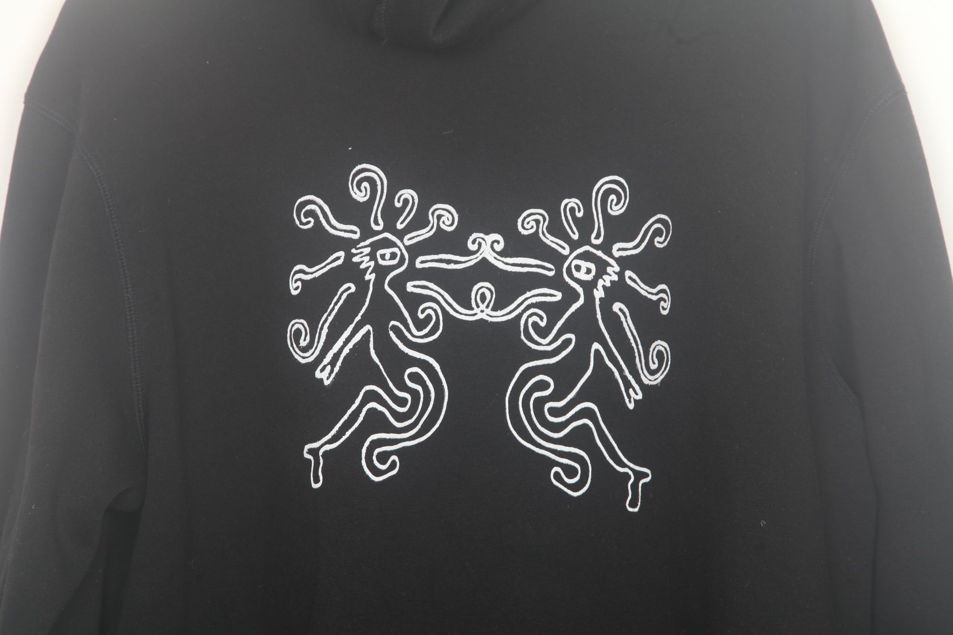 Zip up pre-loved Gap black hoodie with appliqué reworked designs, screenprints and visible mending stitches. Pink and blue abstract shapes. 77% Cotton 23% Polyester. Wash on 30 and air dry.