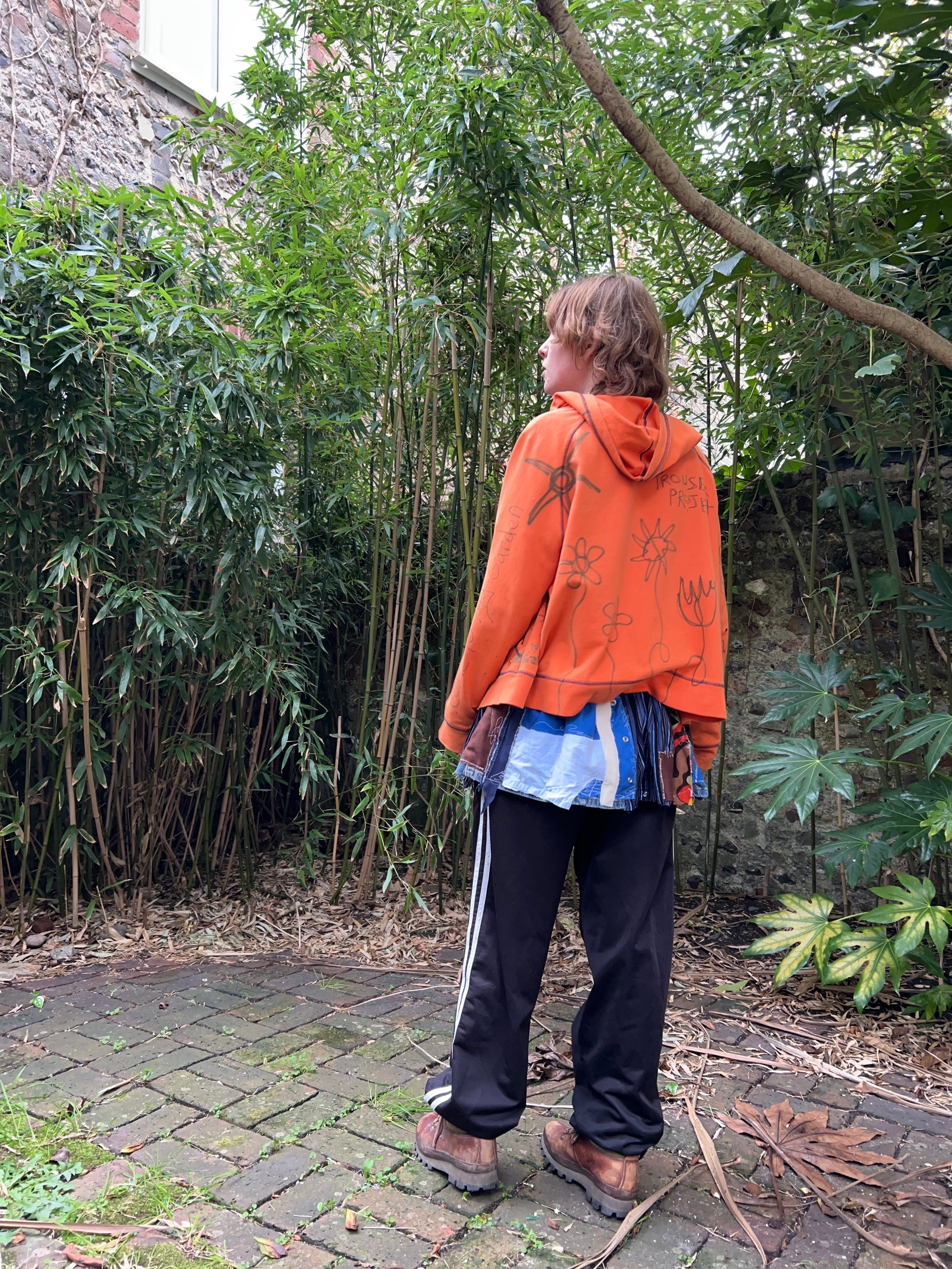 Patchwork with raw hem, mix of brown and blue hues. One of a kind upcycled reworked item.