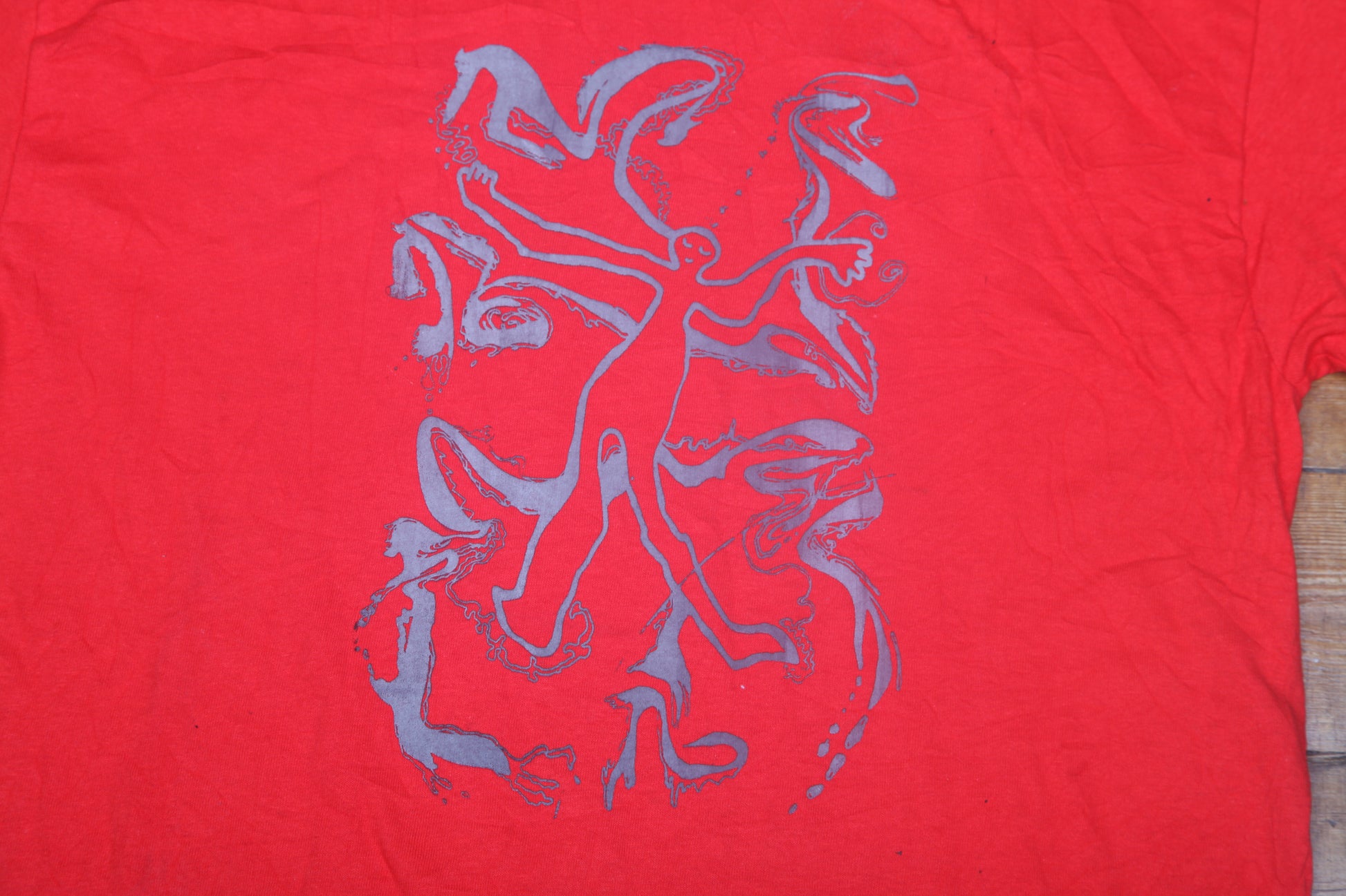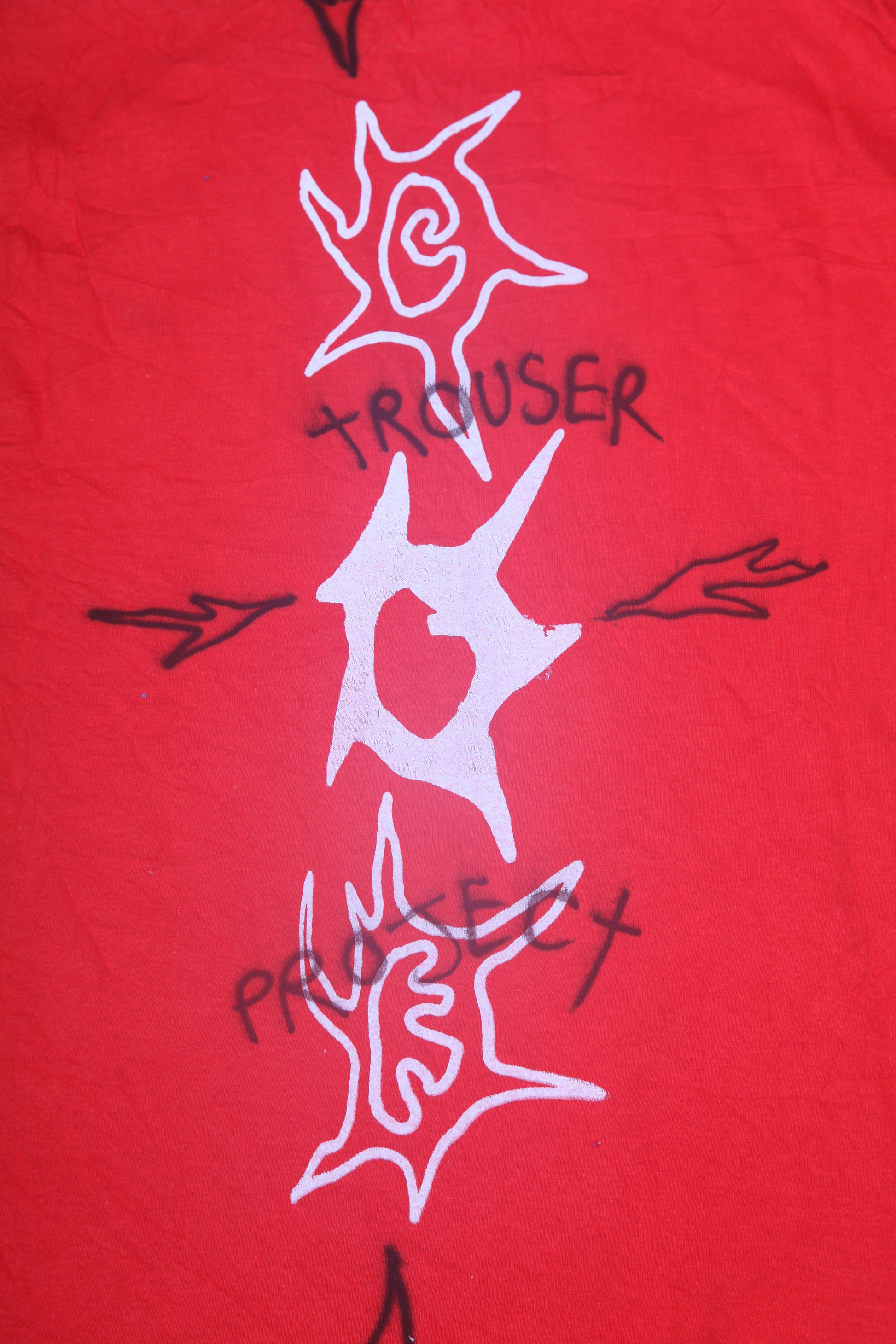 1of1 Hand printed pre-loved red T-shirt, sustainably sourced and upcycled with graphic screen-print design.
