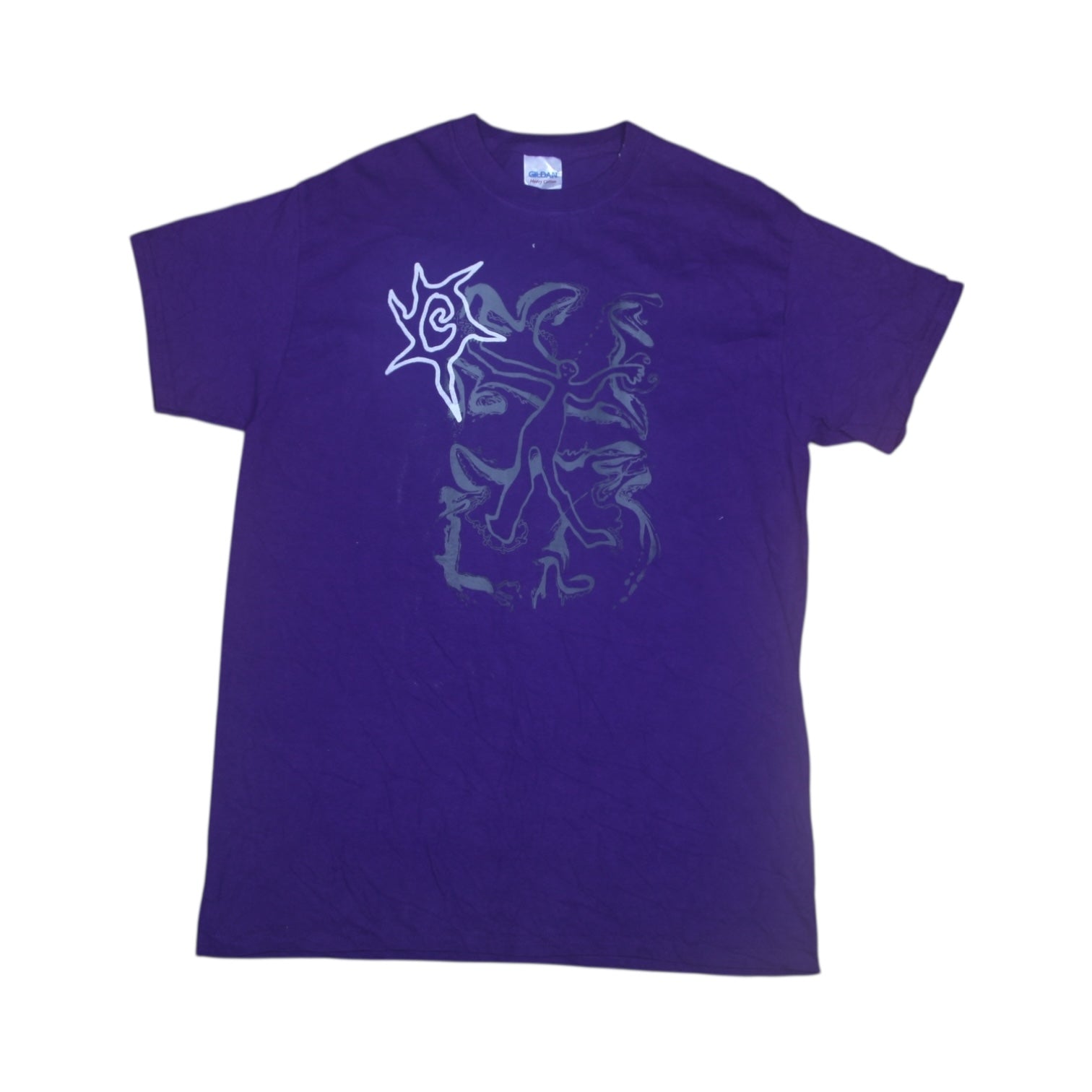 1of1 Hand printed pre-loved purple T-shirt, sustainably sourced and upcycled with graphic screen-print design.