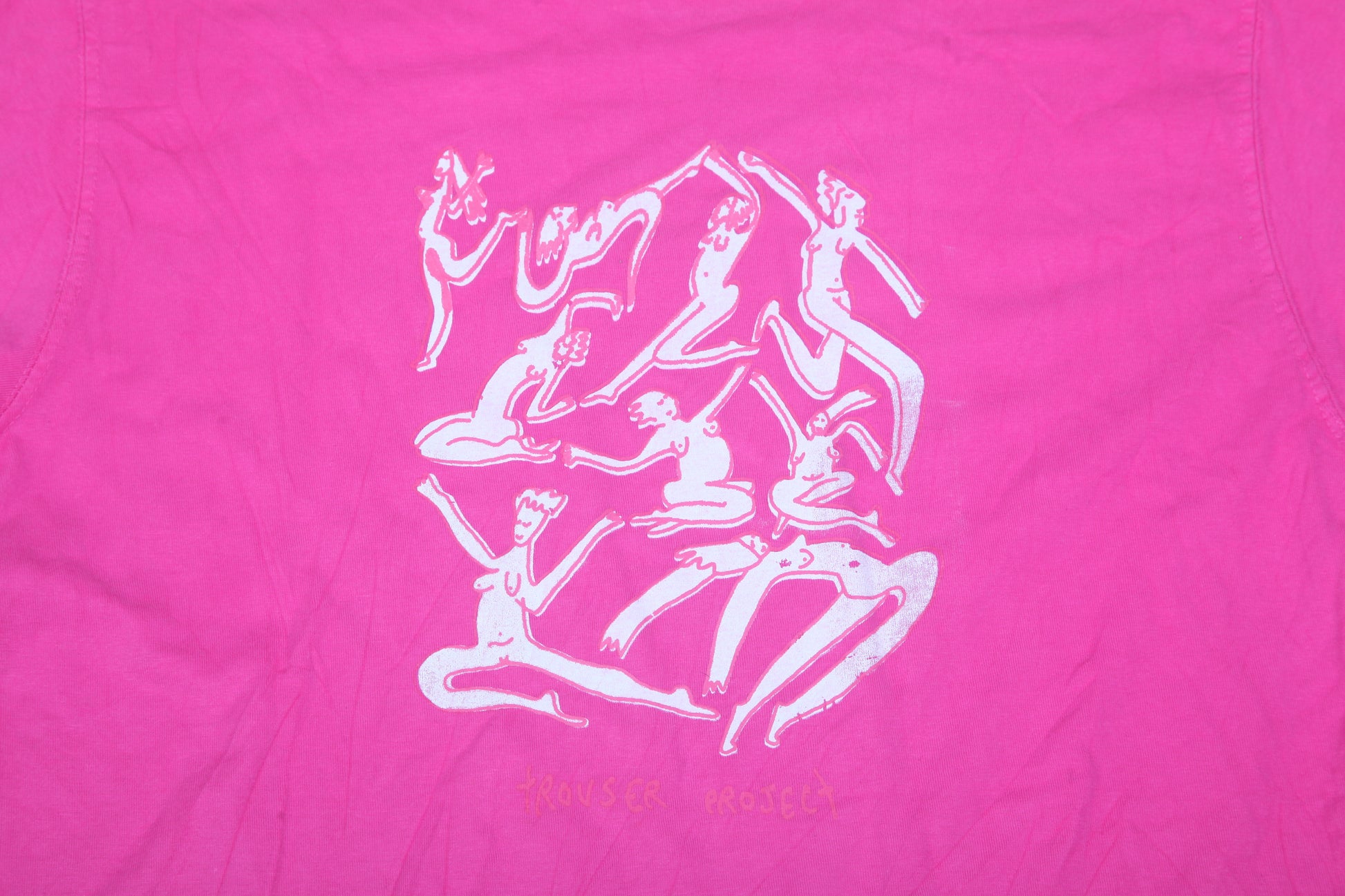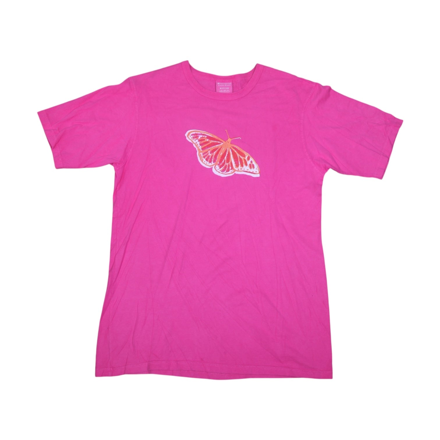 Pre-loved cotton pink Champion T-shirt upcycled with graphic screen-print design naked ladies and butterfly.
