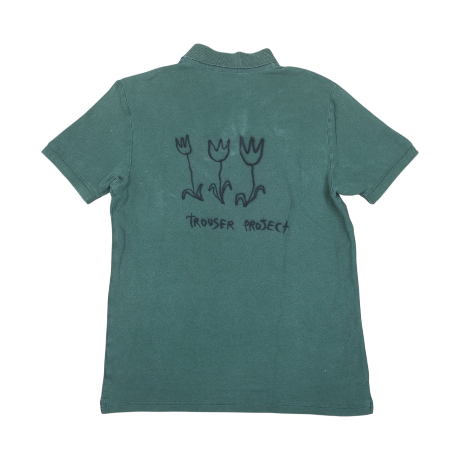 Upcycled pre-loved green polo neck T-shirt with screenprint graphic designs and freehand airbrush. 1of1 item.