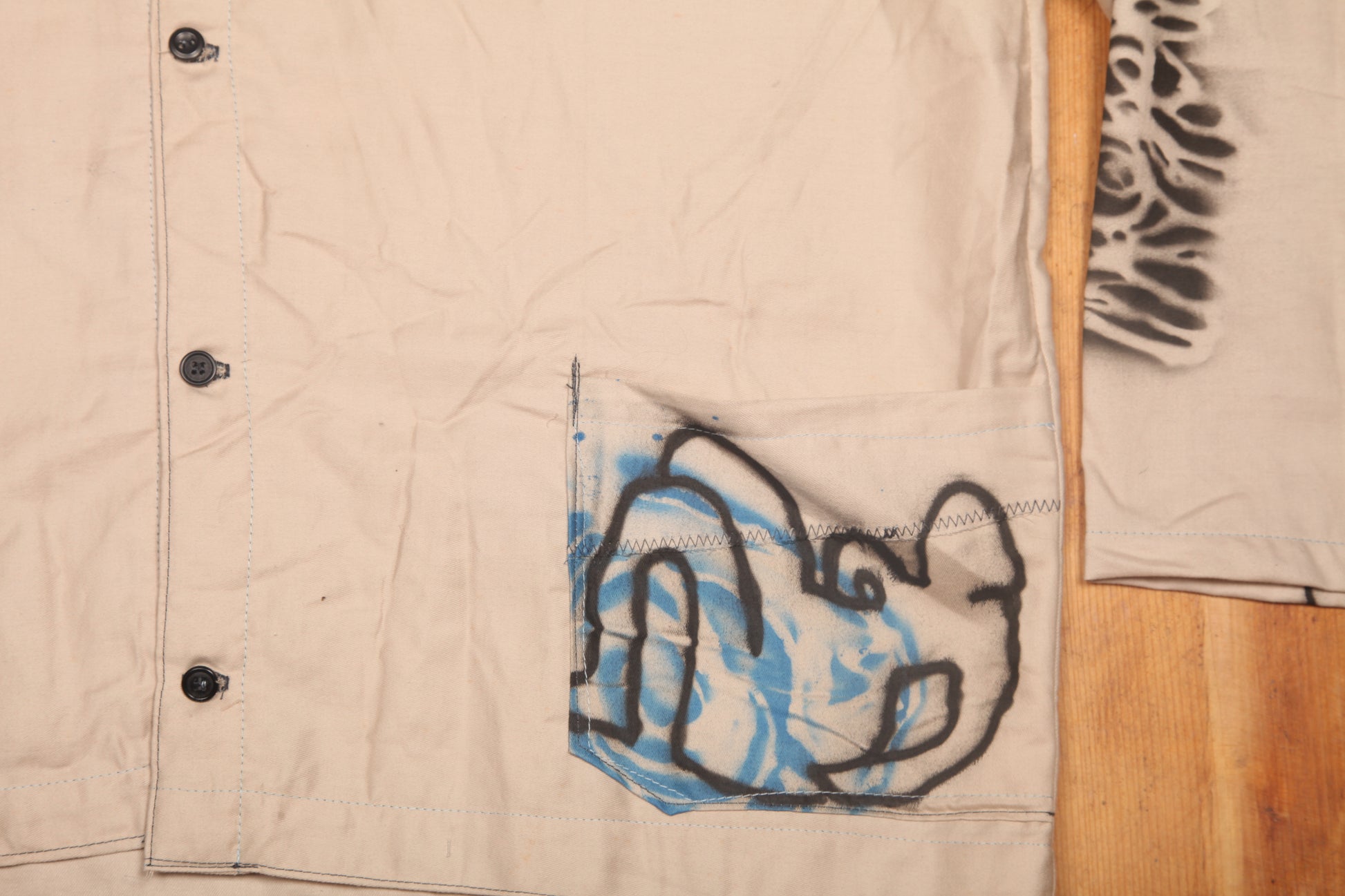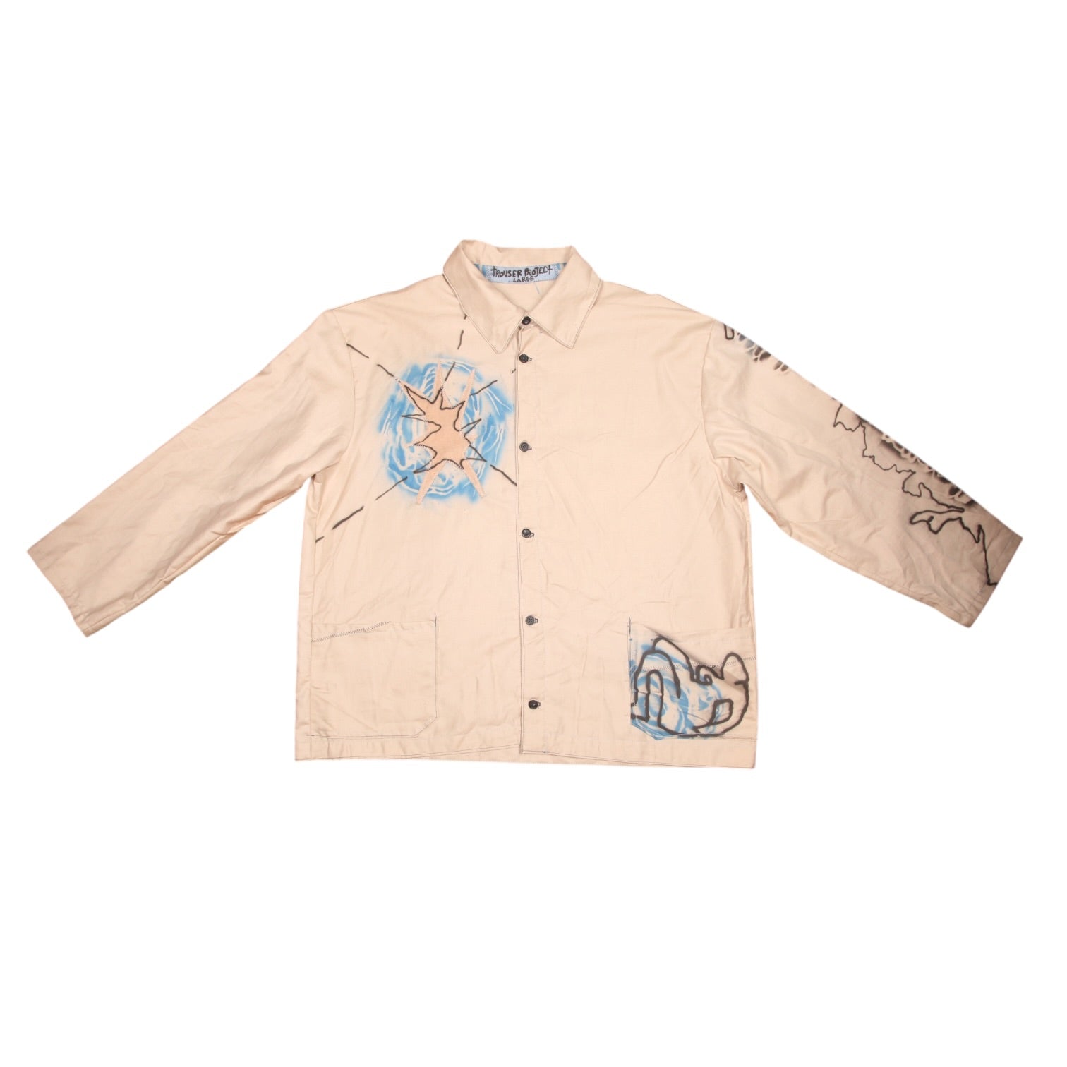 Hand crafted using donated deadstock fabrics, designed using appliqué and airbrush to create a unique pattern. Boxy worker style loose lightweight summer shirt with pockets.