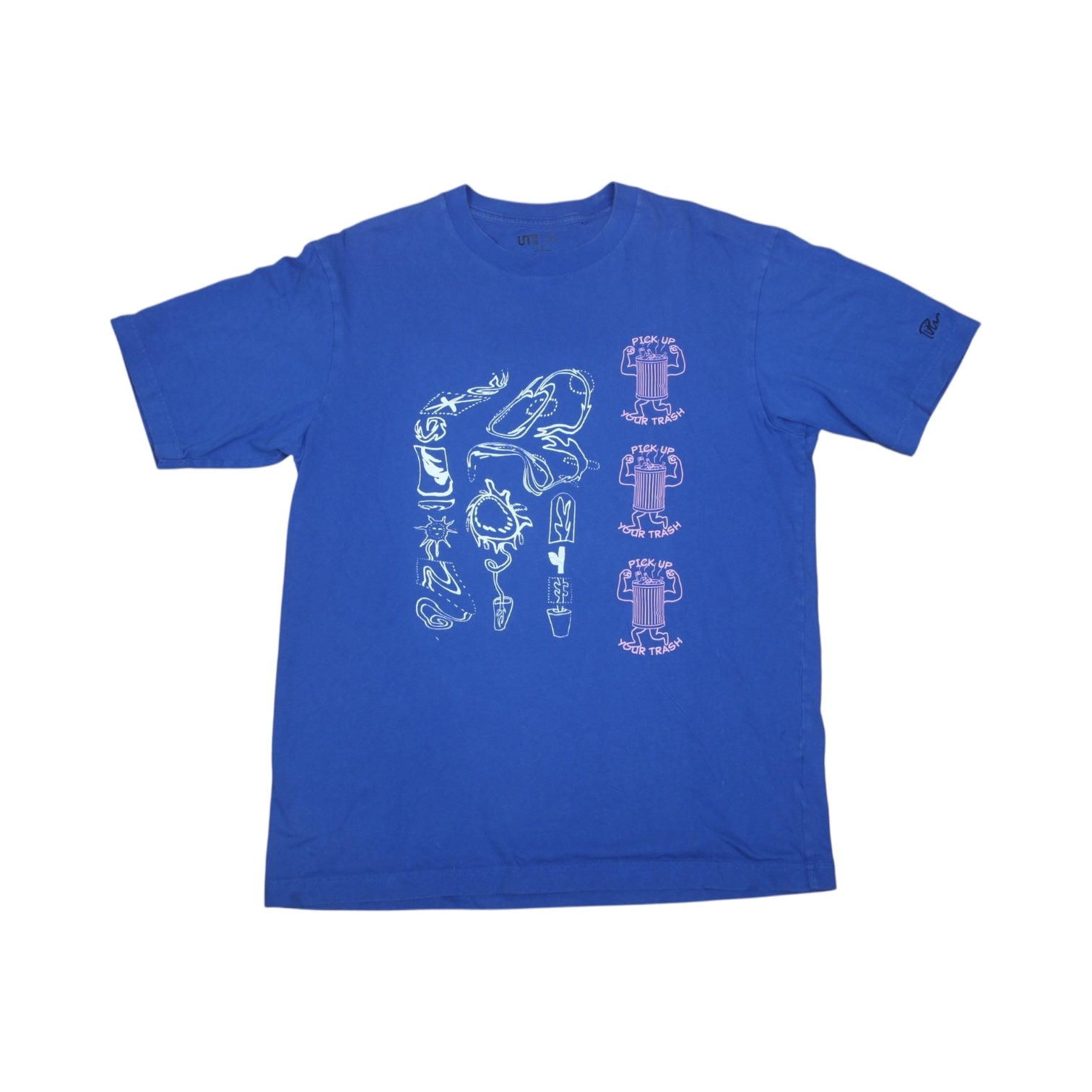 Pre-loved blue tee with graphics and screen-print design. Sustainable, hand printed, and one-of-a-kind. Please note that all items are sourced second hand so may have some wear, any marks have been covered with the new designs. The label may say a different size, I have used a standard sizing chart to keep it consistent.