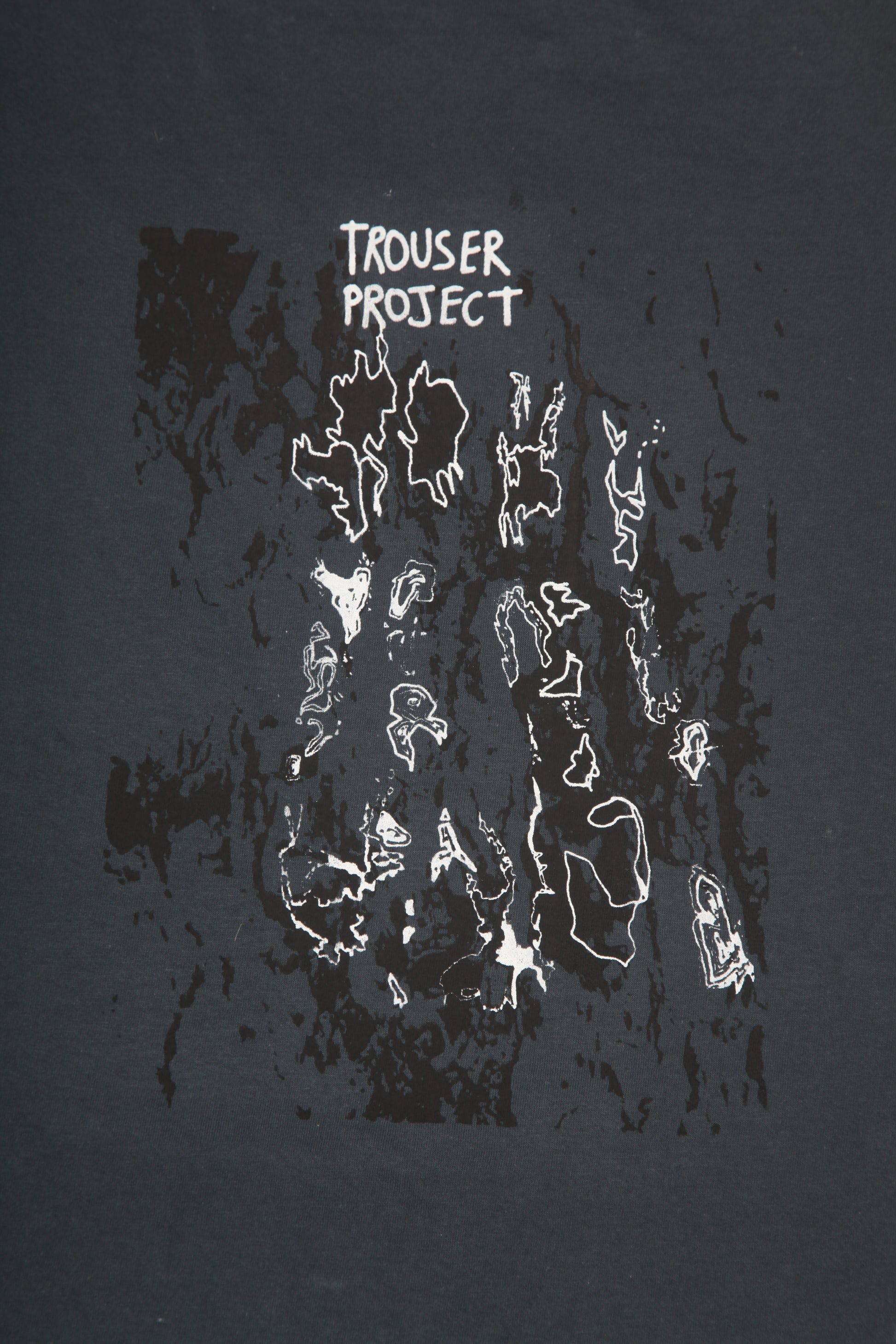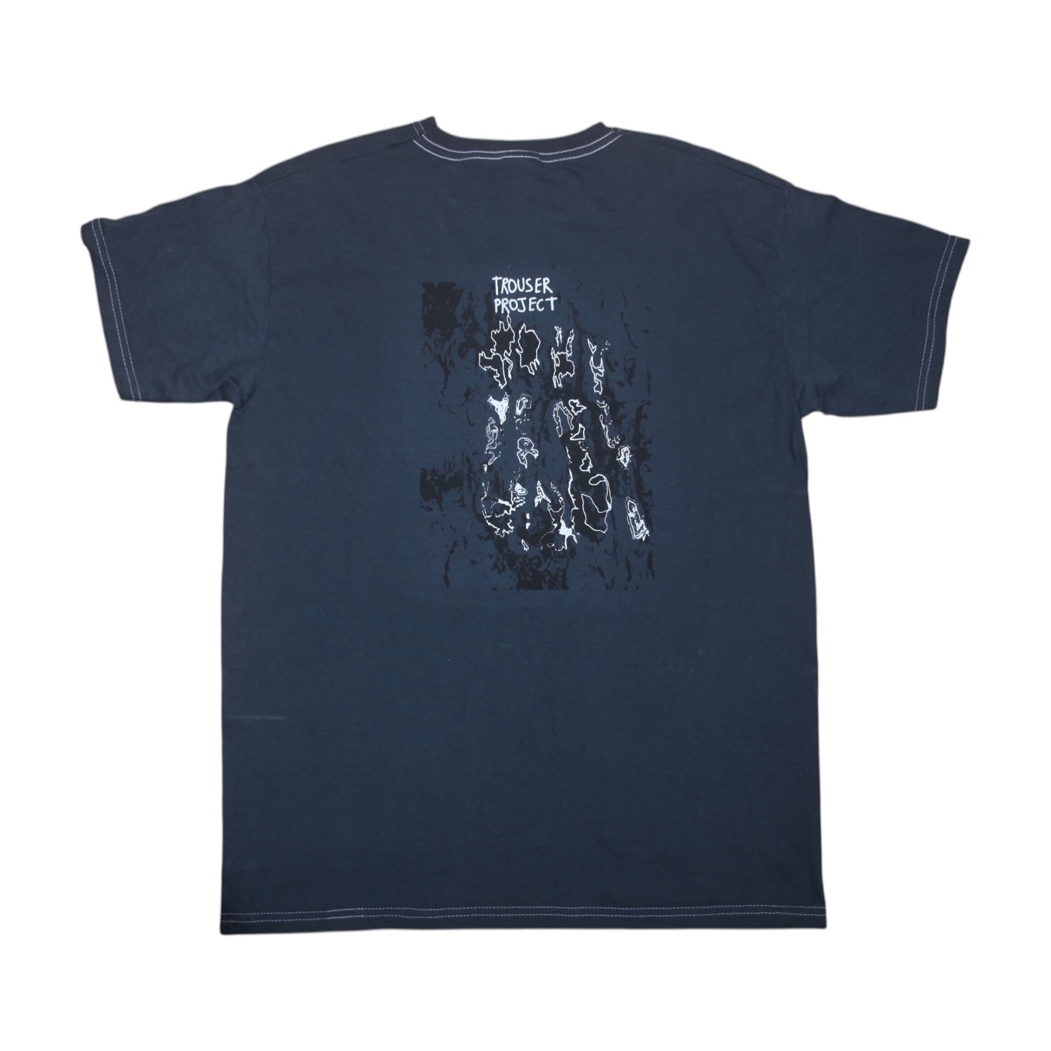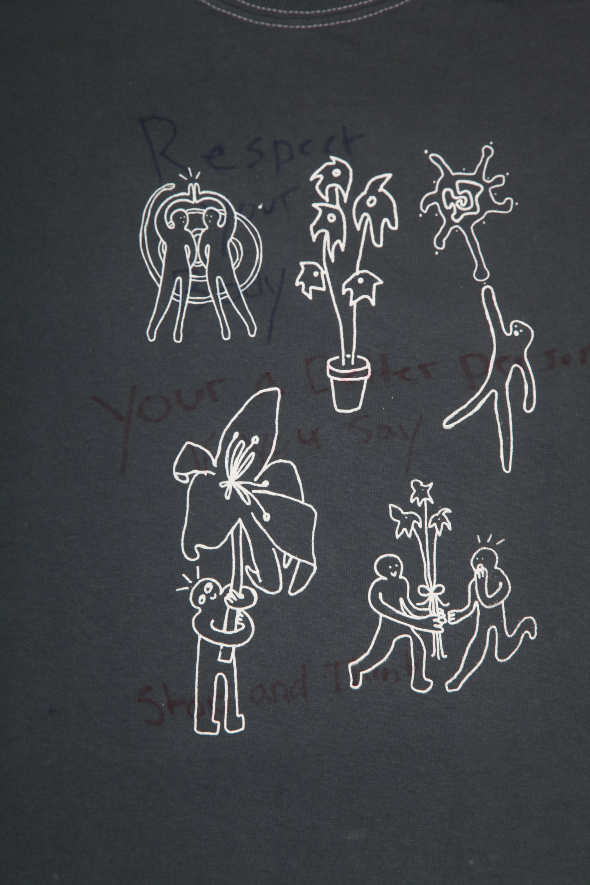 Pre-loved charcoal grey T-Shirt with graphics and double layered textured screen-print design. White contrast stitching. Sustainable, hand printed, and one-of-a-kind. Please note that all items are sourced second hand so may have some wear, any marks have been covered with the new designs. The label may say a different size, I have used a standard sizing chart to keep it consistent.