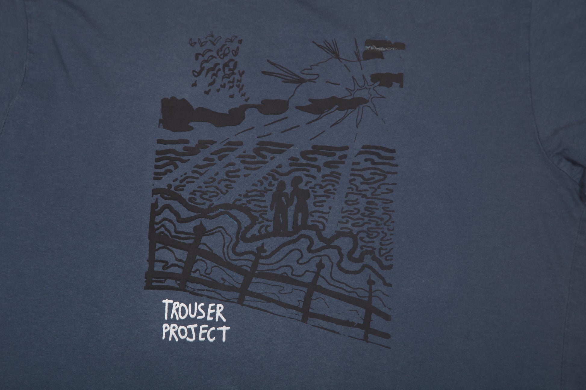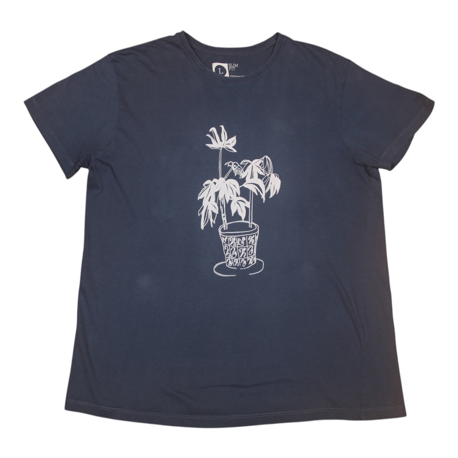 Pre-loved upcycled short sleeve navy T-Shirt with screen-print designs. Sustainably sourced, 1of1 item made with love in our Brighton studio.