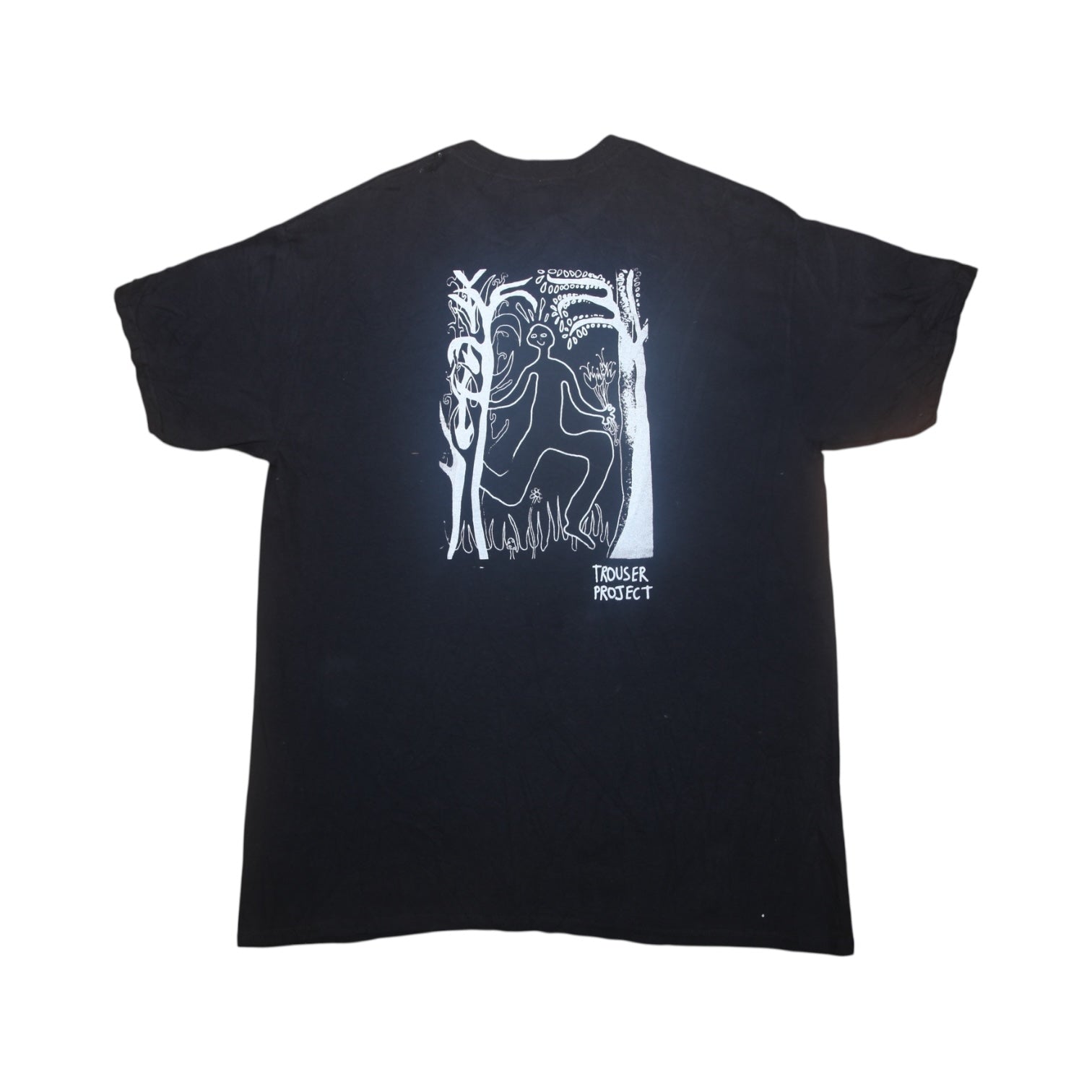 Pre-loved black T-Shirt with graphic screen-print design. Sustainable, hand printed, and one-of-a-kind. Please note that all items are sourced second hand so may have some wear, any marks have been covered with the new designs. The label may say a different size, I have used a standard sizing chart to keep it consistent.