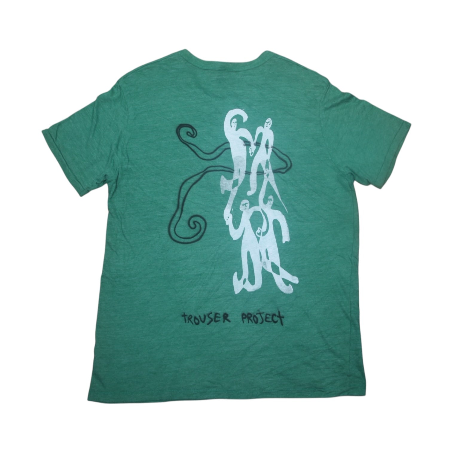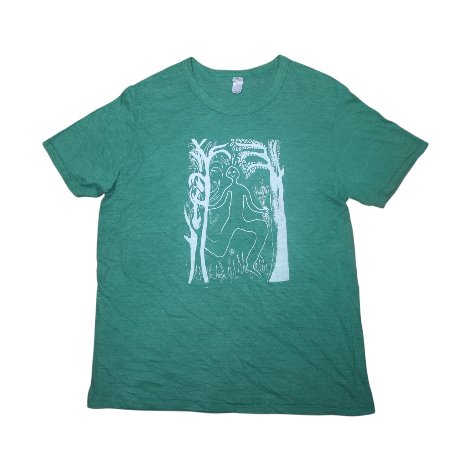 Pre-loved green T-Shirt with graphic screen-print design. Sustainable, hand printed, and one-of-a-kind. Please note that all items are sourced second hand so may have some wear, any marks have been covered with the new designs. The label may say a different size, I have used a standard sizing chart to keep it consistent.