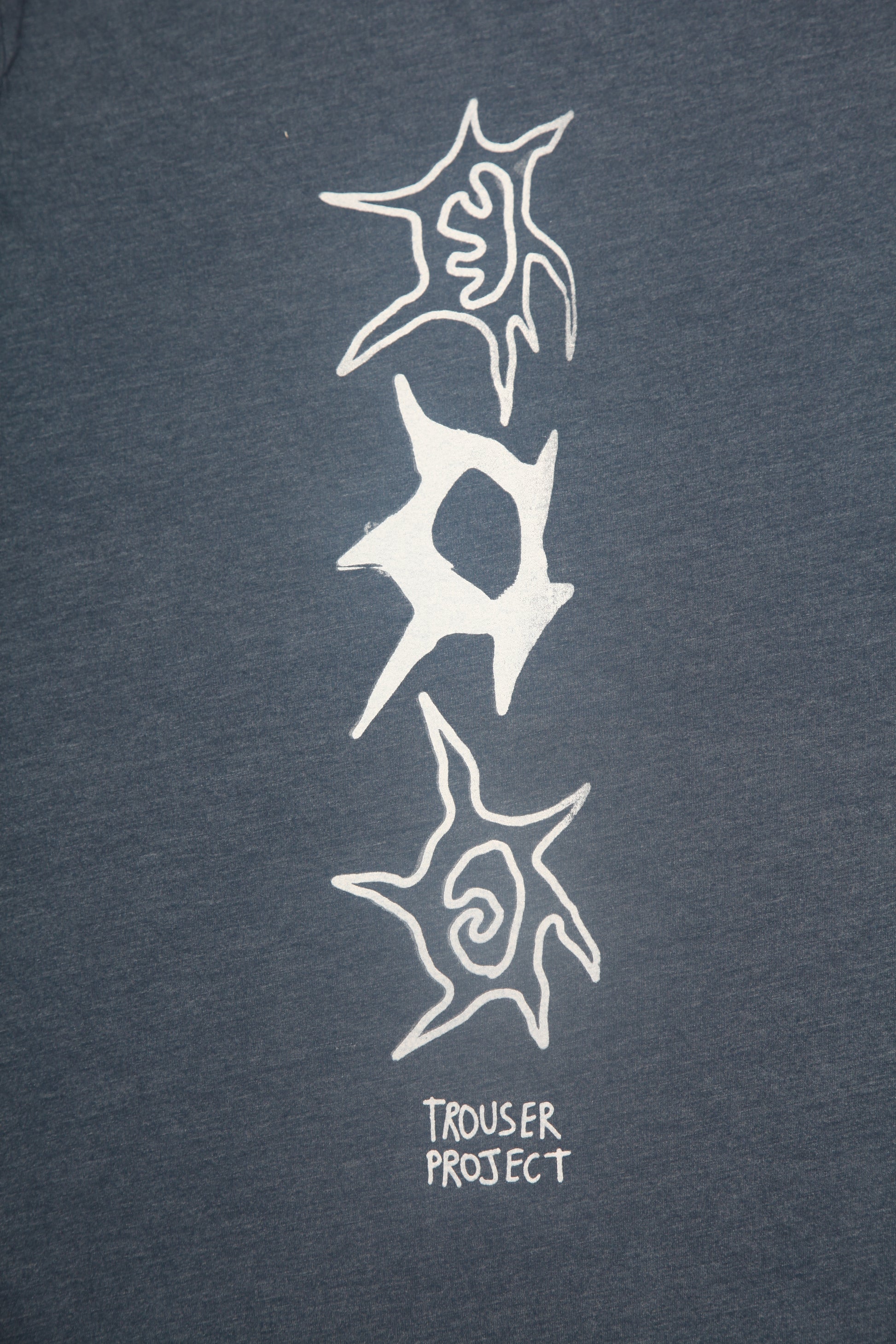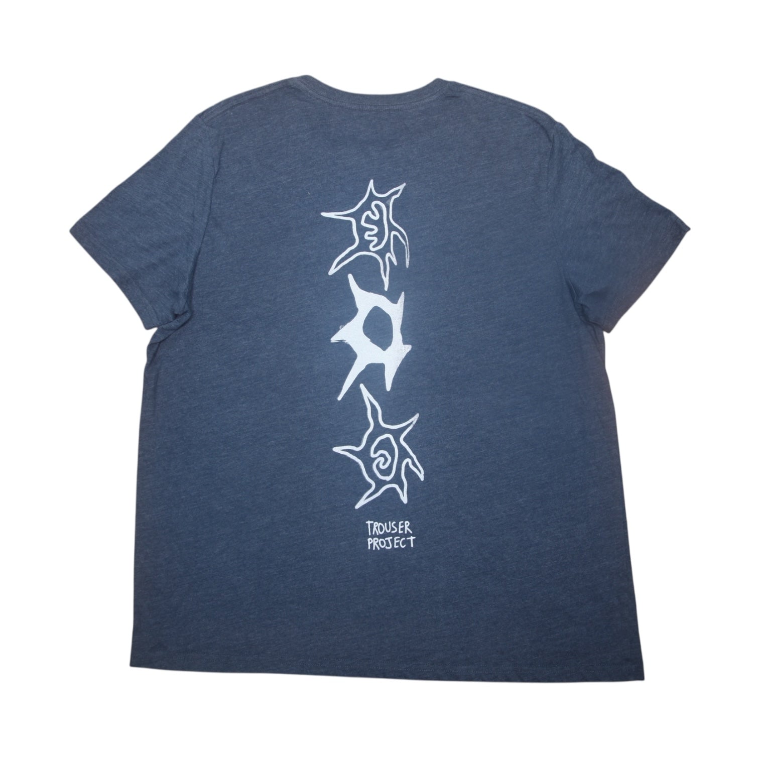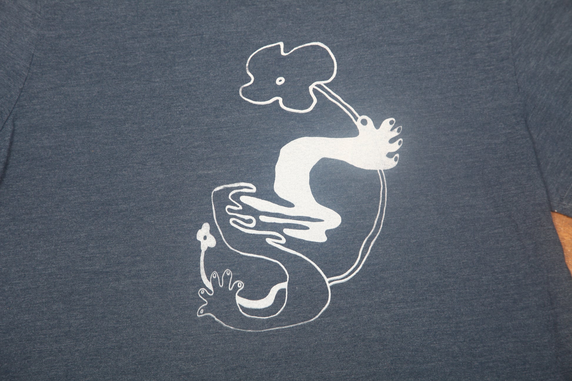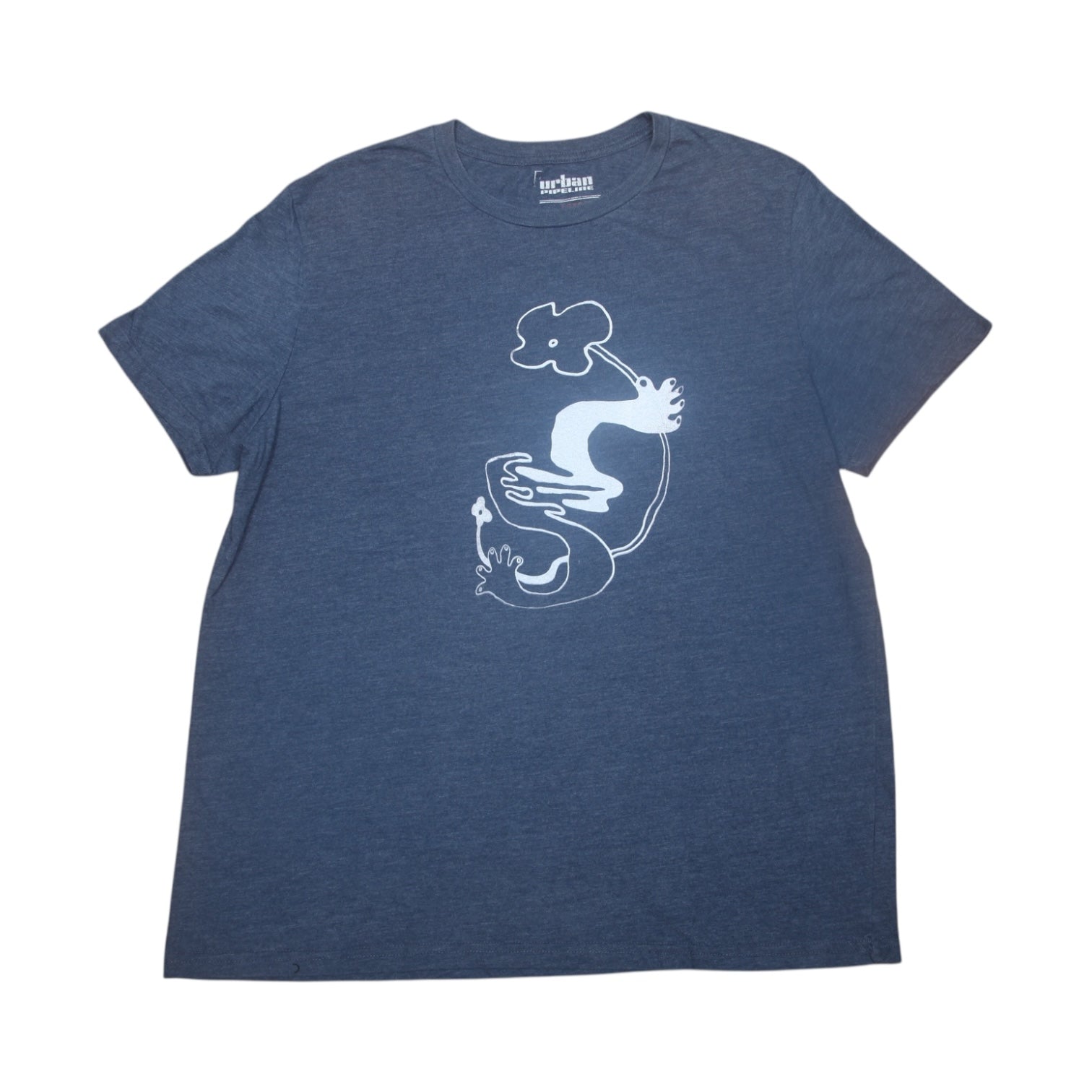Pre-loved grey-blue T-Shirt with graphic screen-print design. Sustainable, hand printed, and one-of-a-kind. Please note that all items are sourced second hand so may have some wear, any marks have been covered with the new designs. The label may say a different size, I have used a standard sizing chart to keep it consistent.