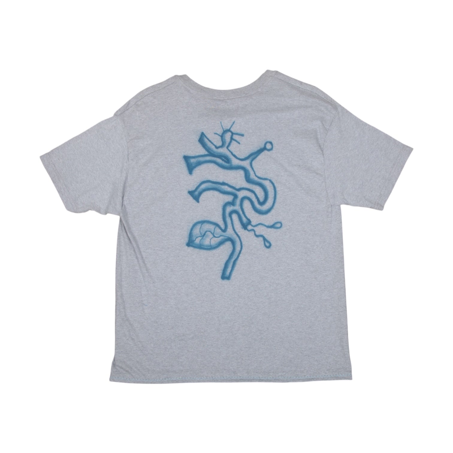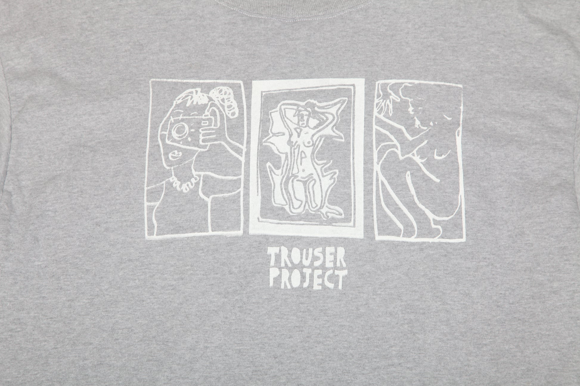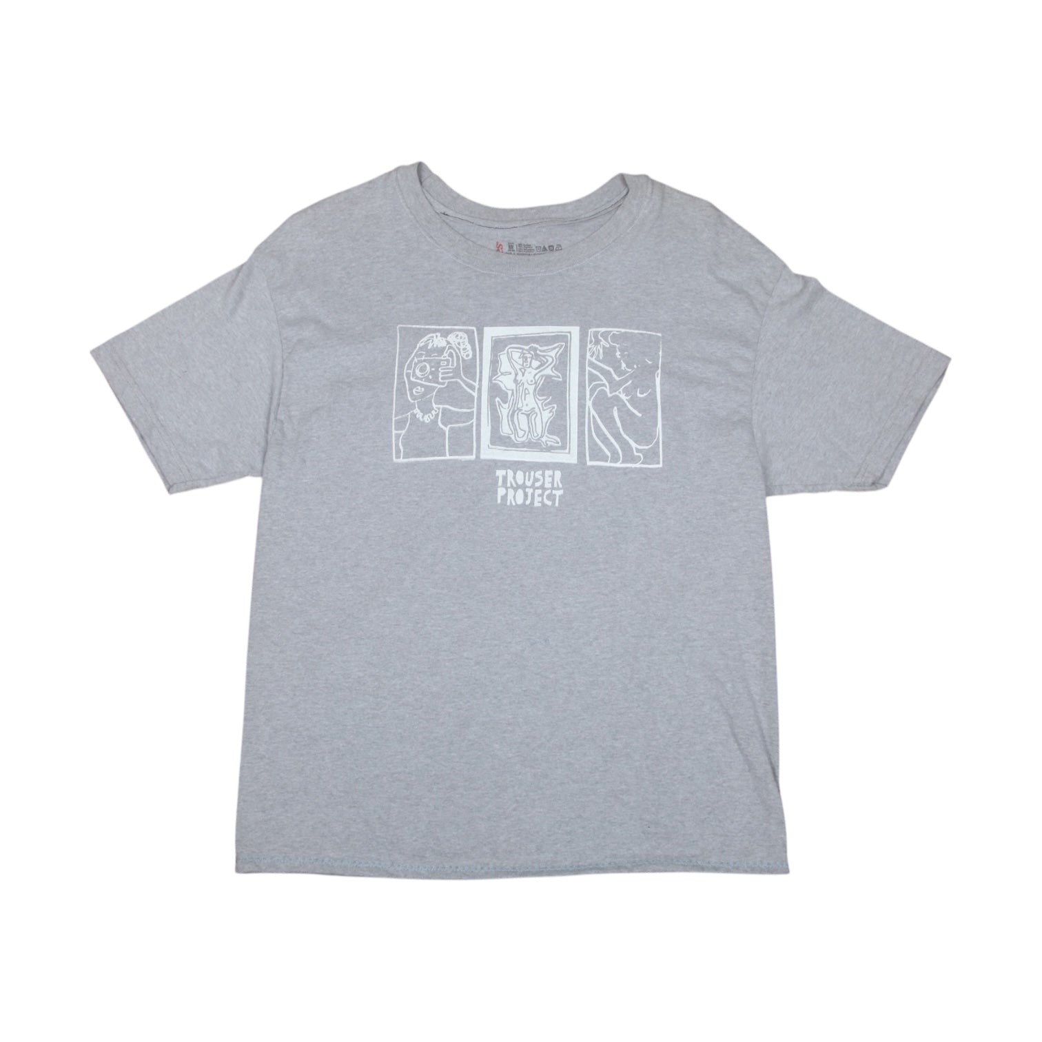 Pre-loved classic light grey cotton T-shirt upcycled with 1of1 funky graphic white screenprint design of life drawings.