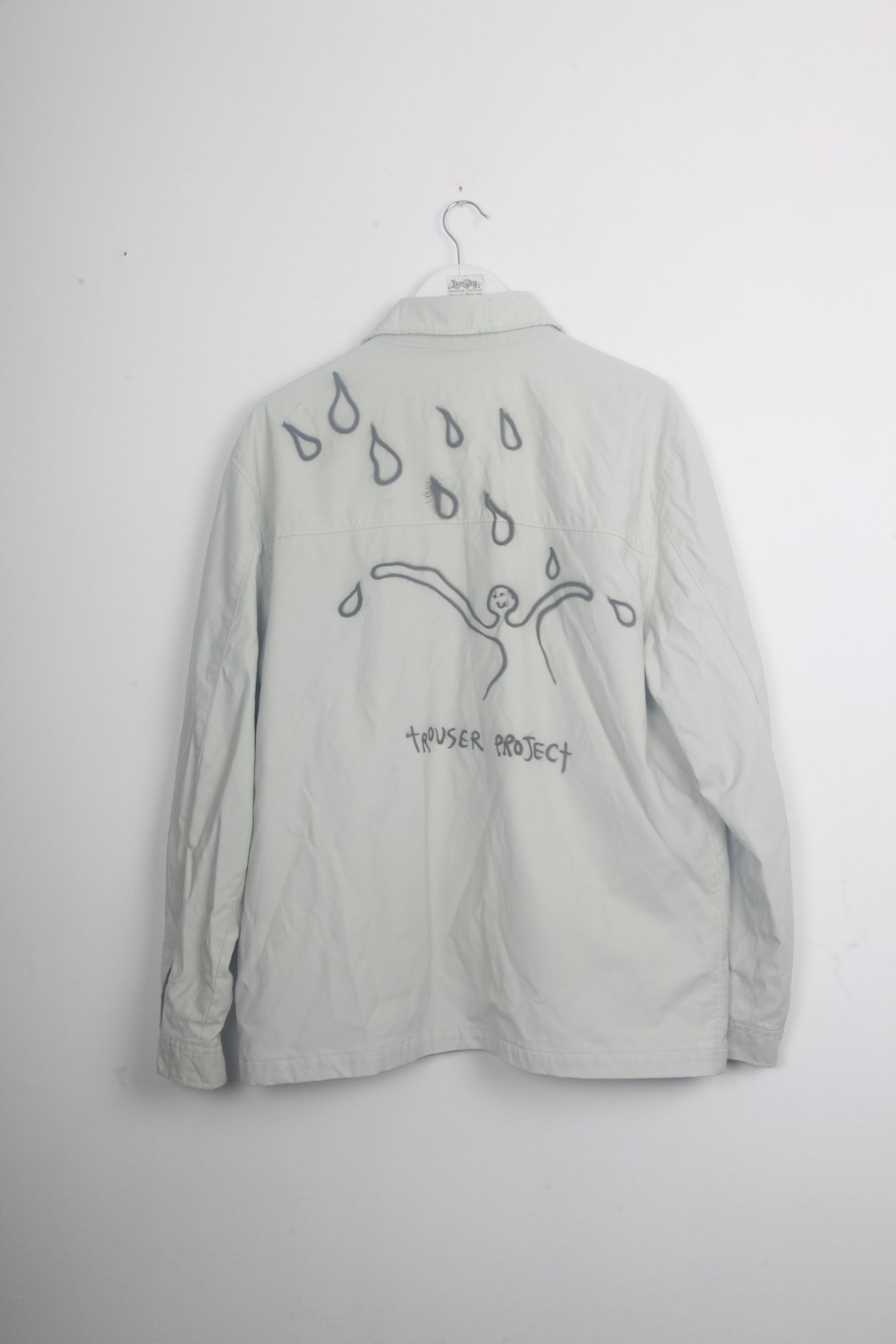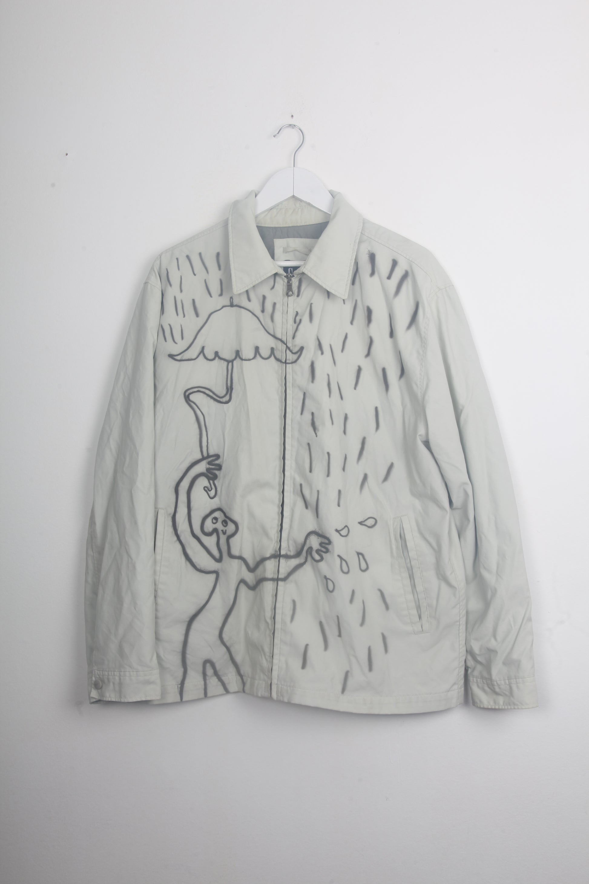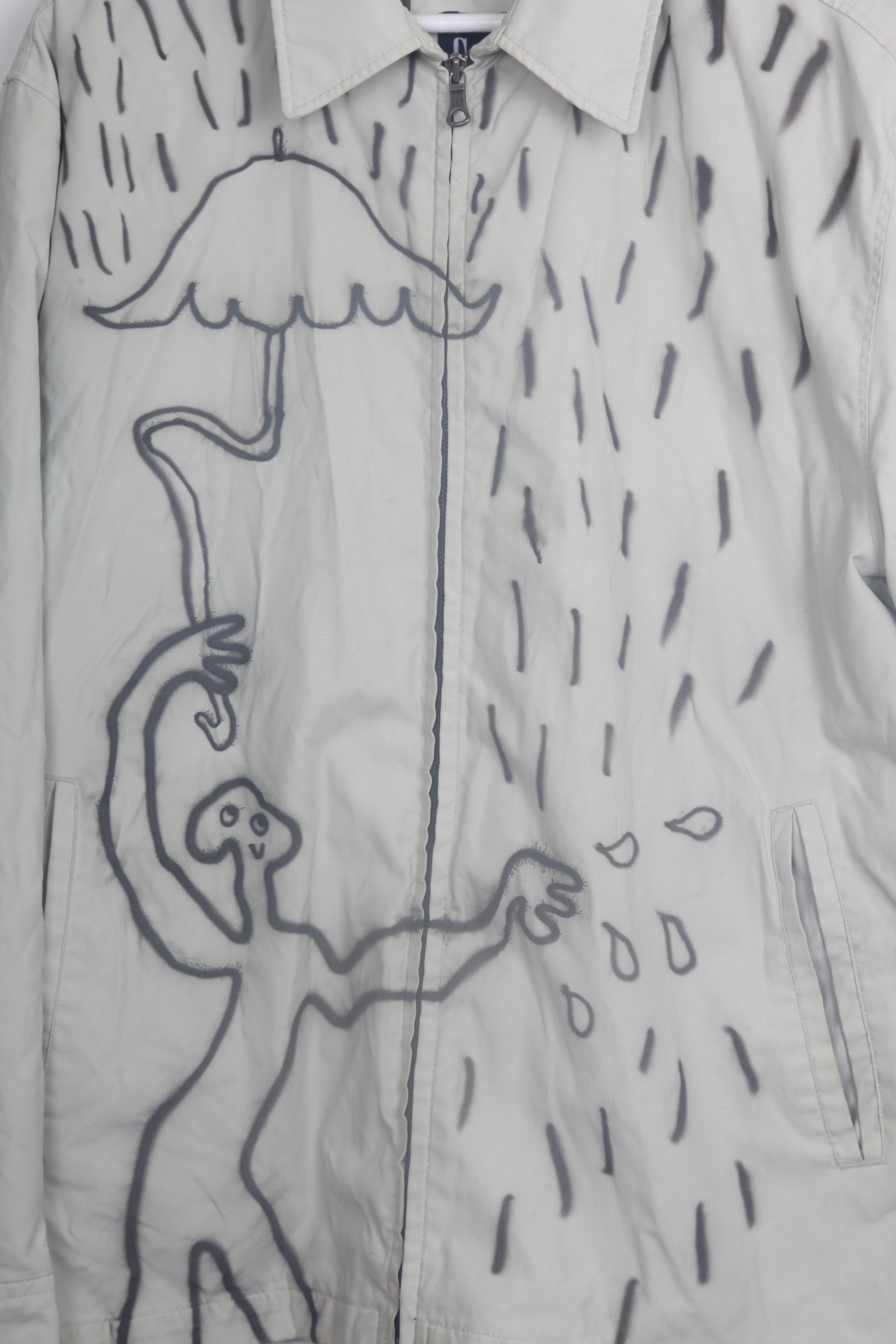 Preloved Gap cream zip up raincoat with funky, unique airbrush rain designs.