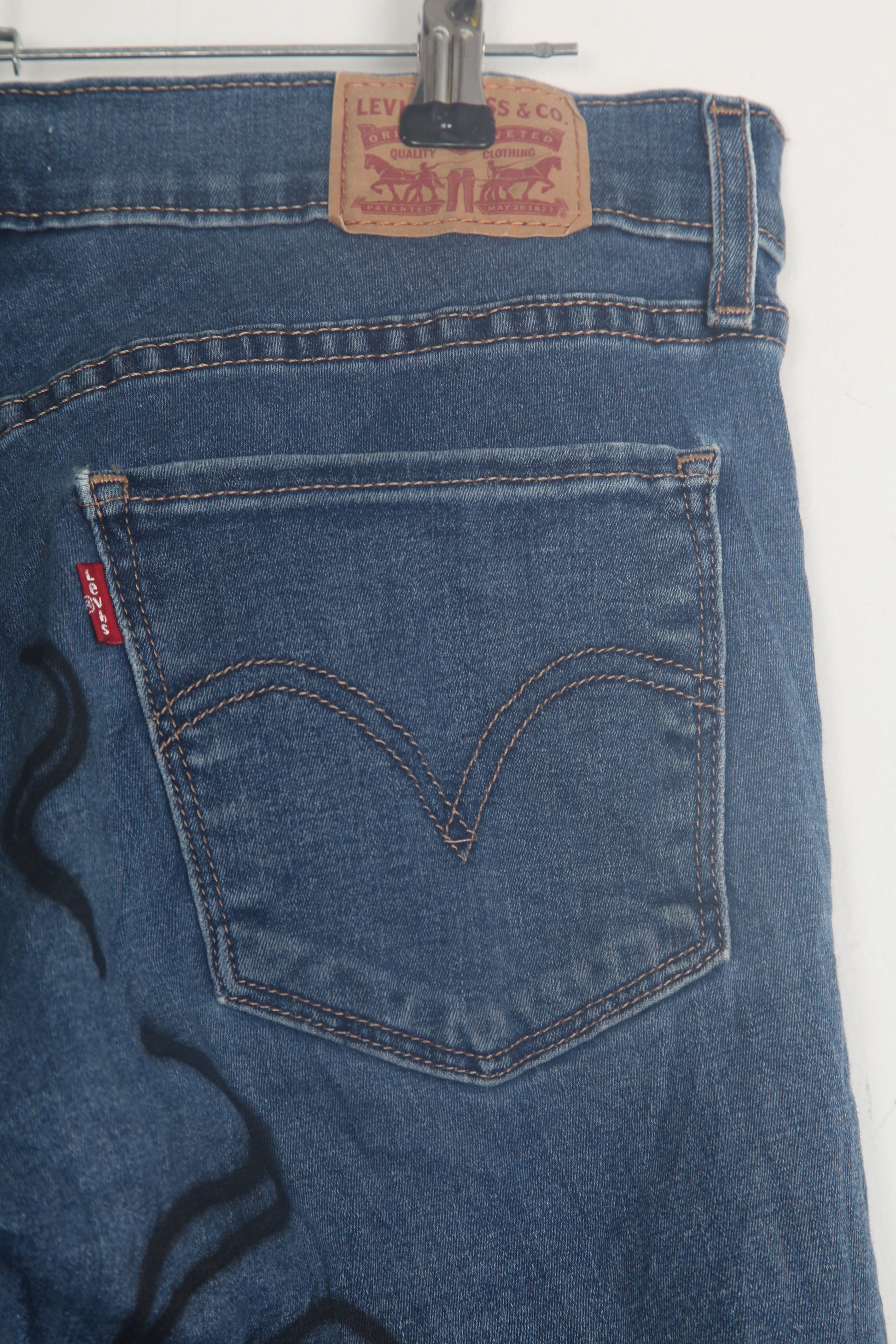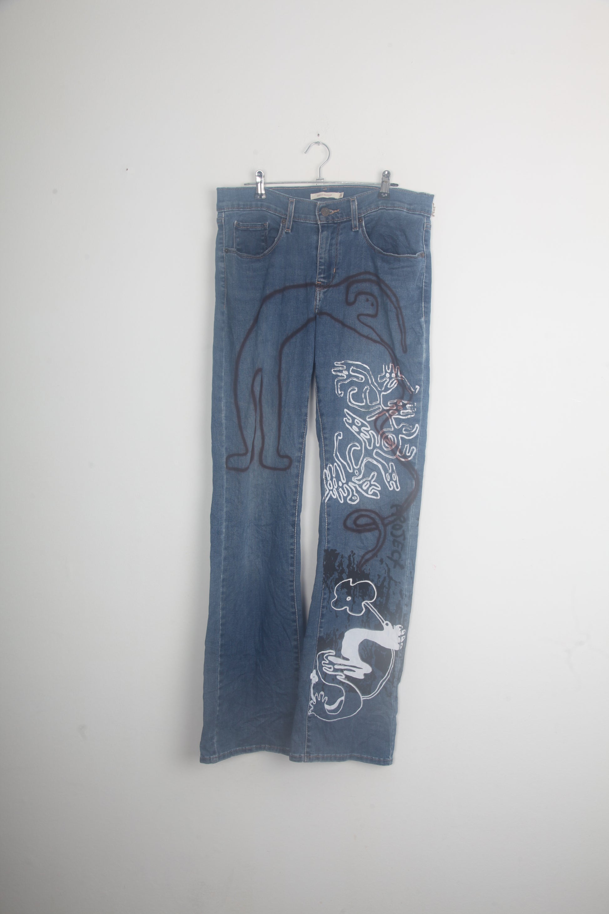 Curvy bootcut blue vintage Levi's jeans upcycled using screen-prints, airbrush.