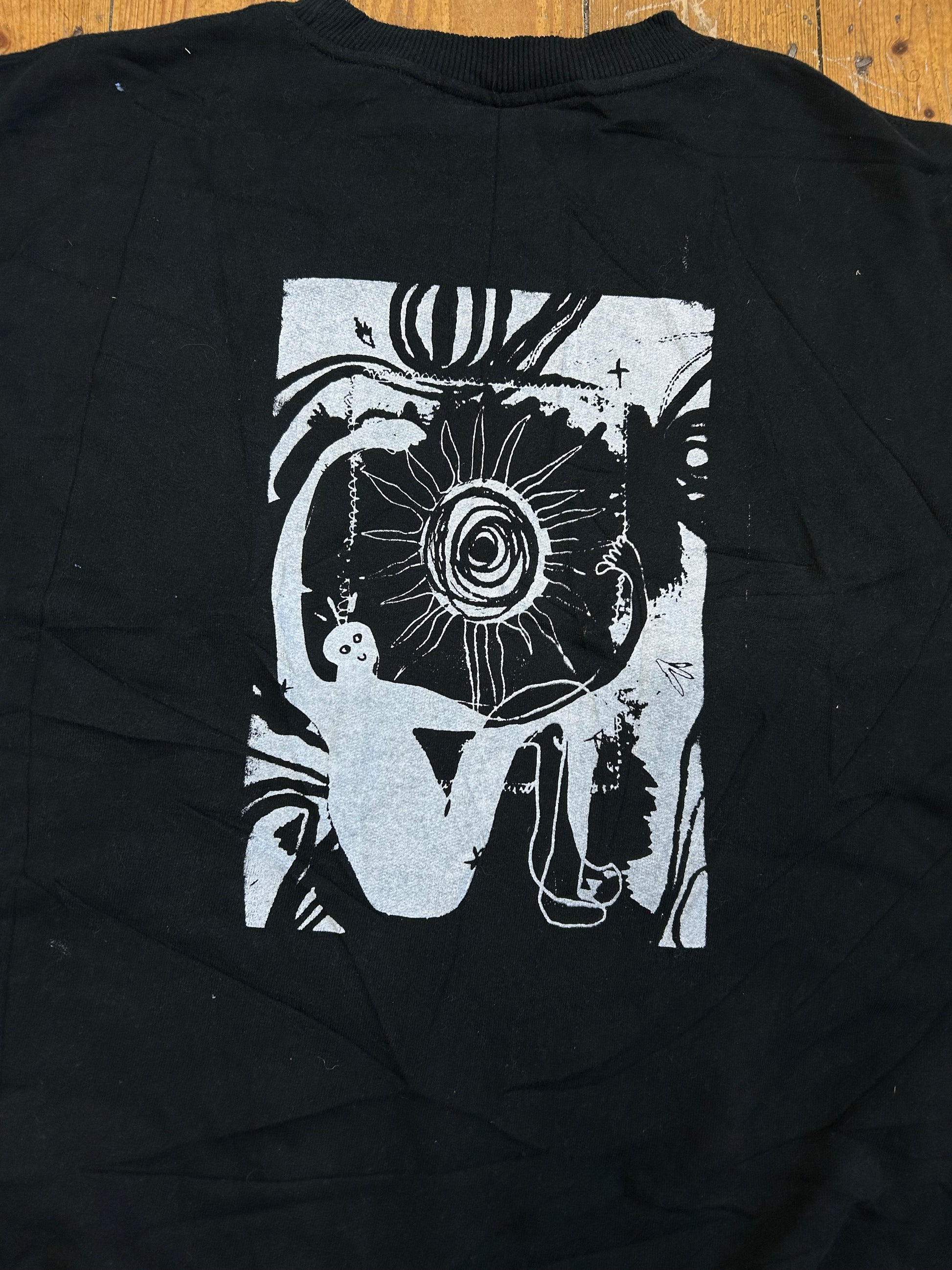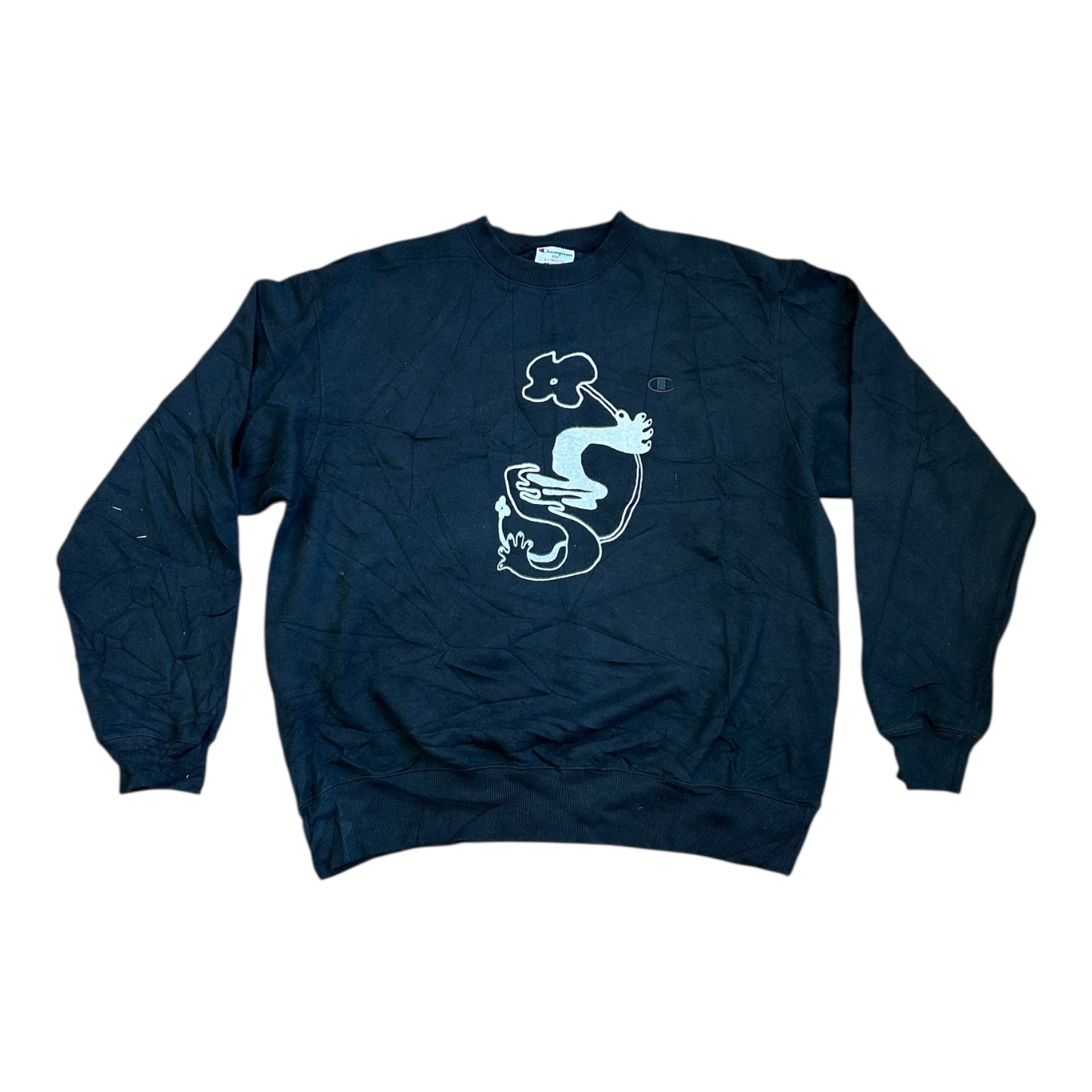 Pre-loved Reworked Vintage black Champion pullover jumper with unique airbrush and screen-print designs.