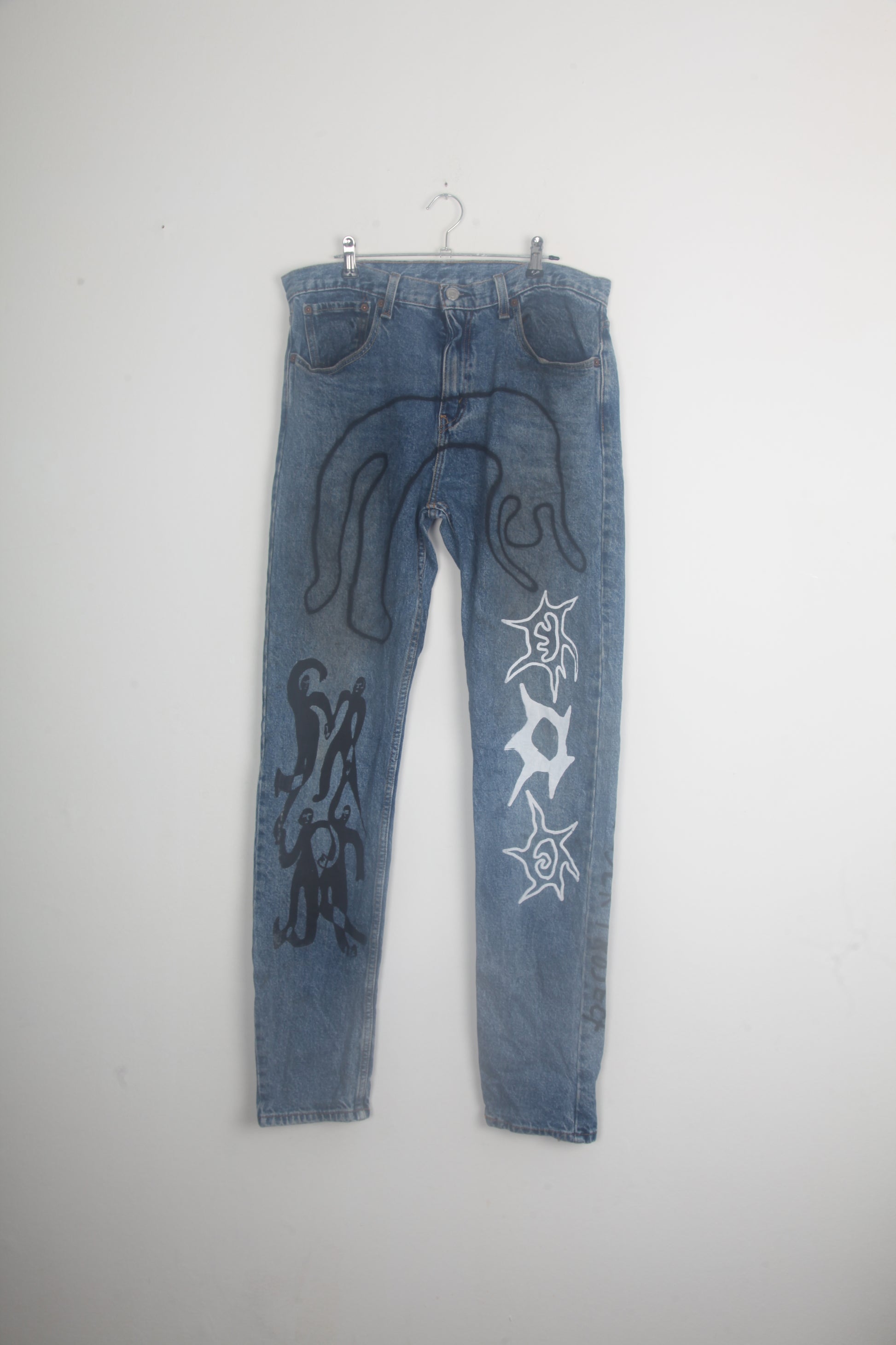Straight leg blue vintage Levi's jeans upcycled using screen-prints, airbrush.