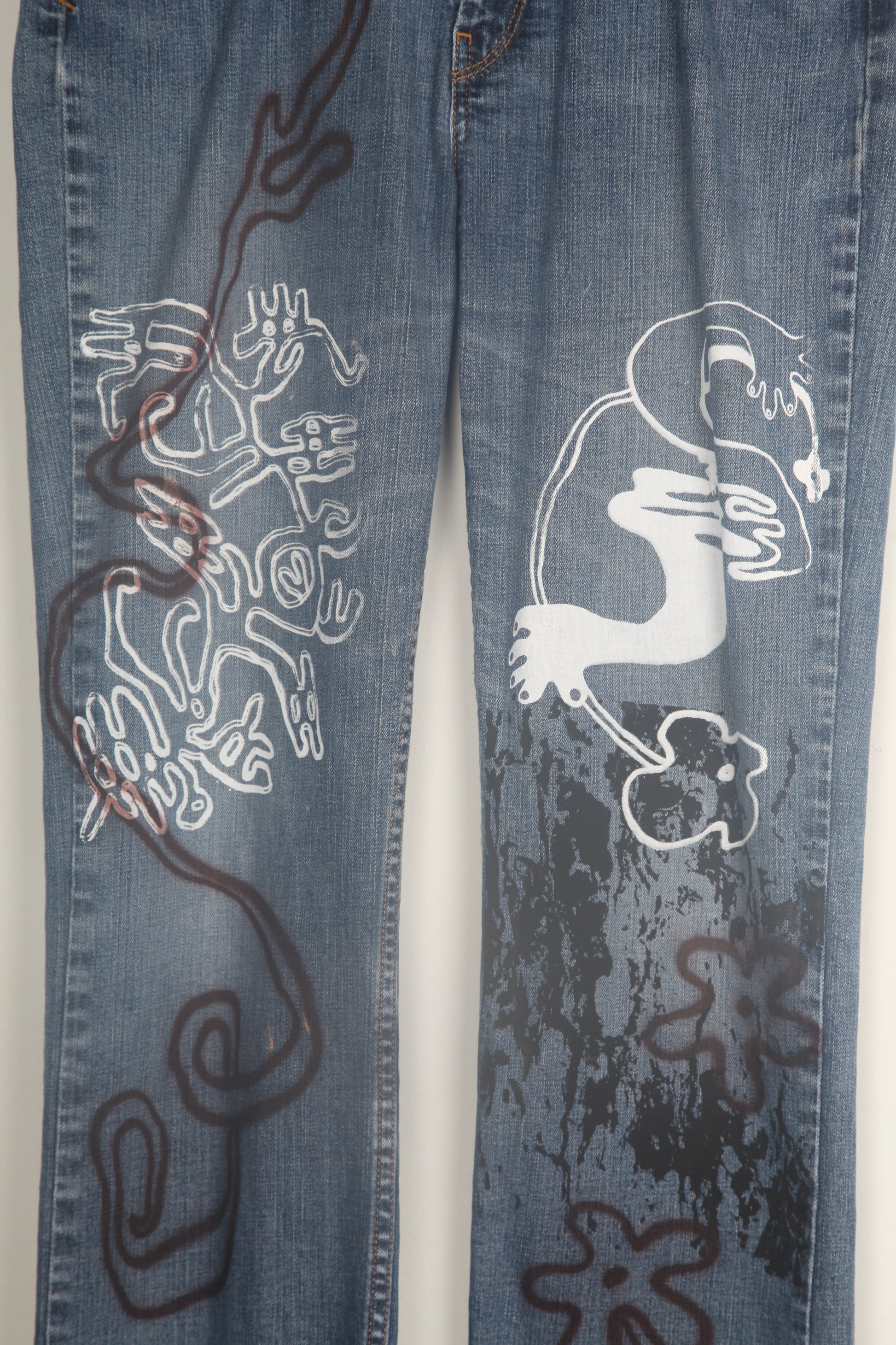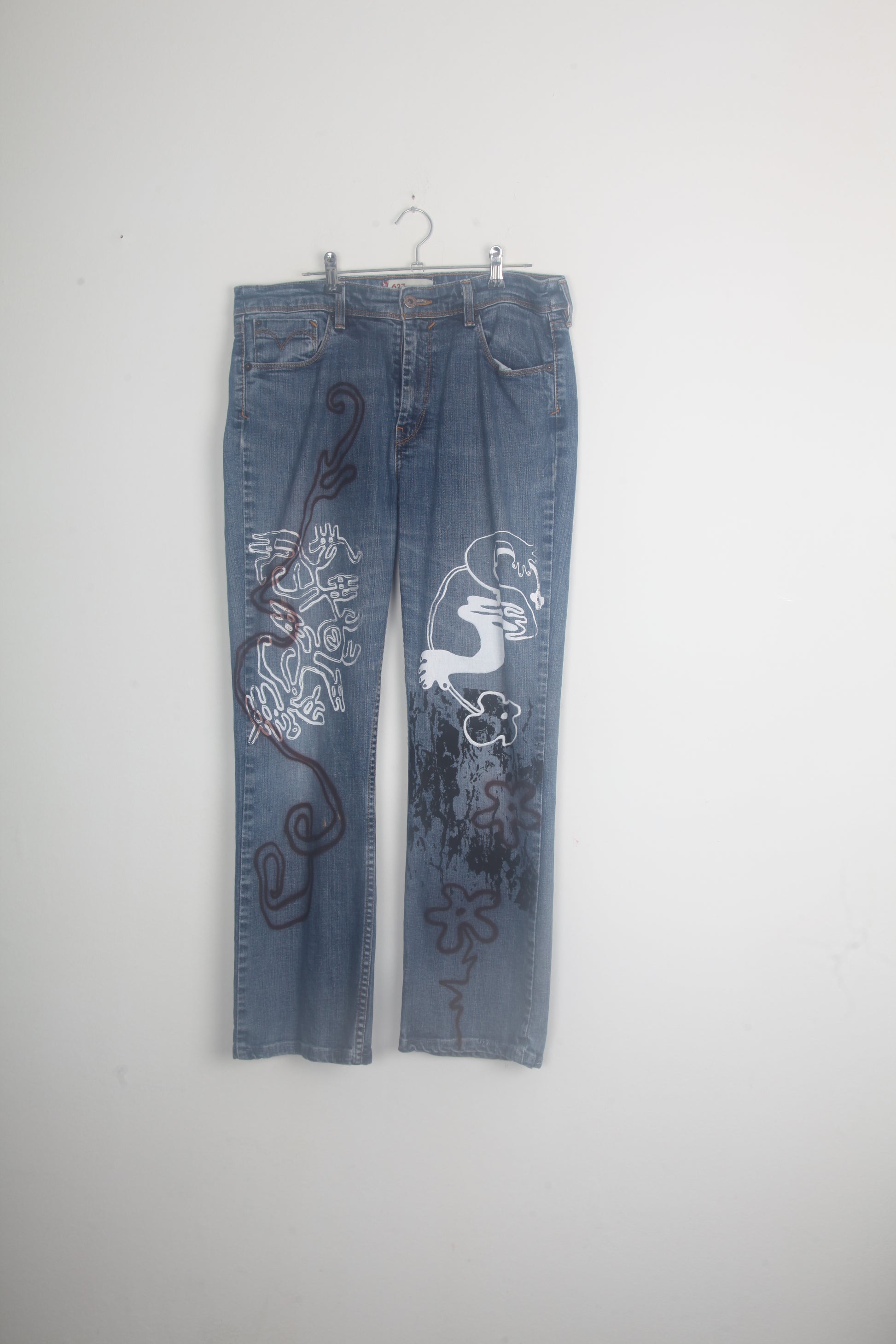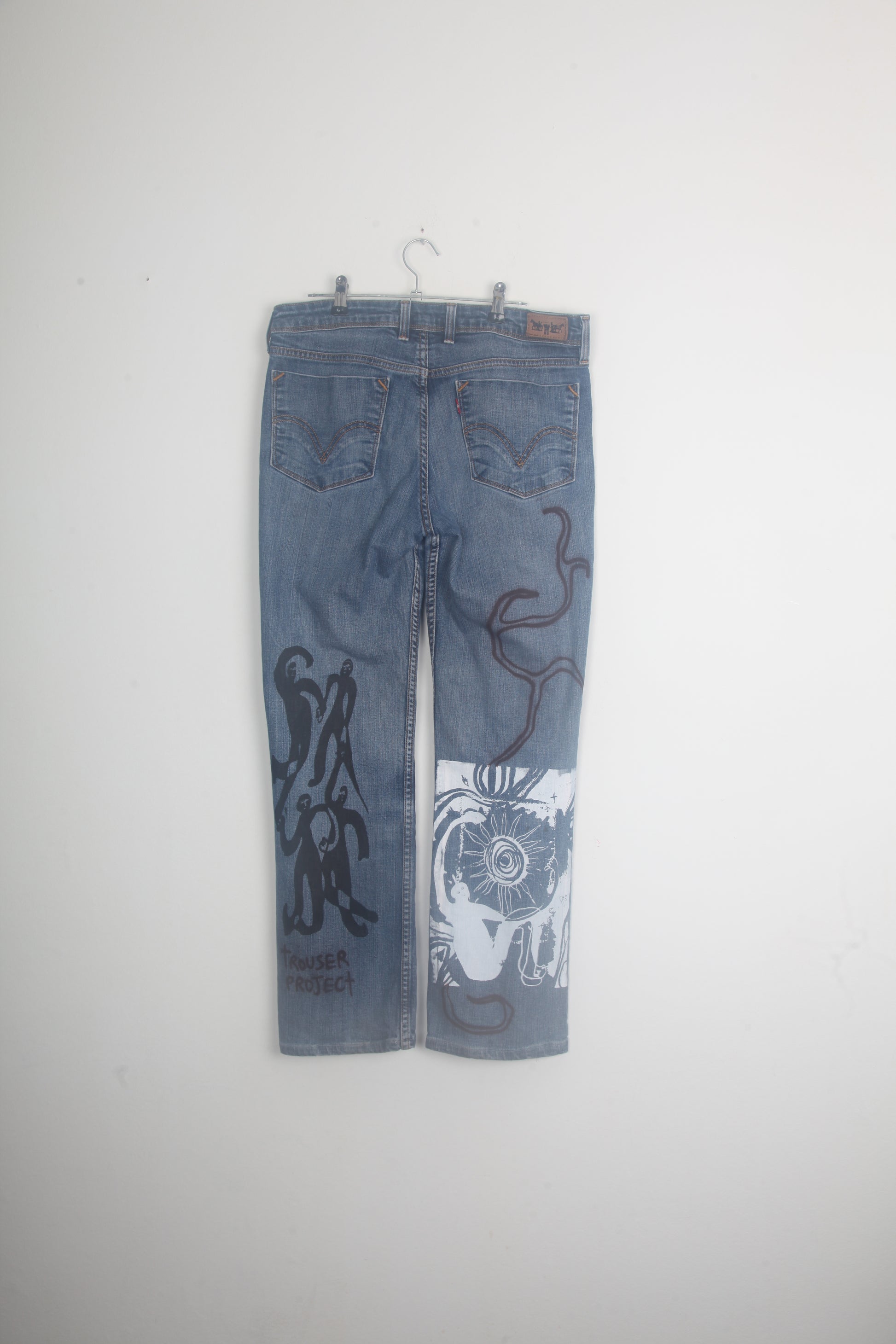 Straight leg blue vintage Levi's jeans upcycled using screen-prints, airbrush.