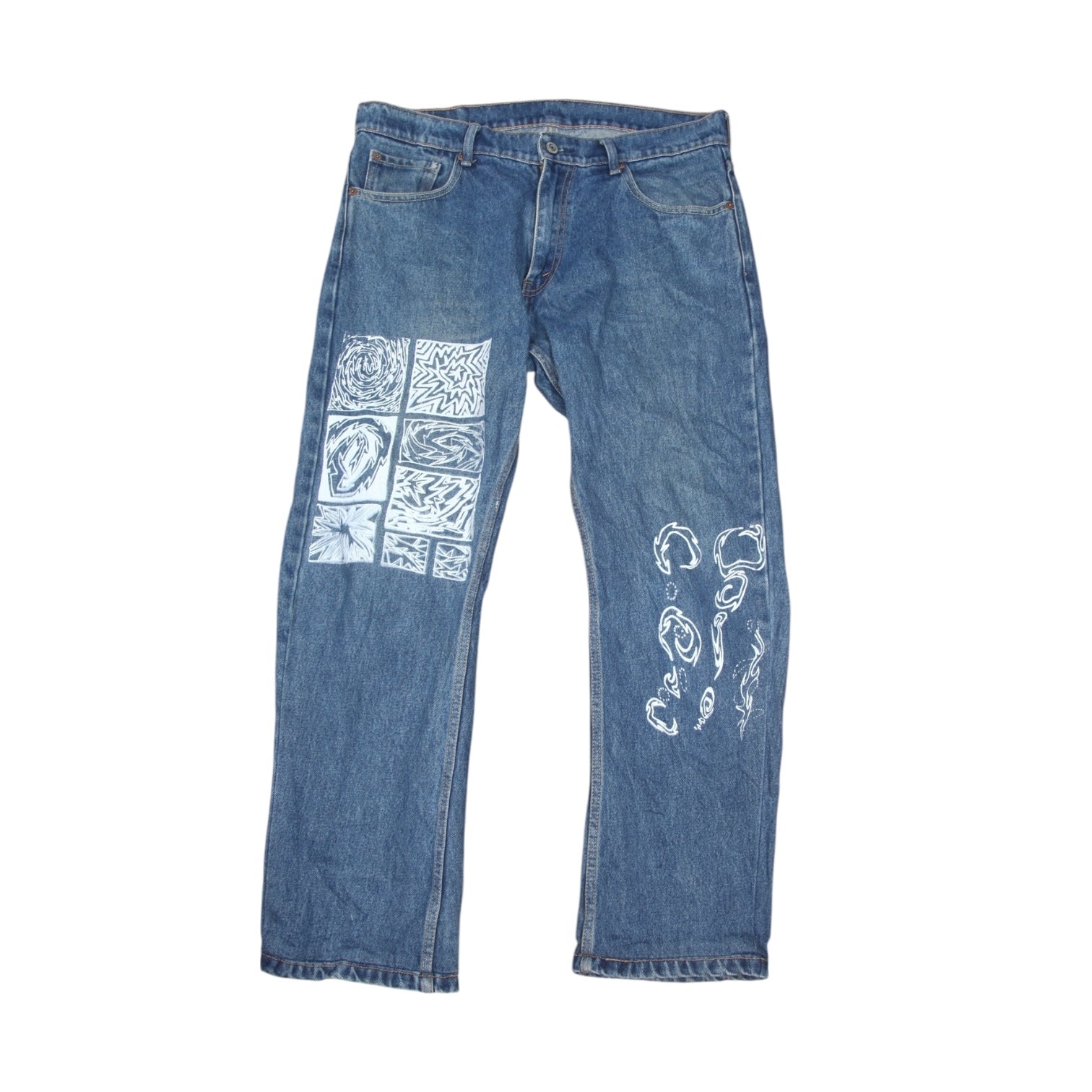 Classic vintage Levi’s blue denim jeans straight leg, reworked with bold screen-prints and freehand airbrush details. Sustainable, hand printed, and one-of-a-kind.