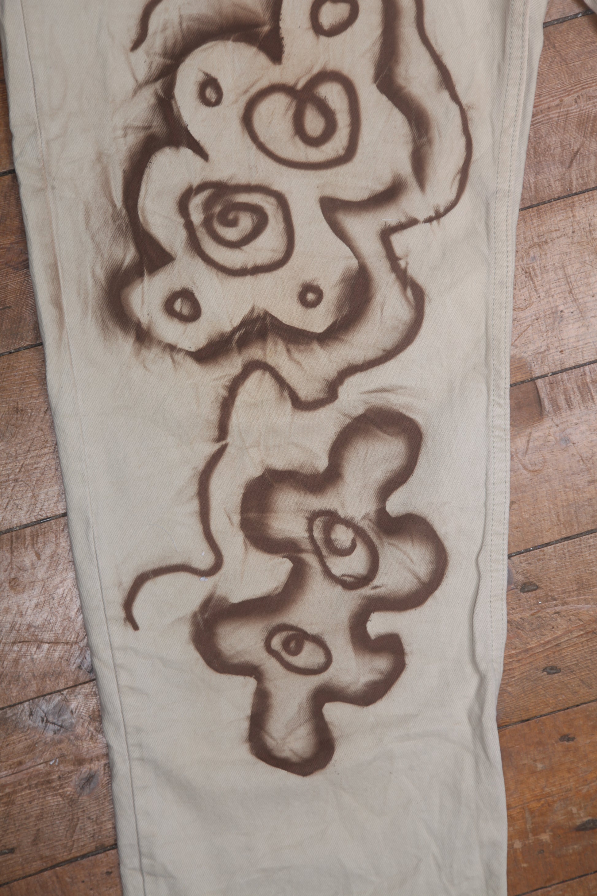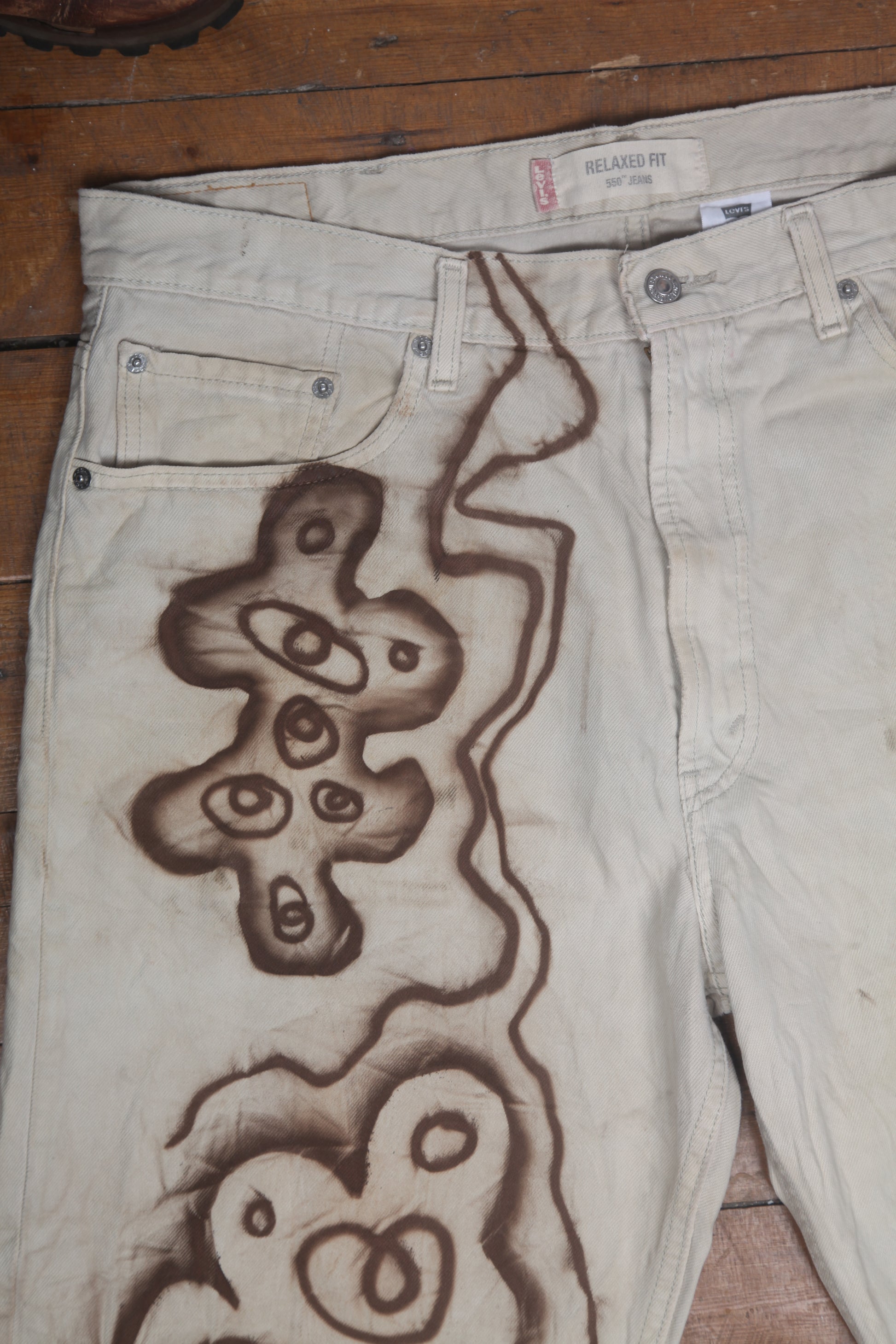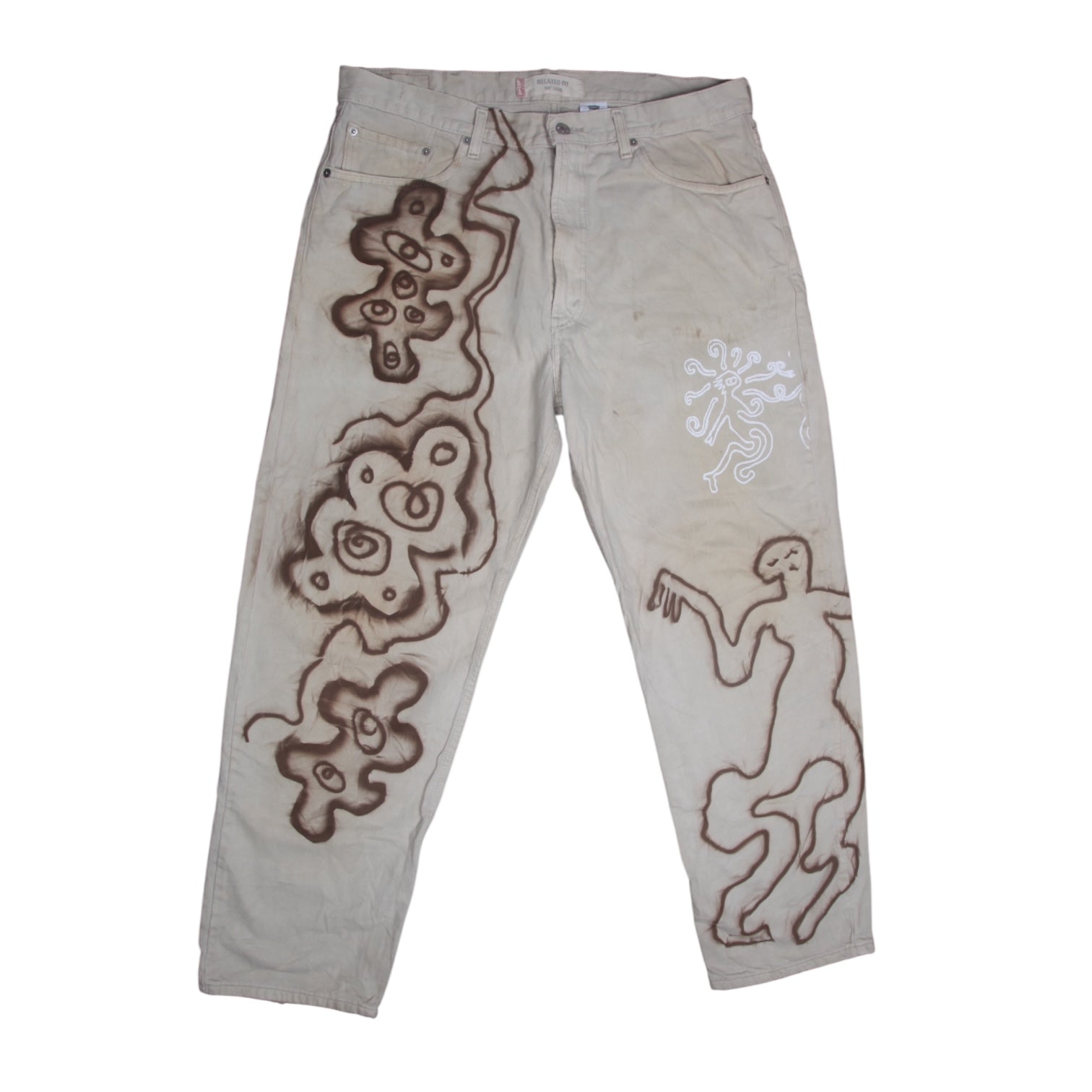 Vintage Levi's cream jeans upcycled with funky airbrush and screen-print designs, 1of1 item. Straight leg, baggy, unisex.
