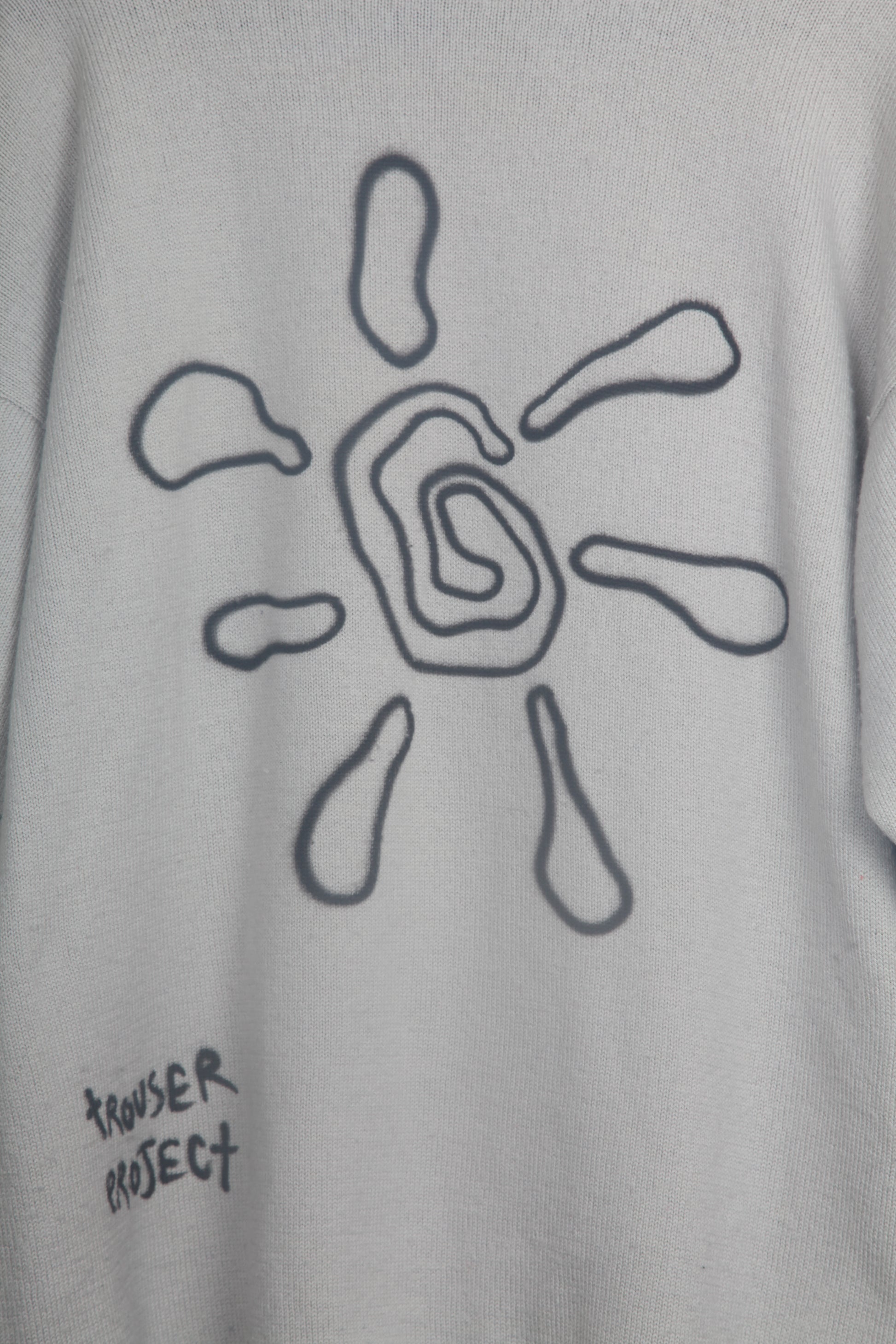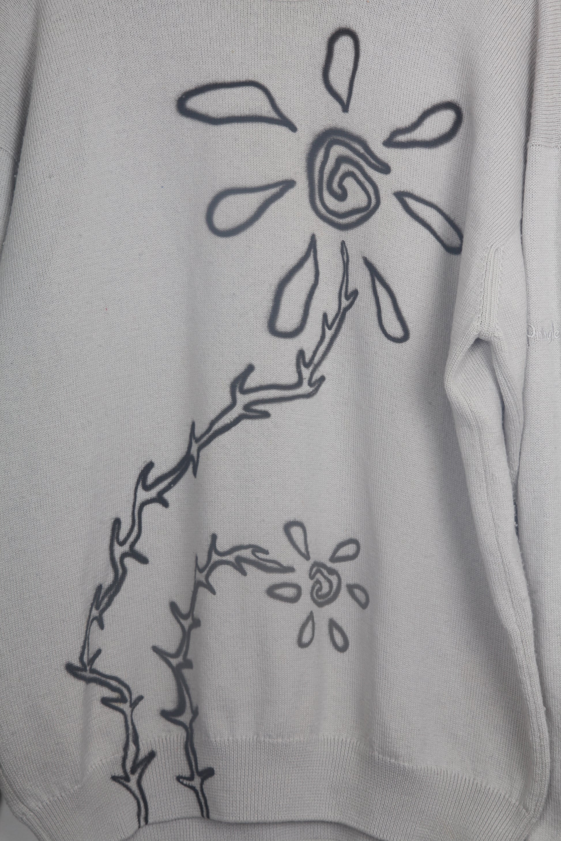 Preloved Pringle merino wool light grey jumper upcycled to cover stains with unique bold airbrush designs.