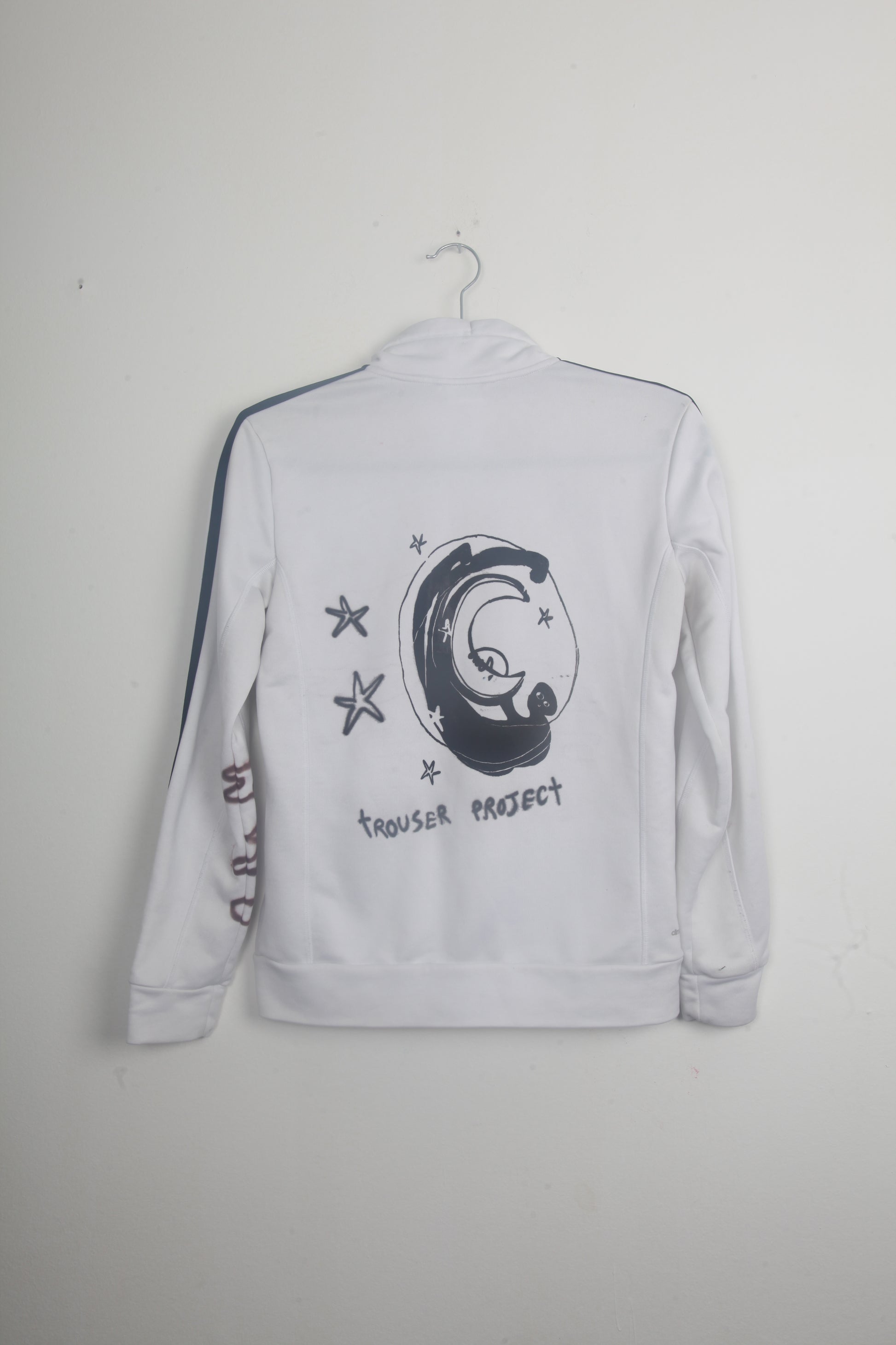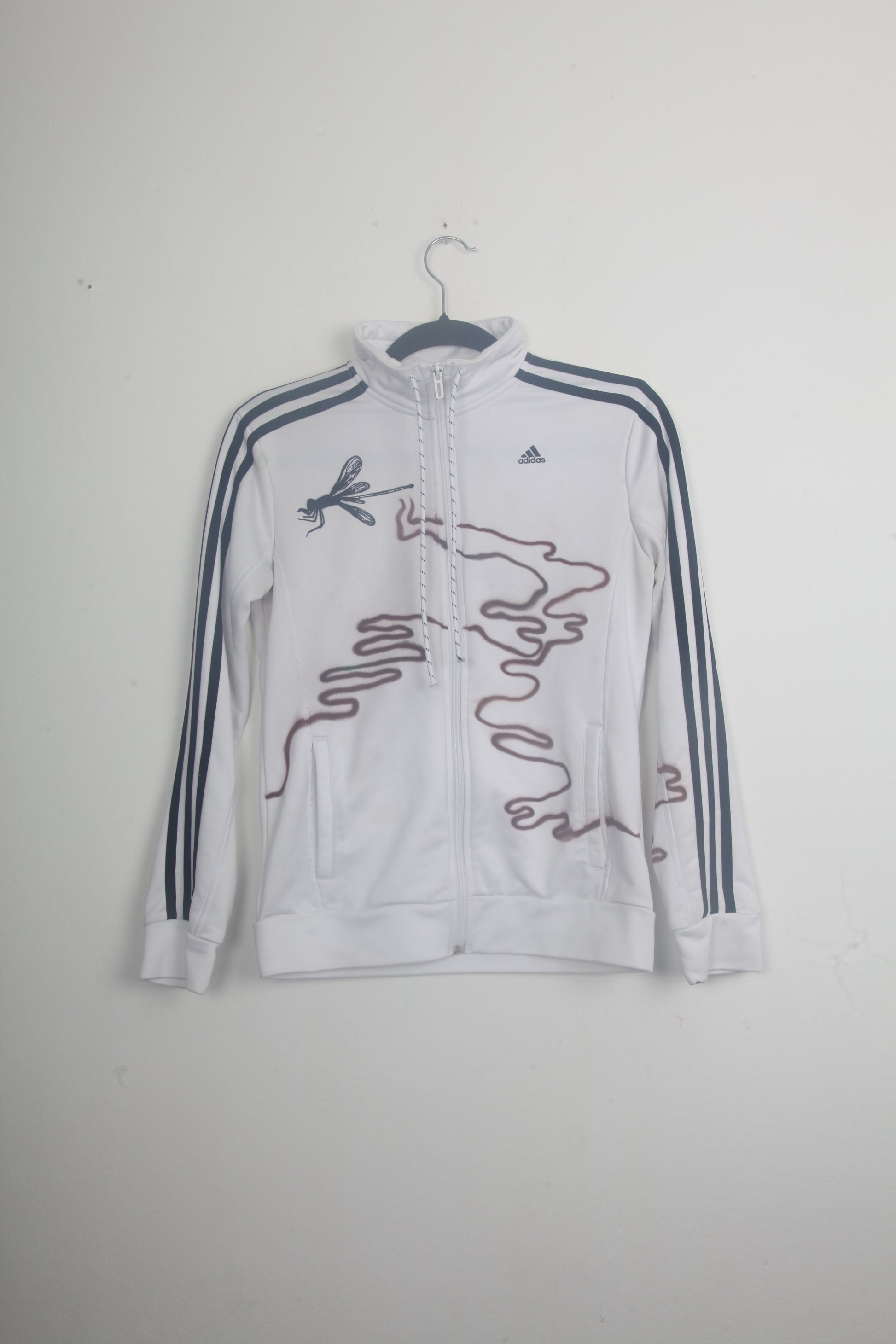 Preloved upcycled white Adidas zip up jumper with unique 1of1 airbrush and screen-print designs.